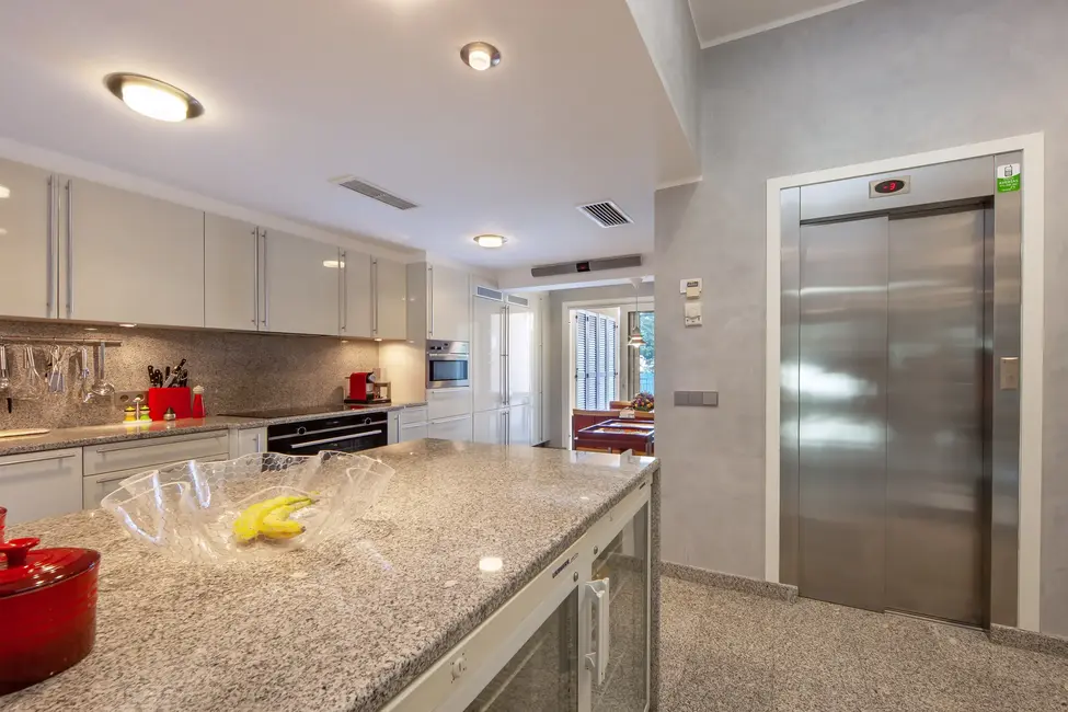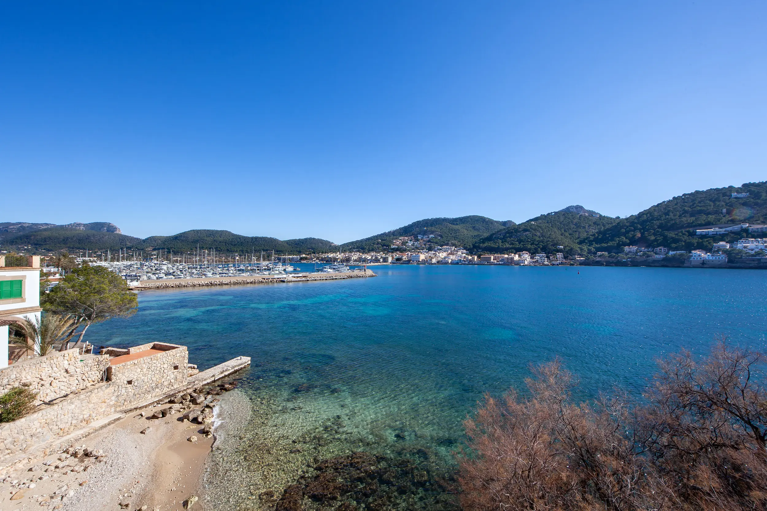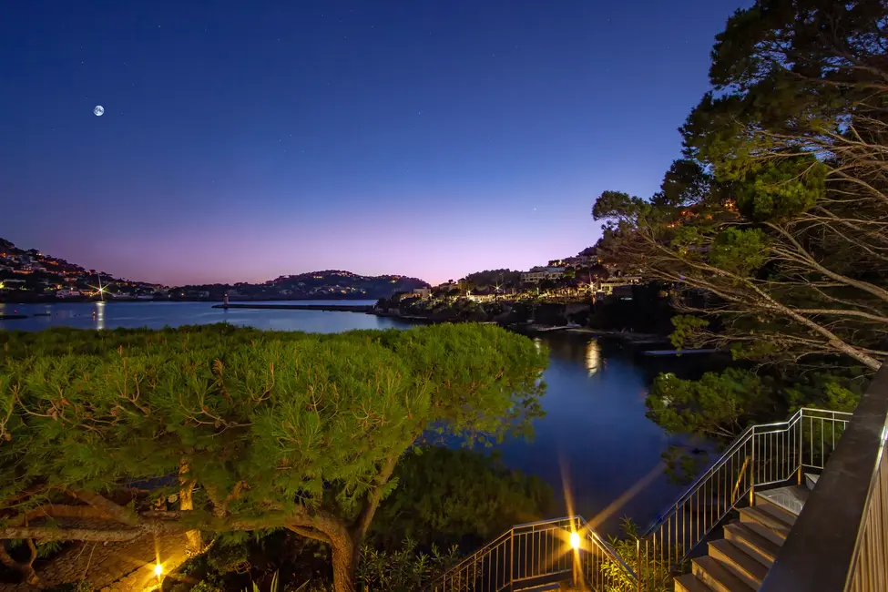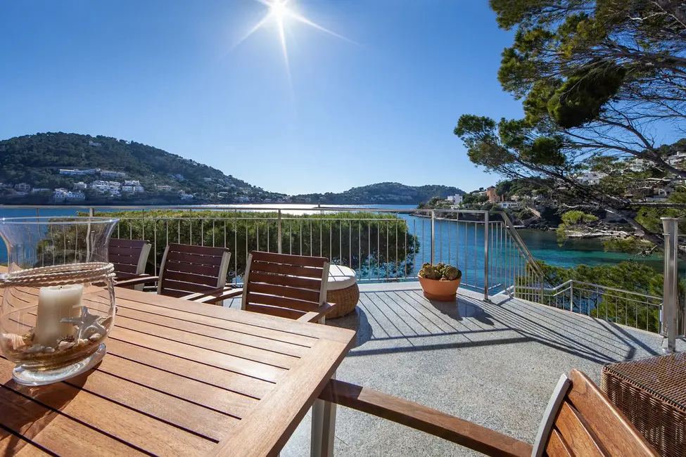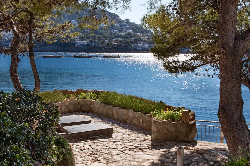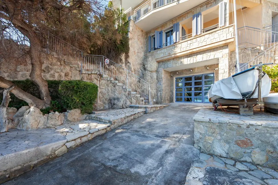 This impressive villa, located on the natural harbor of Port Andratx near the renowned yacht club "Club de Vela," is situated on a 927 m² plot directly on the coast. Restaurants, boutiques, and shops for daily needs are within walking distance. The property is characterized by its Mediterranean architectural style and extends over four levels, all conveniently connected by an elevator. The upper level offers a spacious living room with adjoining panoramic terrace, a separate dining room, a fully equipped kitchen, an office with conference area, a guest WC, and an independent guest apartment. One level below are three bedroom suites, a cinema room with its own bar, and a wine cellar, in addition to various terraces offering outstanding views of the sea and the harbor.