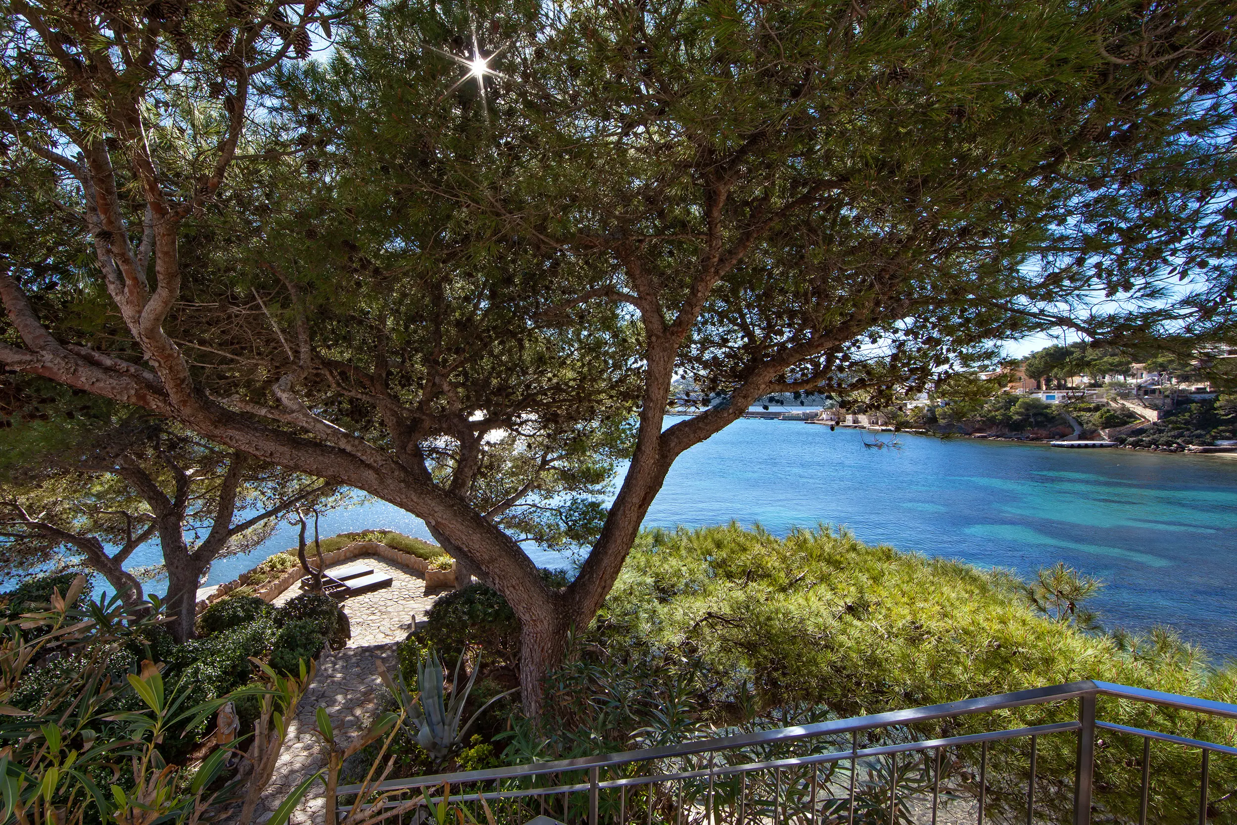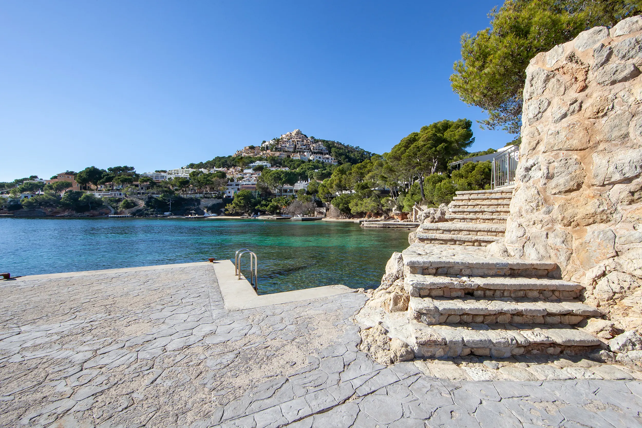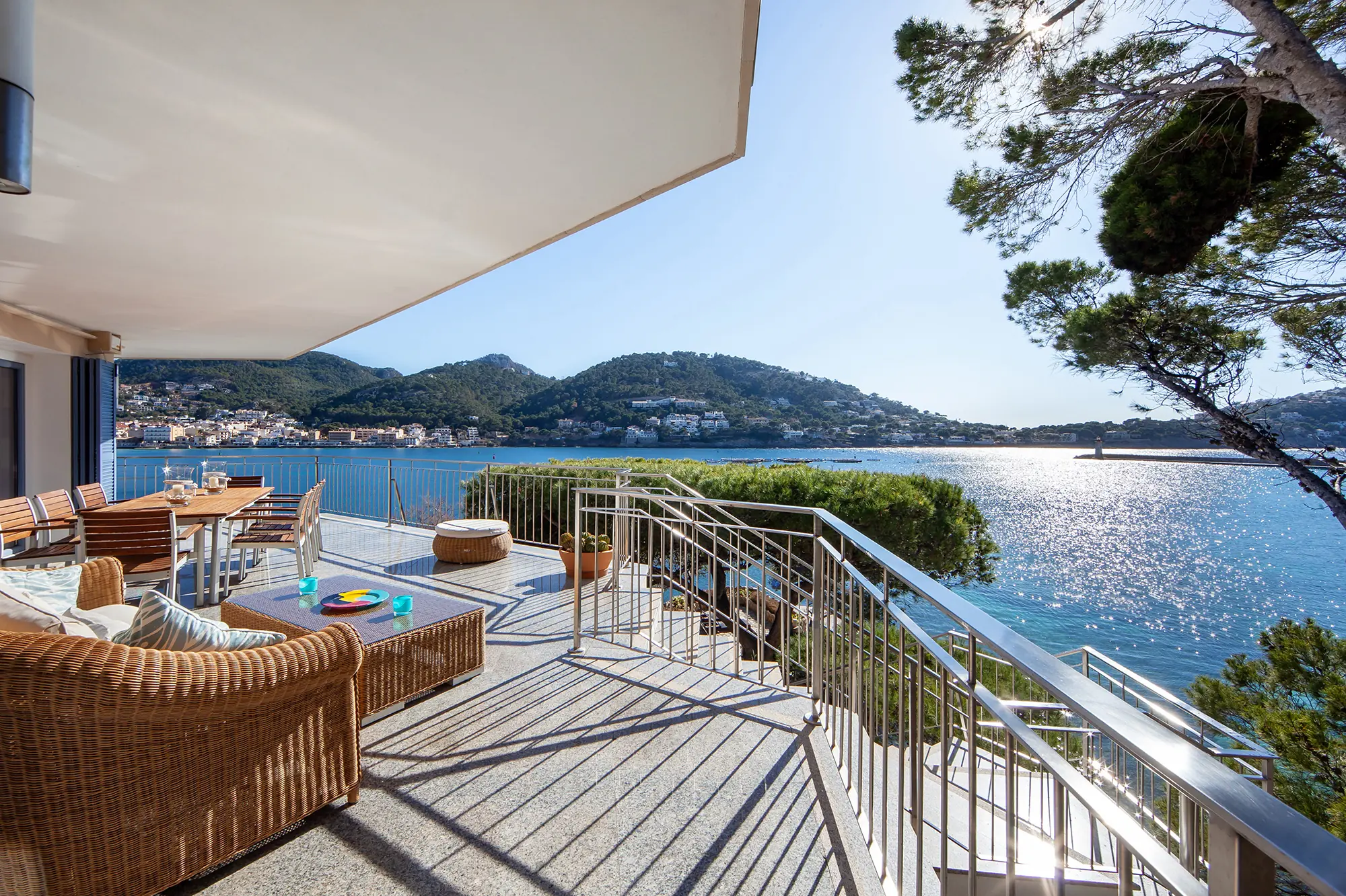 This impressive villa, located on the natural harbor of Port Andratx near the renowned yacht club "Club de Vela," is situated on a 927 m² plot directly on the coast. Restaurants, boutiques, and shops for daily needs are within walking distance. The property is characterized by its Mediterranean architectural style and extends over four levels, all conveniently connected by an elevator. The upper level offers a spacious living room with adjoining panoramic terrace, a separate dining room, a fully equipped kitchen, an office with conference area, a guest WC, and an independent guest apartment. One level below are three bedroom suites, a cinema room with its own bar, and a wine cellar, in addition to various terraces offering outstanding views of the sea and the harbor.
