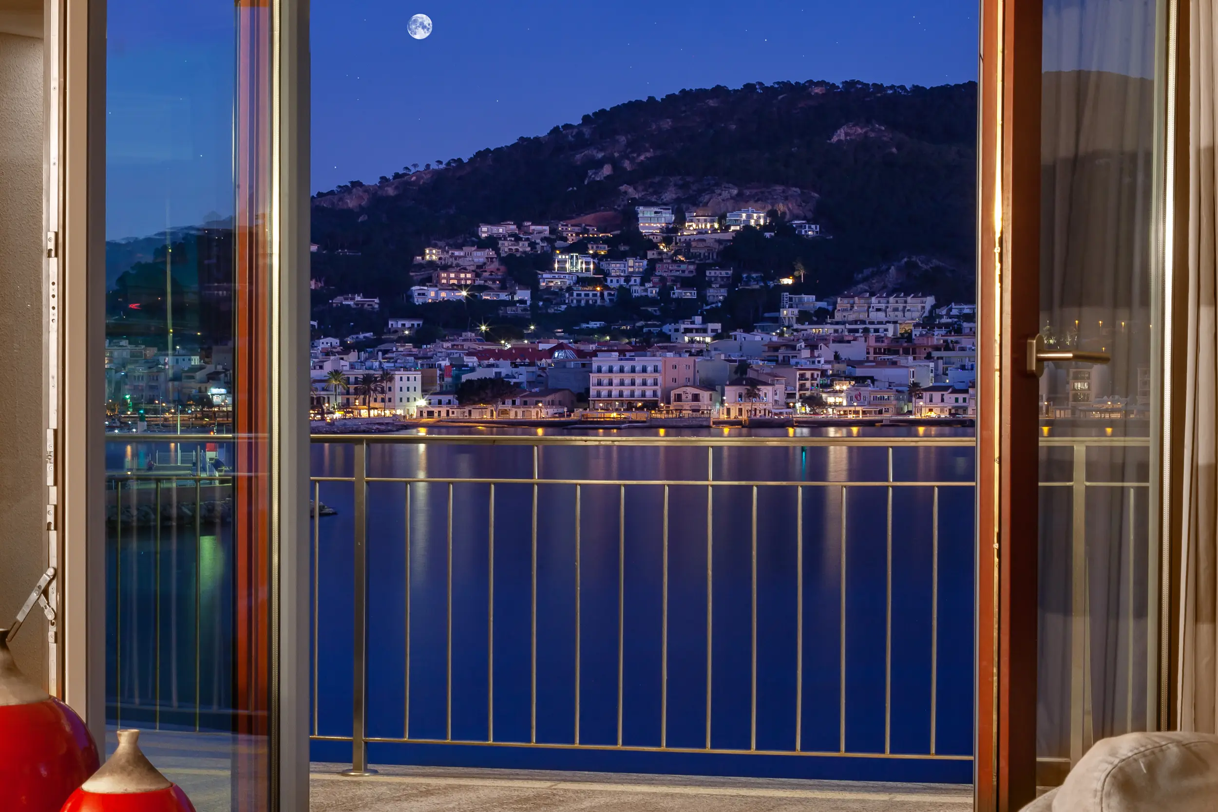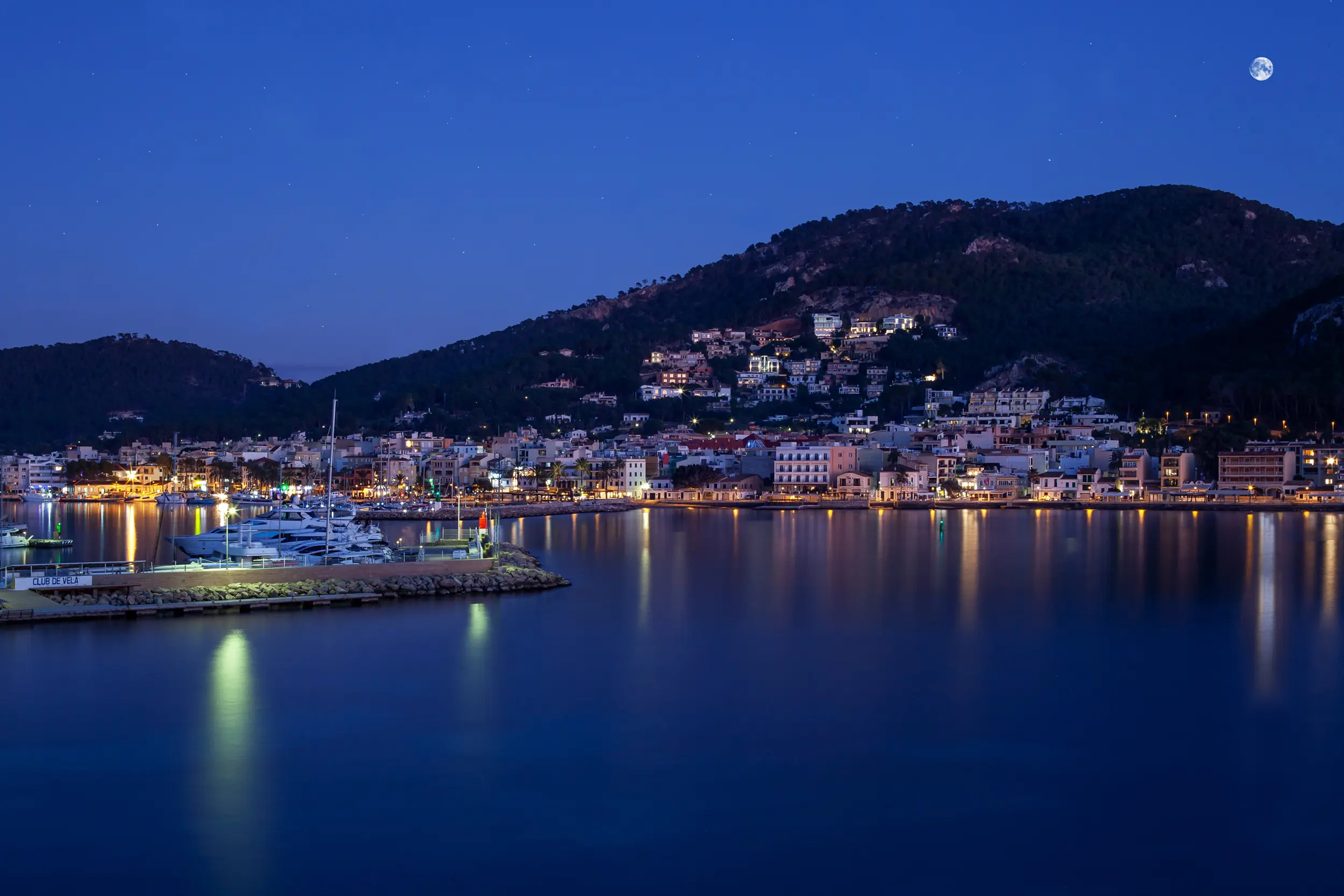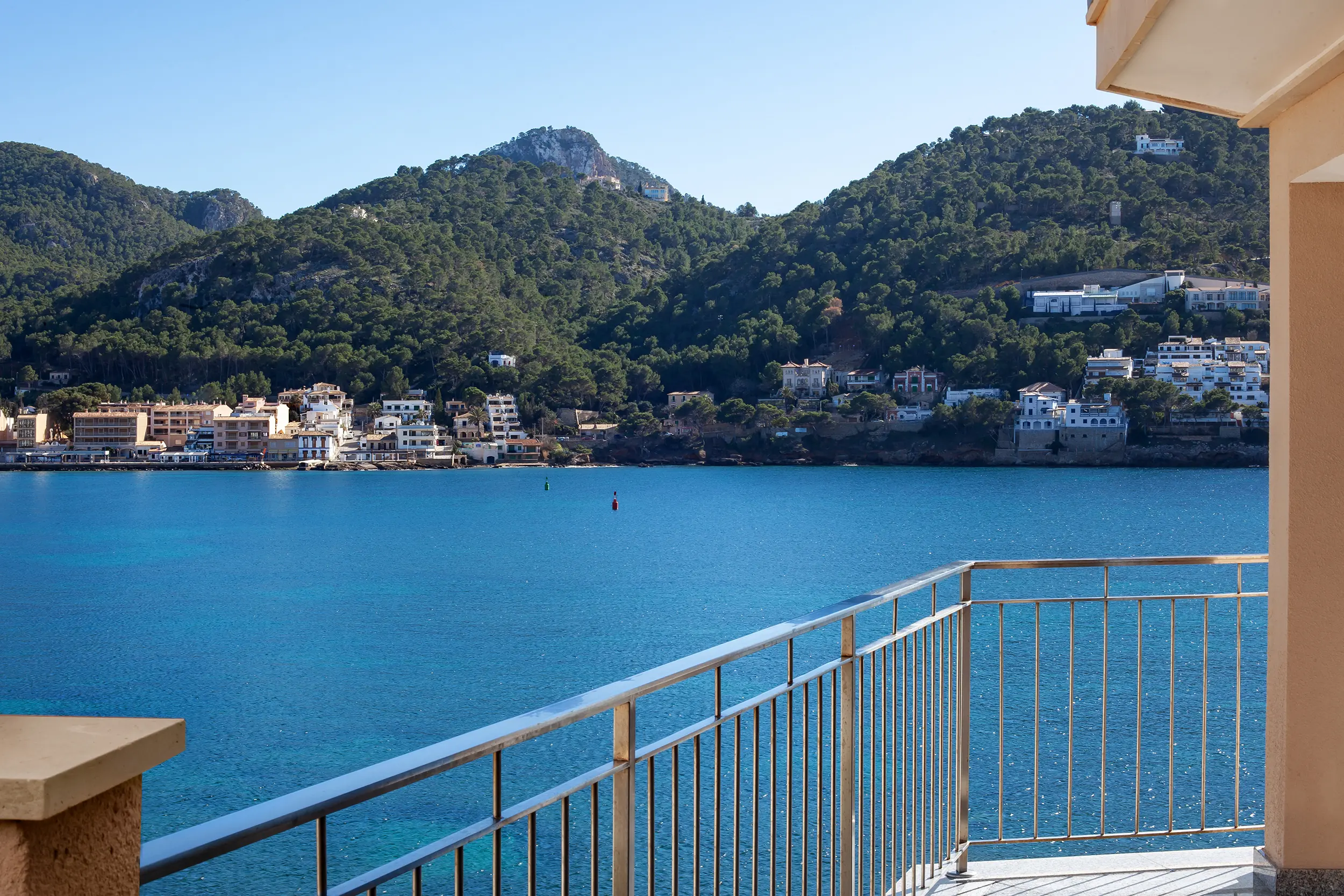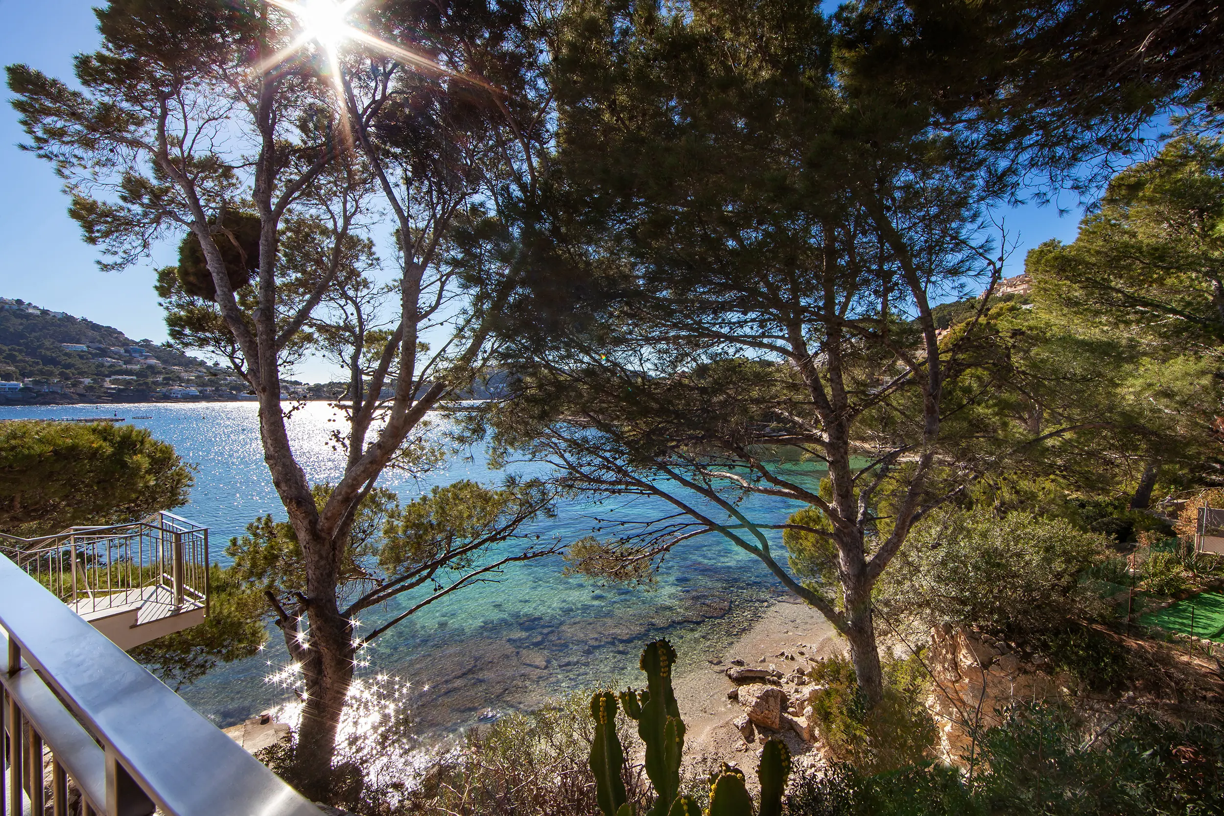 This impressive villa, located on the natural harbor of Port Andratx near the renowned yacht club "Club de Vela," is situated on a 927 m² plot directly on the coast. Restaurants, boutiques, and shops for daily needs are within walking distance. The property is characterized by its Mediterranean architectural style and extends over four levels, all conveniently connected by an elevator. The upper level offers a spacious living room with adjoining panoramic terrace, a separate dining room, a fully equipped kitchen, an office with conference area, a guest WC, and an independent guest apartment. One level below are three bedroom suites, a cinema room with its own bar, and a wine cellar, in addition to various terraces offering outstanding views of the sea and the harbor.