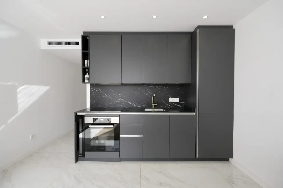 The apartment has two bedrooms with built-in wardrobes and two bathrooms, one of which is en suite. The modern, fully equipped kitchen flows seamlessly into the open-plan living and dining area and leads to a spacious terrace with barbecue facilities, which floods the space with natural light. At the rear is an intimate courtyard that provides a touch of tranquility. The apartment is sold furnished and has a storage room and underground parking.