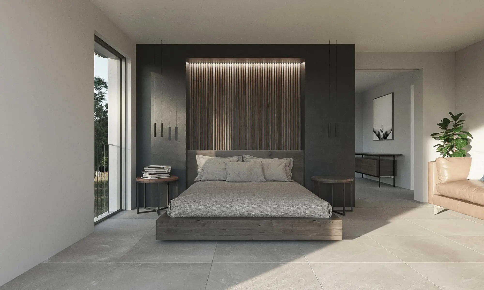 The upper floor features the master bedroom with en-suite bathroom and dressing room, as well as two further bedrooms, each with its own bathroom. A large terrace extends the living area outdoors.