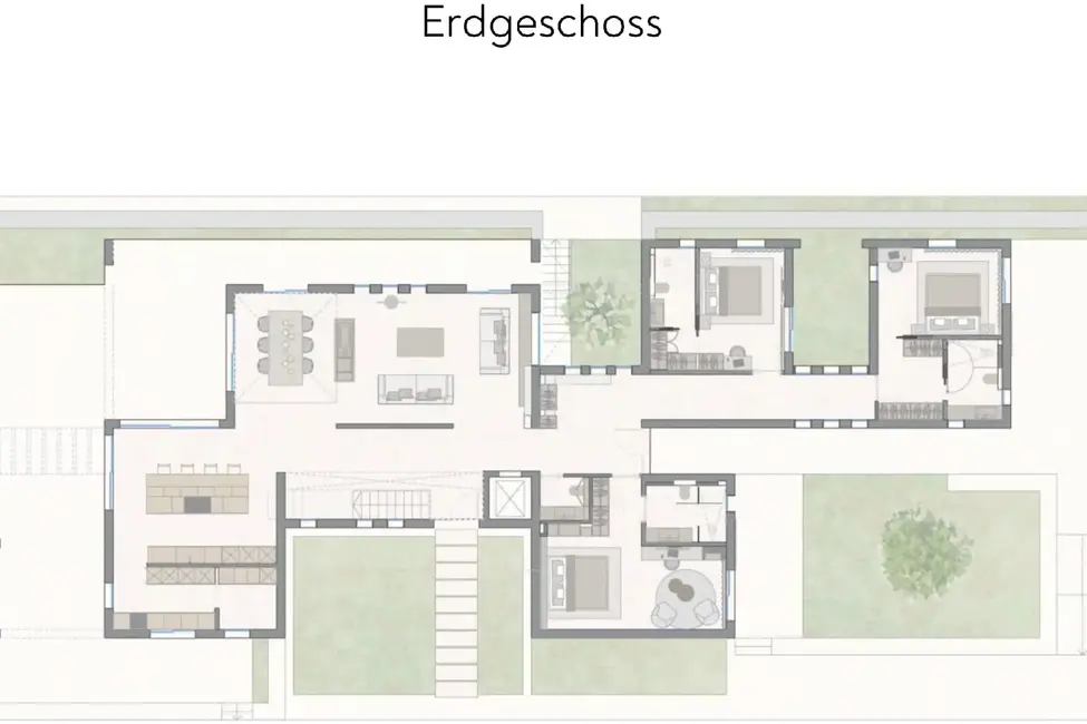 The spacious indoor and outdoor areas invite you to enjoy the Mediterranean lifestyle to the fullest. Light, natural shades of white and beige, complemented by green accents, reflect the surrounding landscape and create an open, inviting atmosphere.