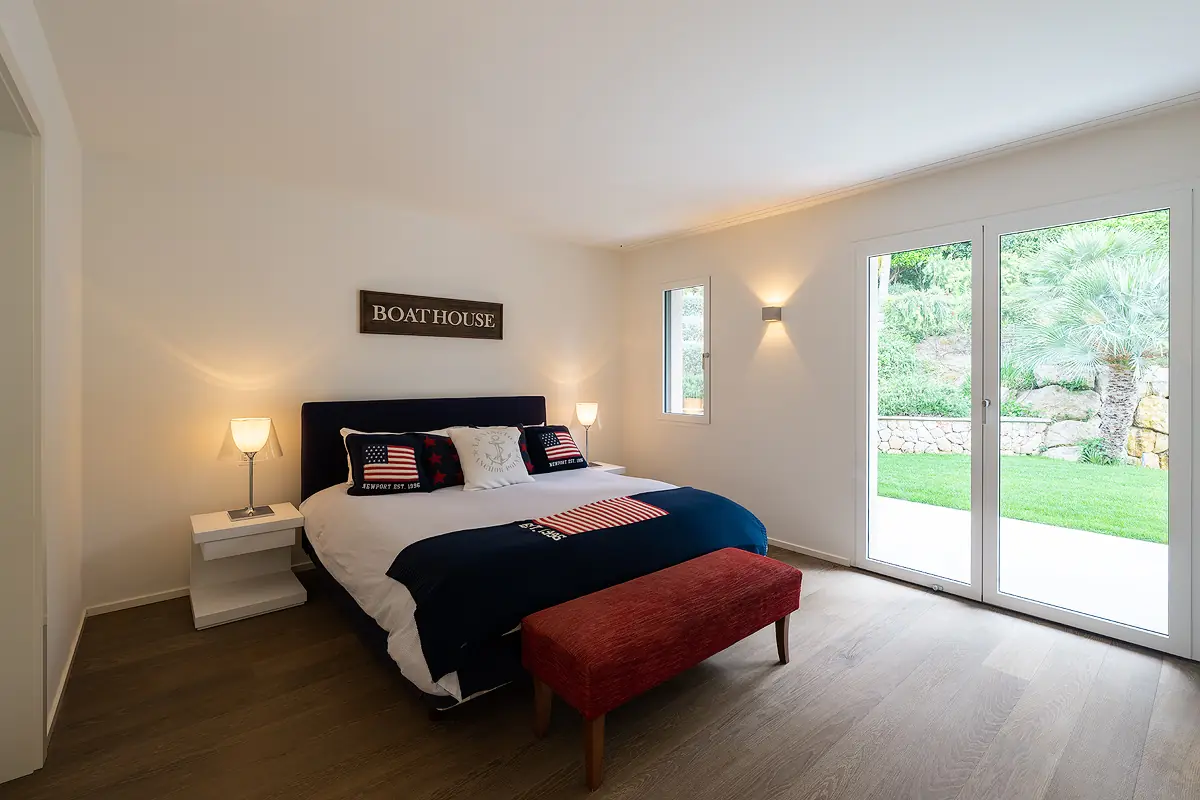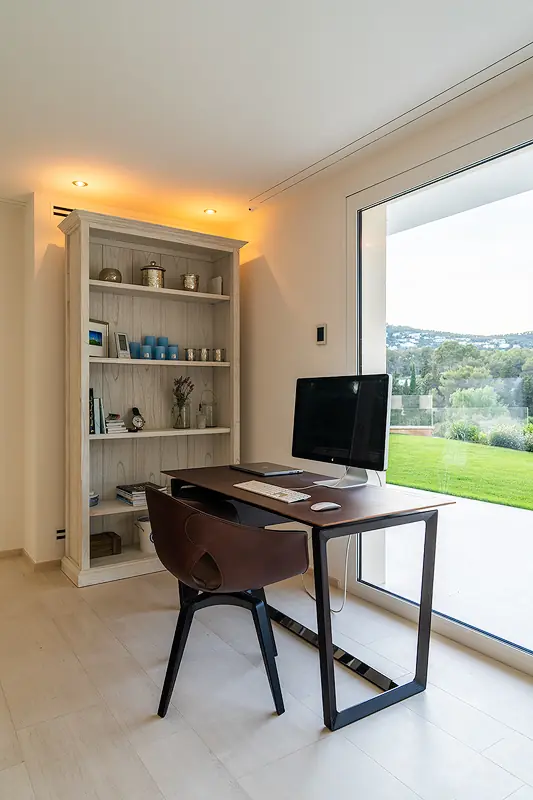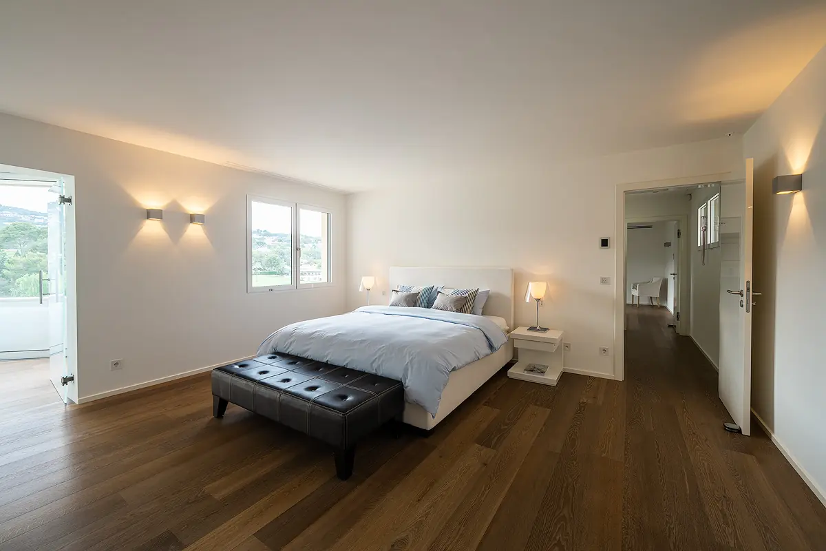 The upper floor features the master bedroom with dressing area and an additional guest bedroom, both with en suite bathrooms. The entire villa is equipped with state-of-the-art technology, including underfloor heating powered by a heat pump, air conditioning, a Sonos sound system, and a domotic system.