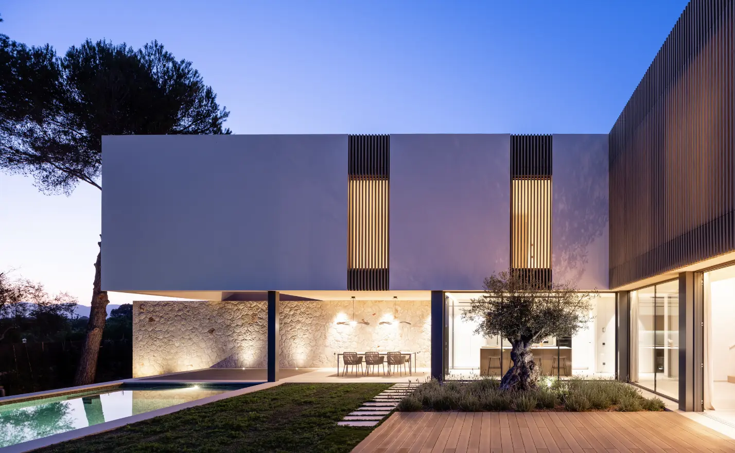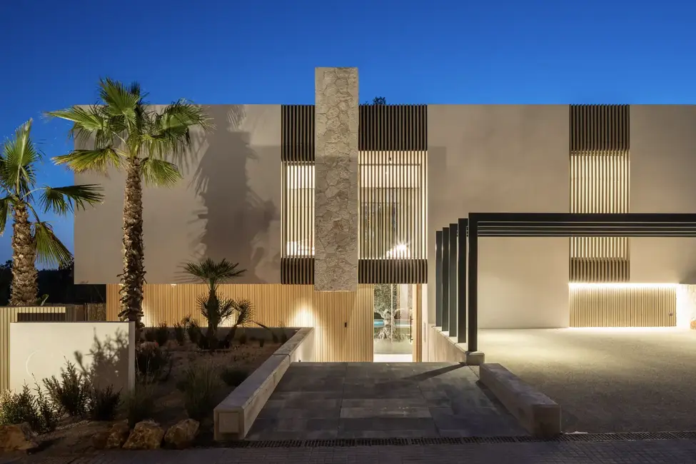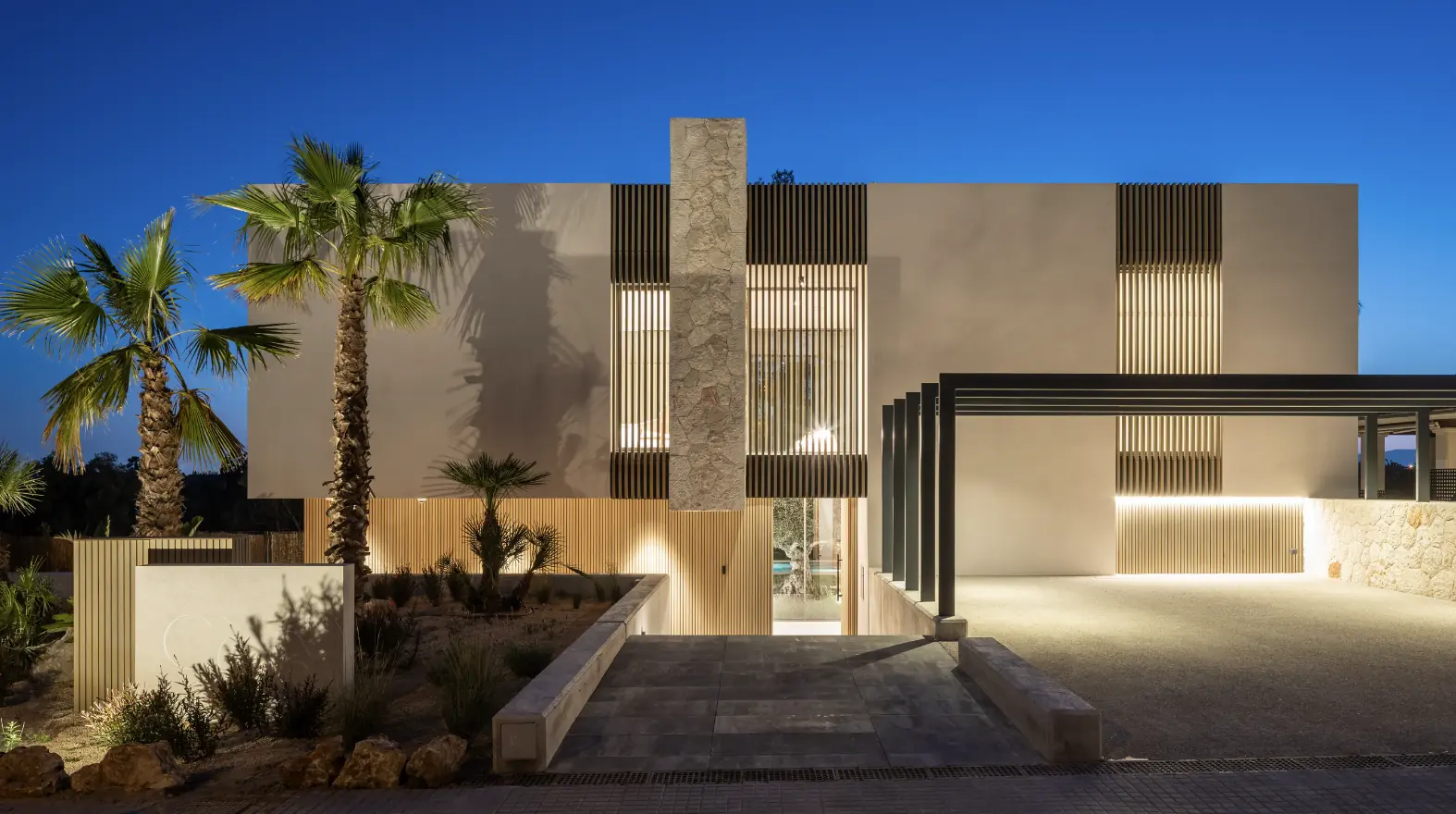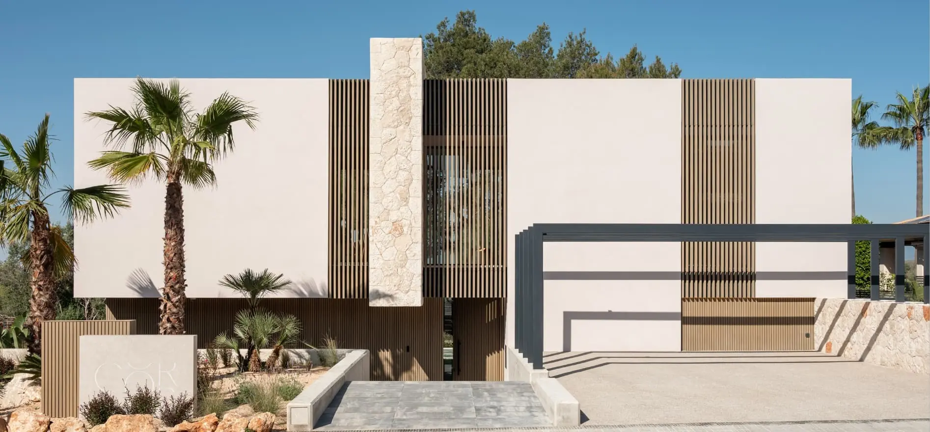 Project COR is a modern villa in the cubist style, located in the up-and-coming residential area of San Marçal (municipality of Sa Cabaneta / MarratxÃ), just 10 minutes from Palma de Mallorca. The design combines earthy tones, natural materials, and wooden façade elements to blend harmoniously into the Mediterranean surroundings.