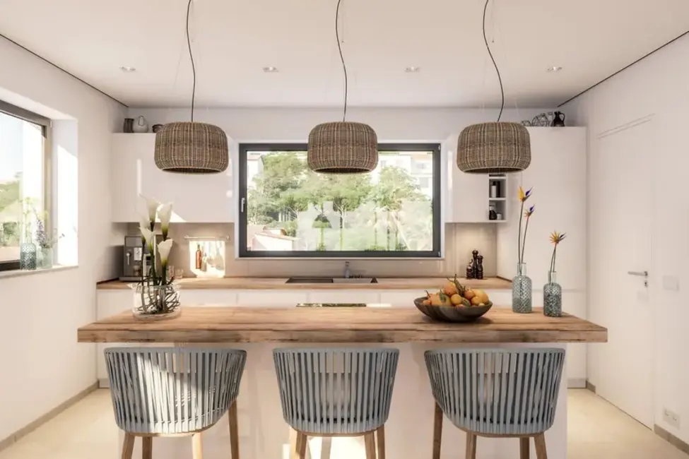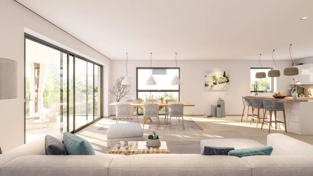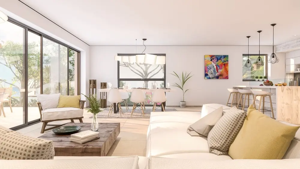 The modern complex offers a harmonious blend of Mediterranean architecture, contemporary living concepts, spacious outdoor areas, and panoramic views—some of which extend to the sea. The apartments are spread across a garden level, two upper floors, and a penthouse with a private roof terrace.