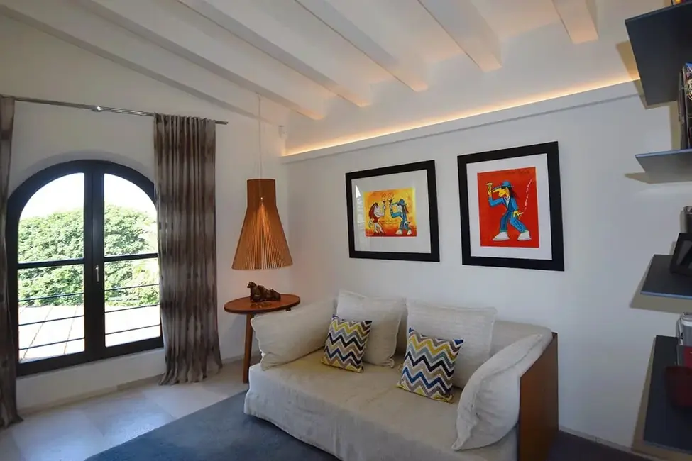 The upper floor features the master bedroom with en suite bathroom and another versatile room, currently used as a library, which also has its own bathroom. The master area opens onto a spacious private terrace with breathtaking panoramic views of the mountains and sea.
