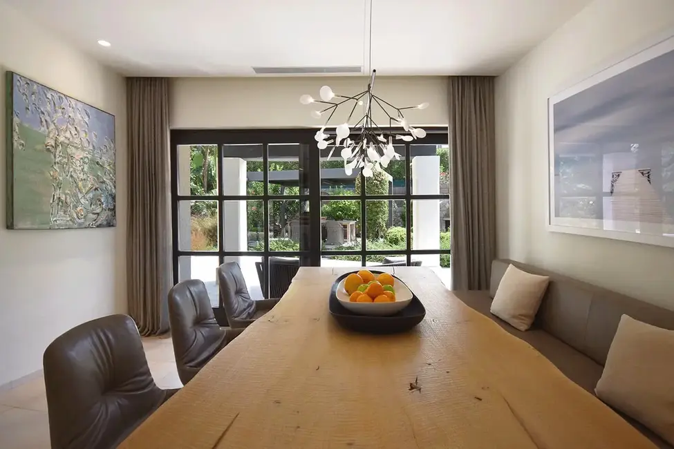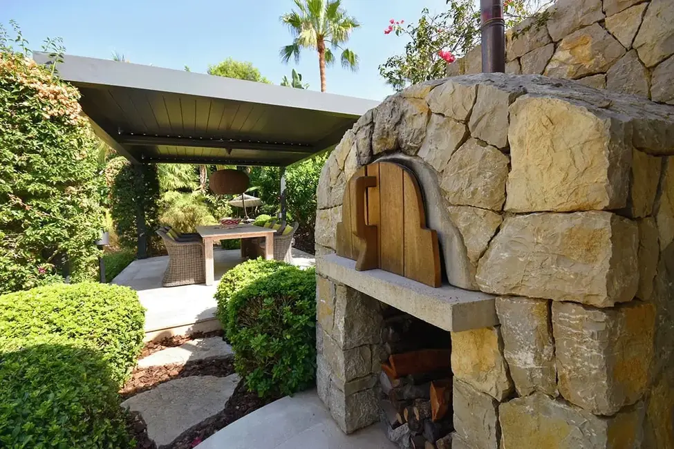 The front outdoor area is generously proportioned, offering several sunbathing areas around the pool, an outdoor shower, and inviting you to relax at any time of day. From the ground floor, you can also access another lovingly landscaped garden behind the house. This features cozy lounge areas, a citrus garden, lush Mediterranean planting, a BBQ area, a pizza oven, and another covered outdoor dining area—perfect for convivial evenings. The atmospheric garden lighting and automatic irrigation system underline the elaborate design.