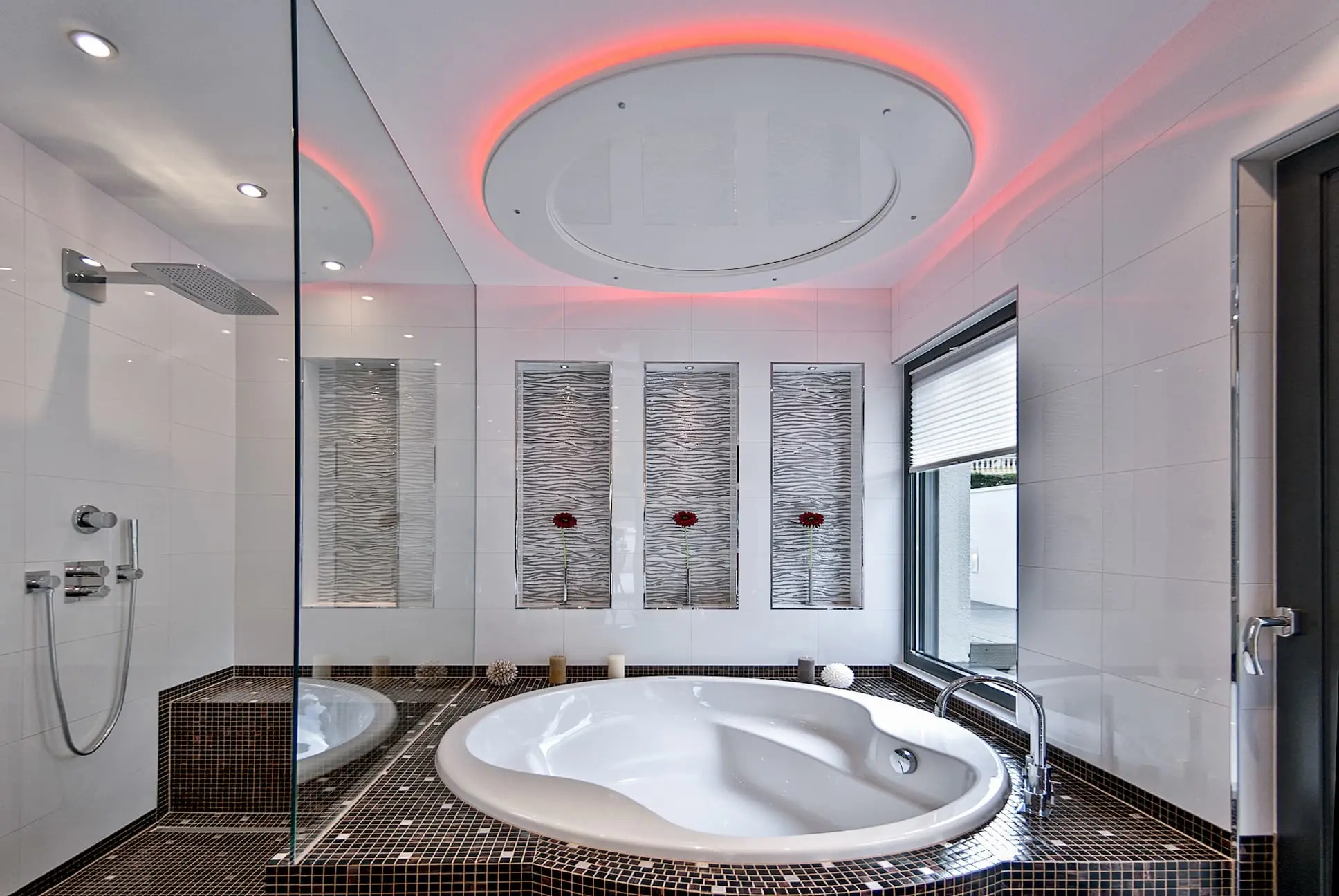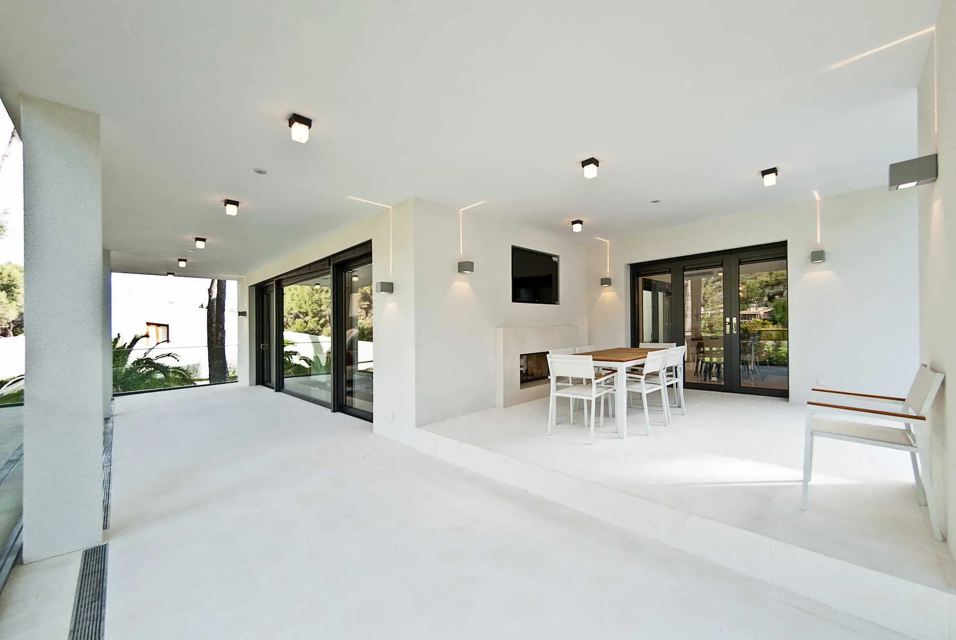 Outside, the elaborately designed landscaped garden impresses with a heated infinity pool including an overflow system, counter-current system, wellness shower, self-cleaning system, and automatic cover. A spacious BBQ area, a chill-out pavilion, and a double garage round off this excellent property.