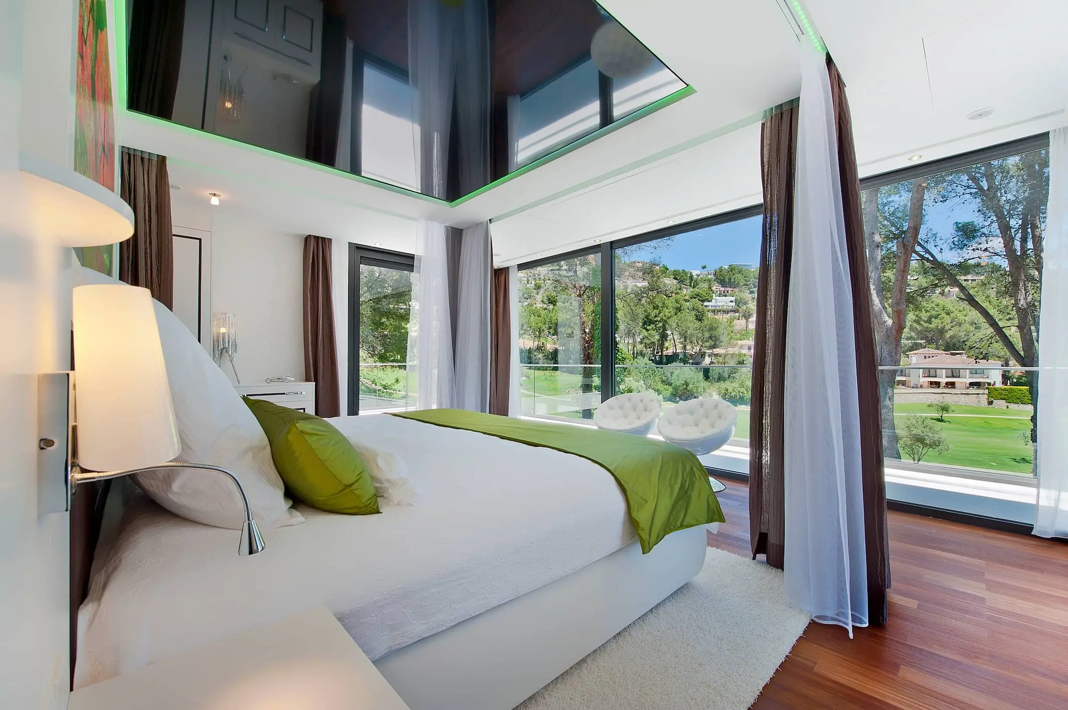 The upper floor is dedicated to the luxurious master bedroom: equipped with an en suite bathroom, custom-made built-in wardrobes, a private terrace with sauna and whirlpool, and a breathtaking 180-degree view over the golf course.