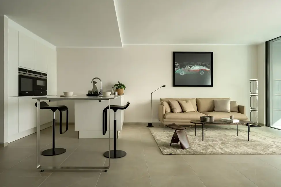 The apartment is located in an elegant, architecturally sophisticated residential complex with a total of only 15 units, which impress with their clean lines, light-flooded rooms, and high-quality materials. The ceiling height of approx. 8.5 feet, together with floor-to-ceiling windows, creates an open, friendly living atmosphere.
