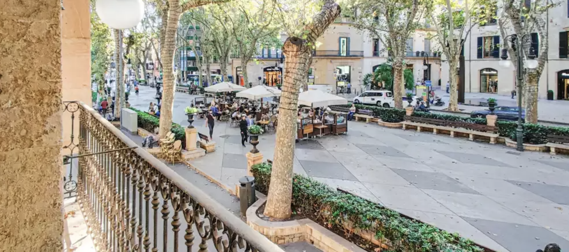 This historic residential building is located on the exclusive Passeig del Borne in the heart of Palma's old town, in a prime location. The property, with a total area of 586 m2, consists of 2 apartments, 1 penthouse, and a commercial space on the ground floor and first floor. There is a lift from the mezzanine. The duplex penthouse measures 150 m2 with a light-filled and open-plan living and dining area with access to a large and beautiful terrace with plenty of privacy and views of the stately trees of the Passeig. The modern, fully equipped kitchen is also on this level and has access to another terrace. There are two spacious bedrooms, both with en-suite bathrooms and fitted wardrobes, as well as another room that could be used as a second living area or an office.