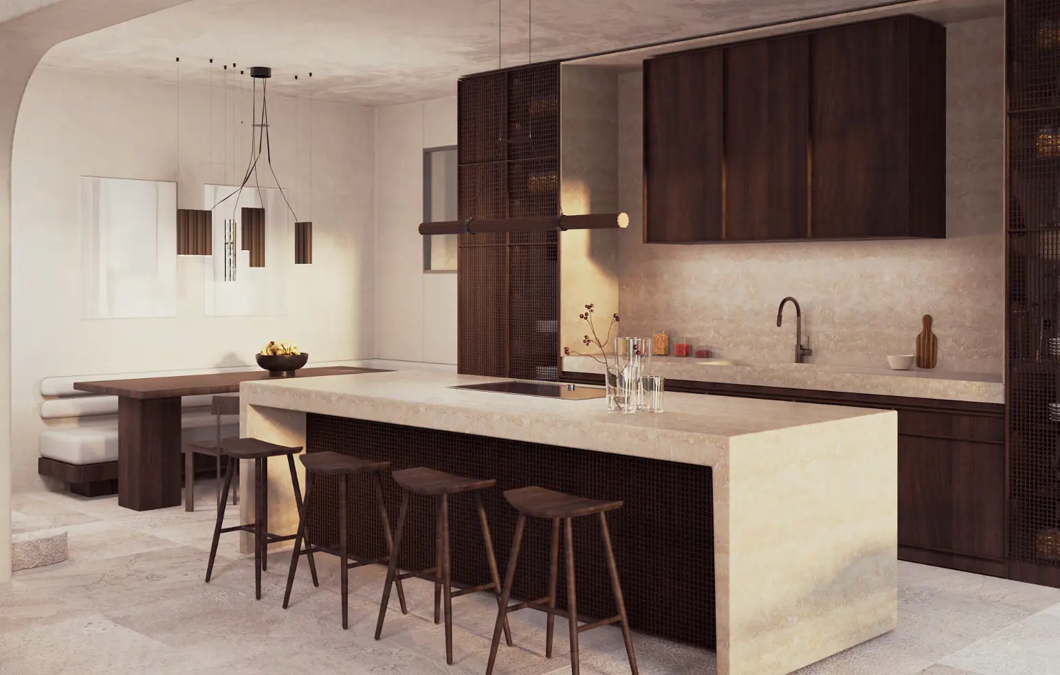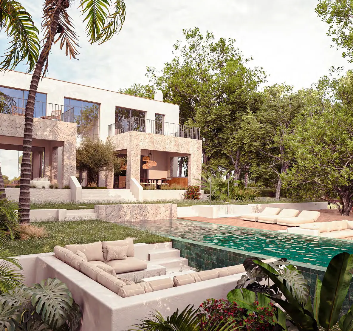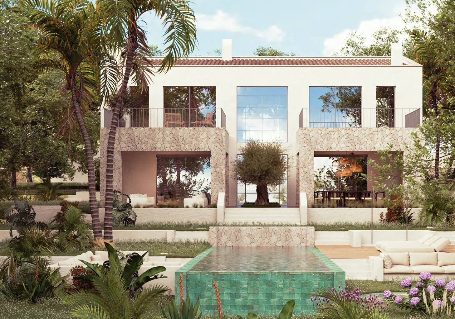The combination of Mediterranean architecture, modern furnishings, and exceptional materials such as microcement, travertine, and natural stone gives this villa a very special soul.