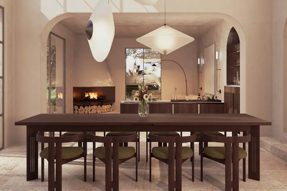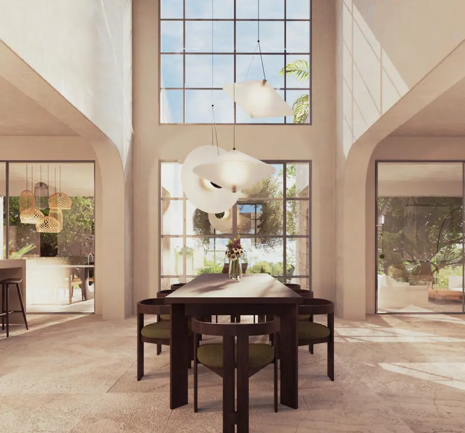 The heart of the house is the spectacular dining area with double-height ceilings and five curved arches that give the room the feel of an amphitheater. Large windows offer views of the Mediterranean garden with its old olive tree and elongated pool.