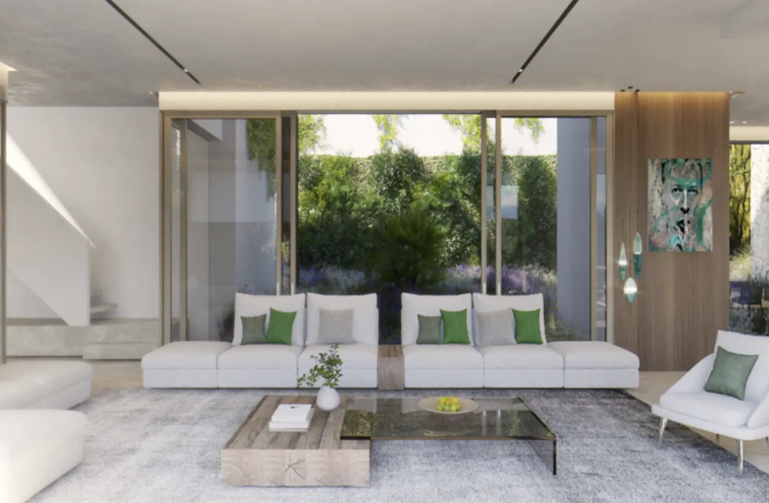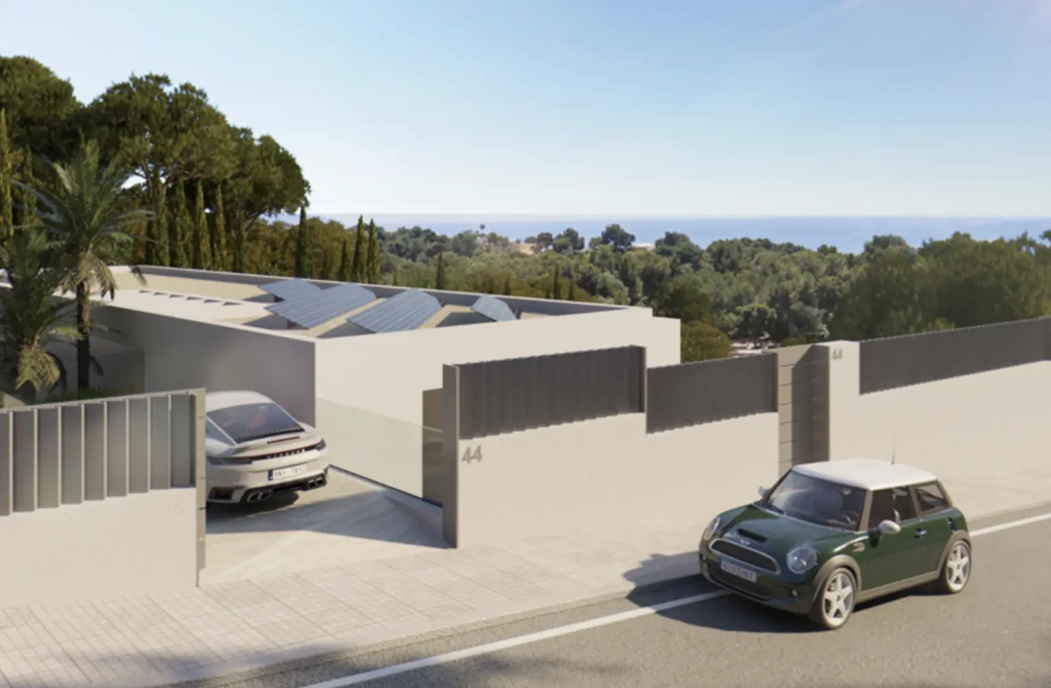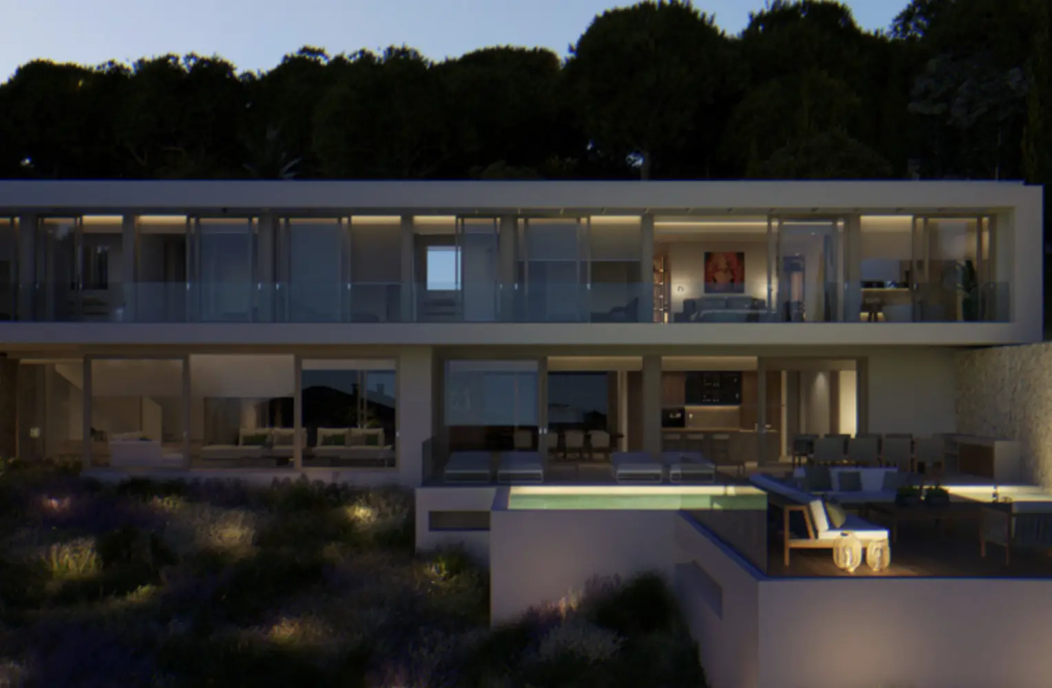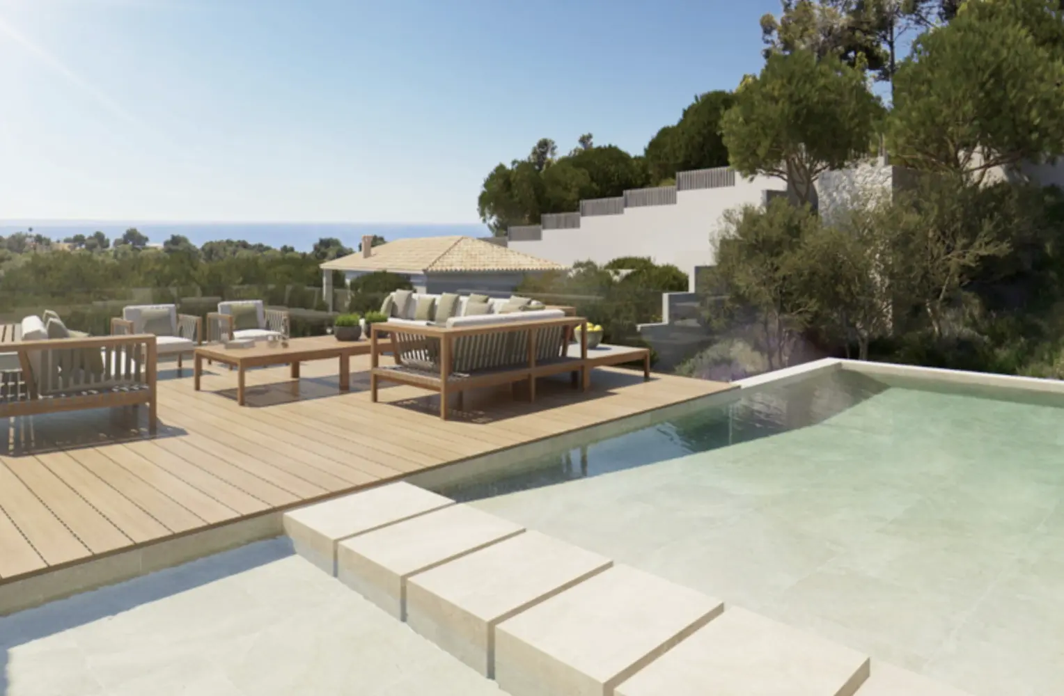 La planta baja alberga una sala de estar abierta, una moderna cocina equipada con comedor, una segunda cocina, un aseo para invitados y otro dormitorio con baño privado y vestidor. Numerosas terrazas, tanto cubiertas como descubiertas, así como una piscina, invitan a disfrutar de la vida al aire libre durante todo el año.