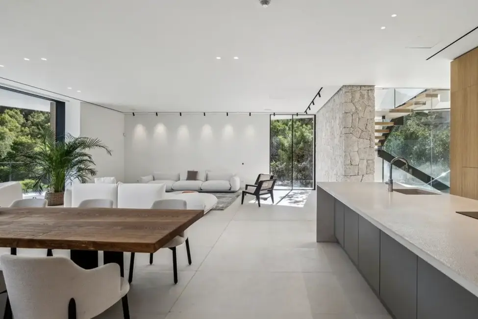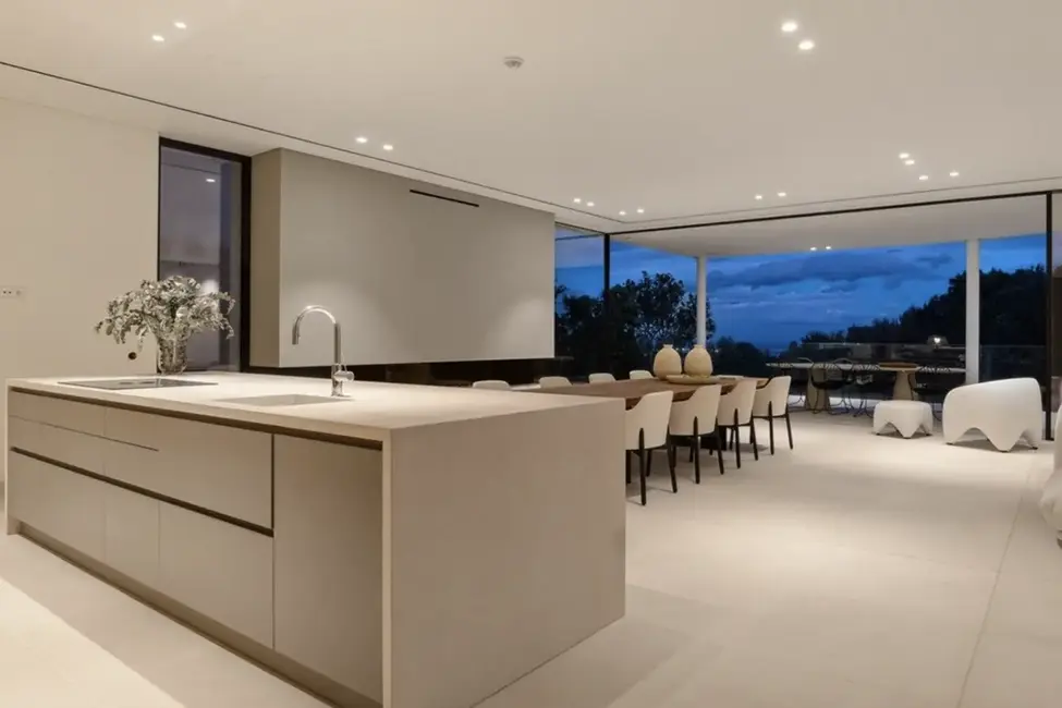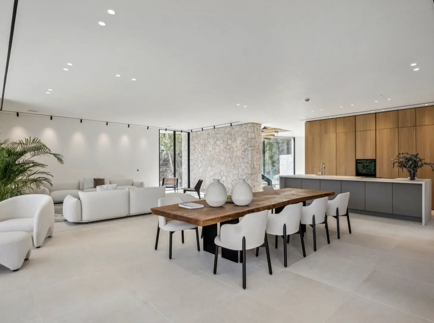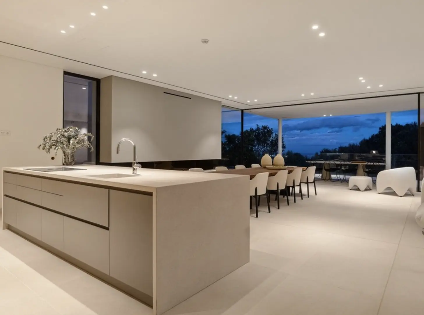 La planta baja ofrece un salón diáfano y luminoso que se funde a la perfección con la amplia terraza y la impresionante piscina infinita de 19 metros de largo. La exclusiva cocina de la marca Mobalco satisface las más altas exigencias y se complementa con una cocina de preparación independiente. Un aseo para invitados y una sala multifuncional, ideal para un cine en casa, completan el espacio disponible en esta planta.