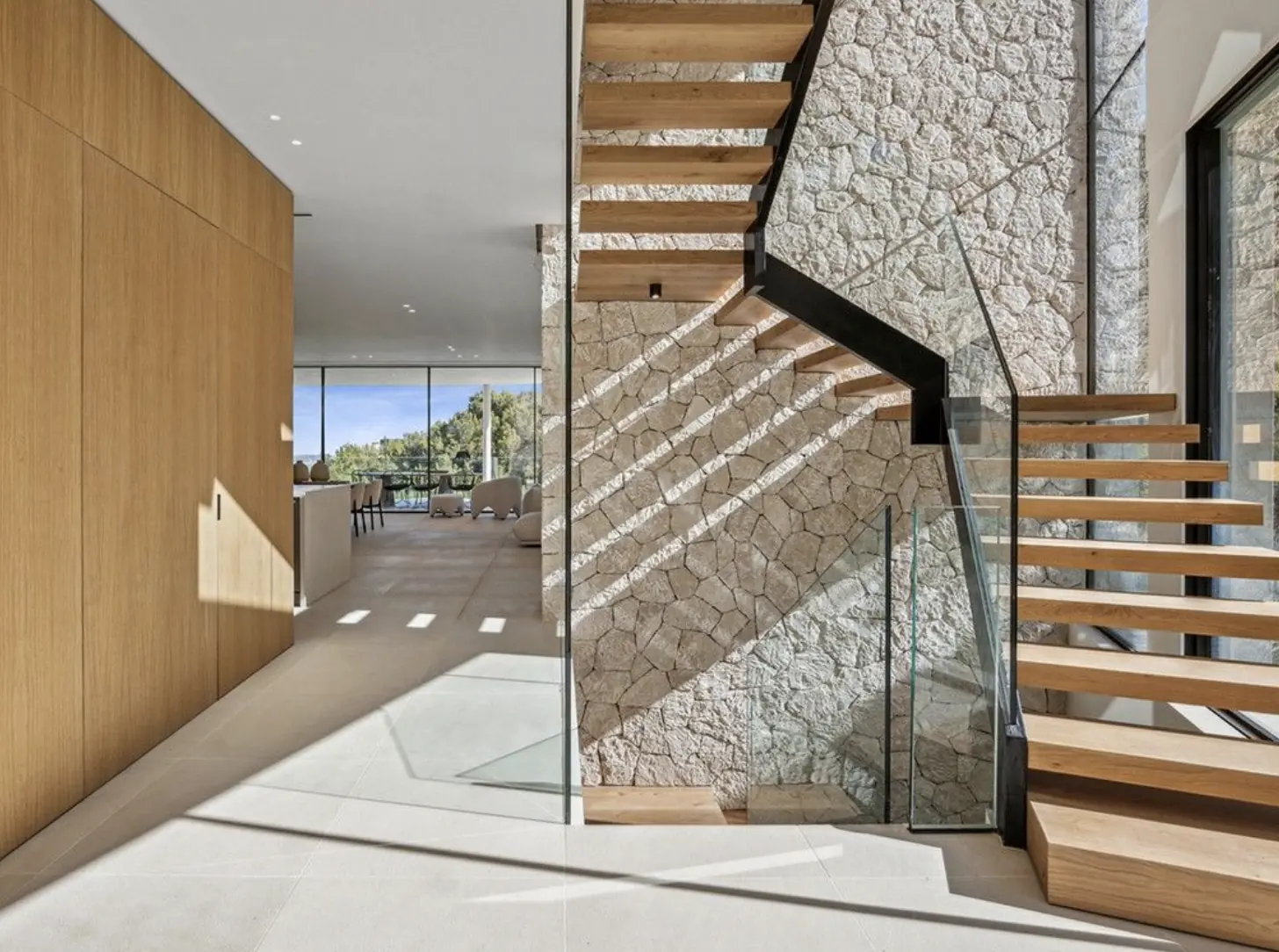Al entrar en la villa, la zona de entrada de la primera planta le da la bienvenida con un impresionante dormitorio principal que cuenta con un vestidor, un elegante cuarto de baño en suite y un gran balcón con vistas al mar. En la misma planta hay otros tres amplios dormitorios dobles, todos ellos con cuarto de baño en suite.