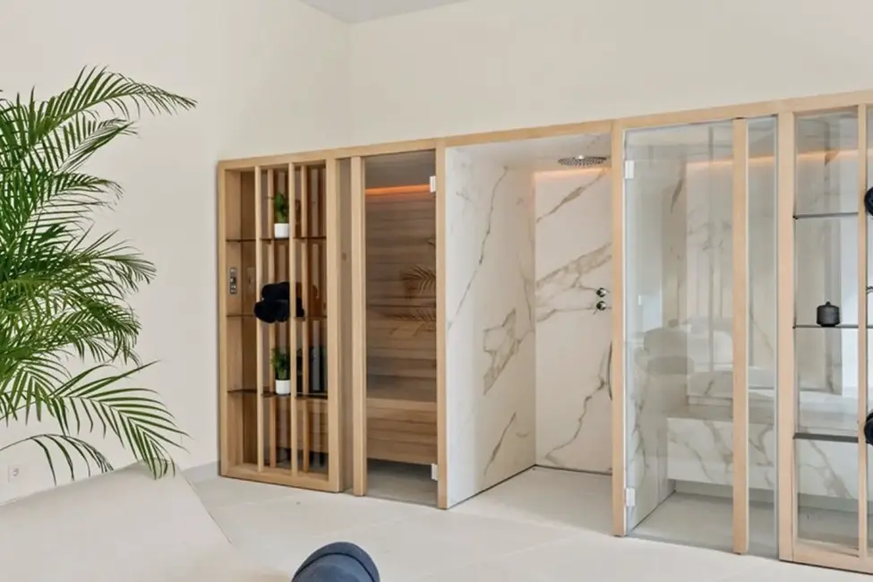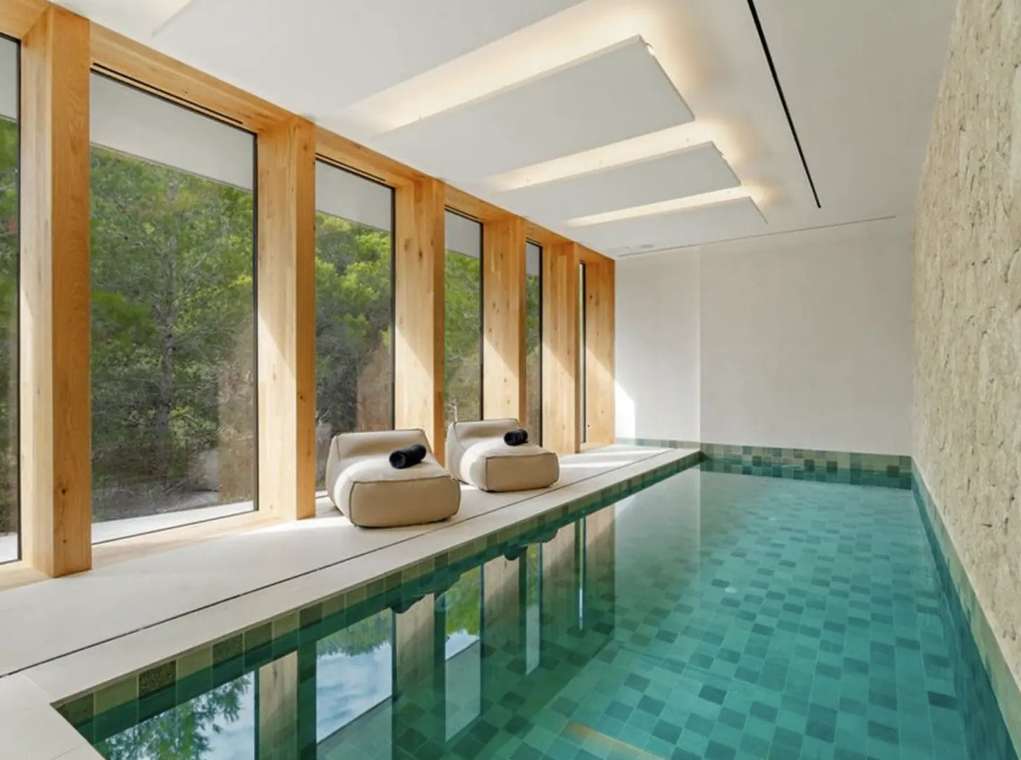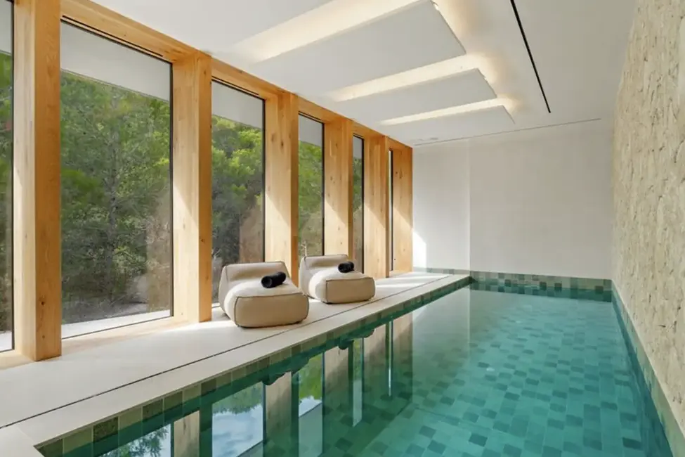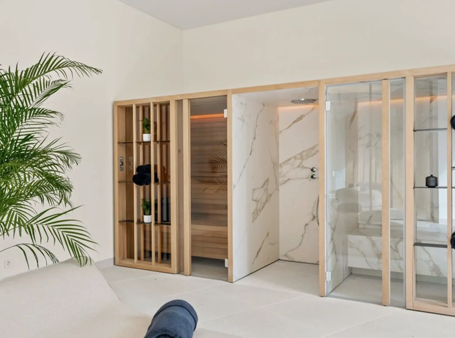 En el semisótano, inundado de luz natural, hay otro dormitorio doble con baño en suite, una bodega climatizada y un lavadero. Una sala de unos 50 m² ofrece múltiples posibilidades de uso, por ejemplo, como gimnasio. Lo más destacado de la villa es la amplia zona de spa con una gran piscina cubierta, dos saunas, una ducha y otro cuarto de baño.