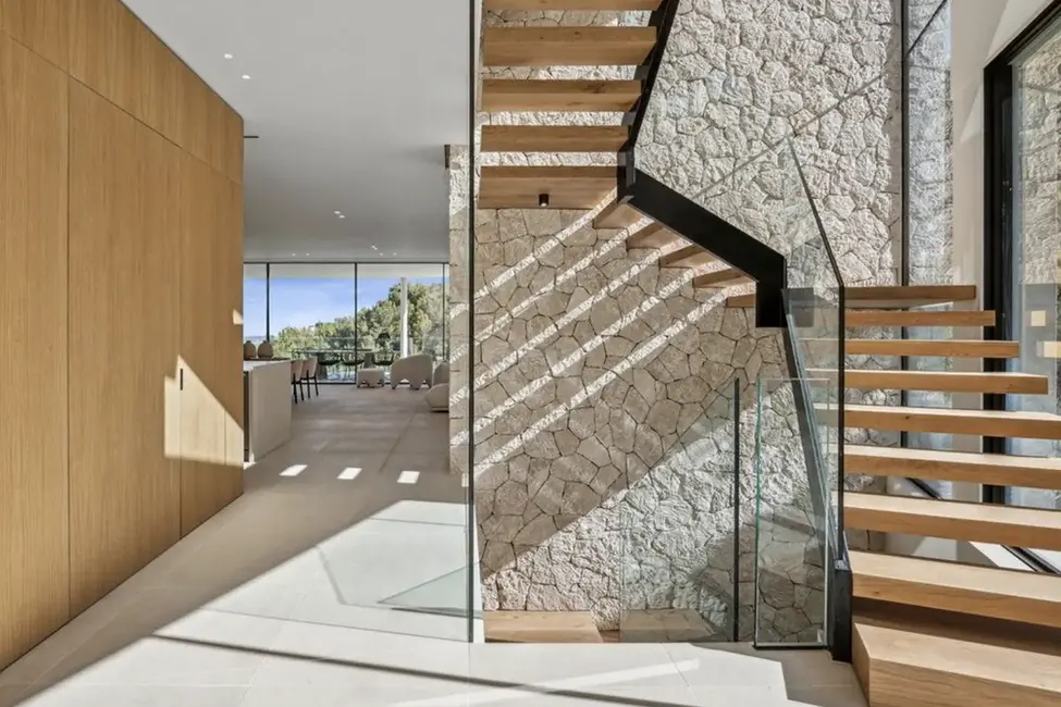 La terraza de la azotea ofrece unas espectaculares vistas panorámicas de la catedral y el mar, y está equipada con un jacuzzi, el lugar perfecto para terminar el día relajándose. El equipamiento técnico incluye calefacción por suelo radiante mediante bomba de calor, aire acondicionado central de Daikin con control individual por habitaciones, sistema de alarma con detectores de movimiento y contactos en las ventanas, y sistema de sonido. Los materiales de alta calidad, como la piedra natural de Niza y el parquet de roble en los dormitorios, confieren a la villa un ambiente exclusivo. Un moderno ascensor de la marca KONE conecta todas las plantas, y una elegante chimenea de gas en la sala de estar proporciona un ambiente aún más acogedor. Dos plazas de garaje ofrecen espacio suficiente para los vehículos.