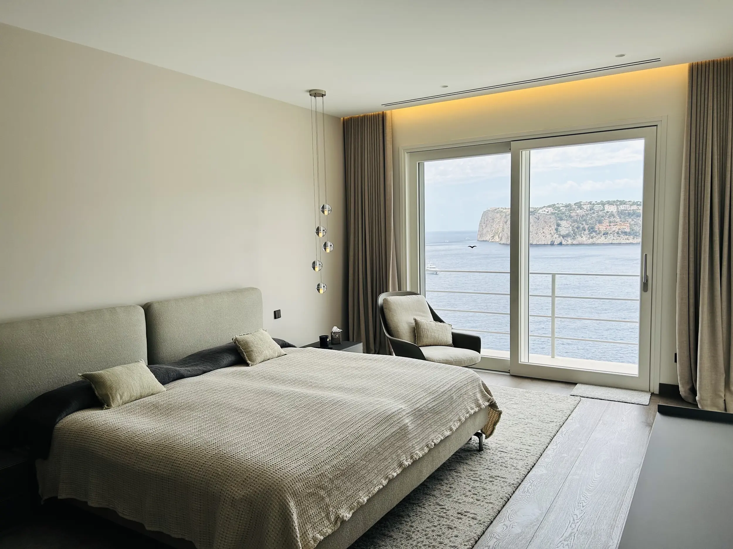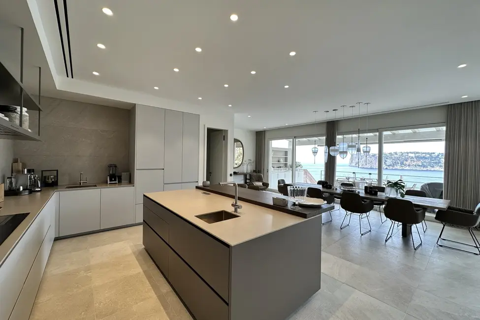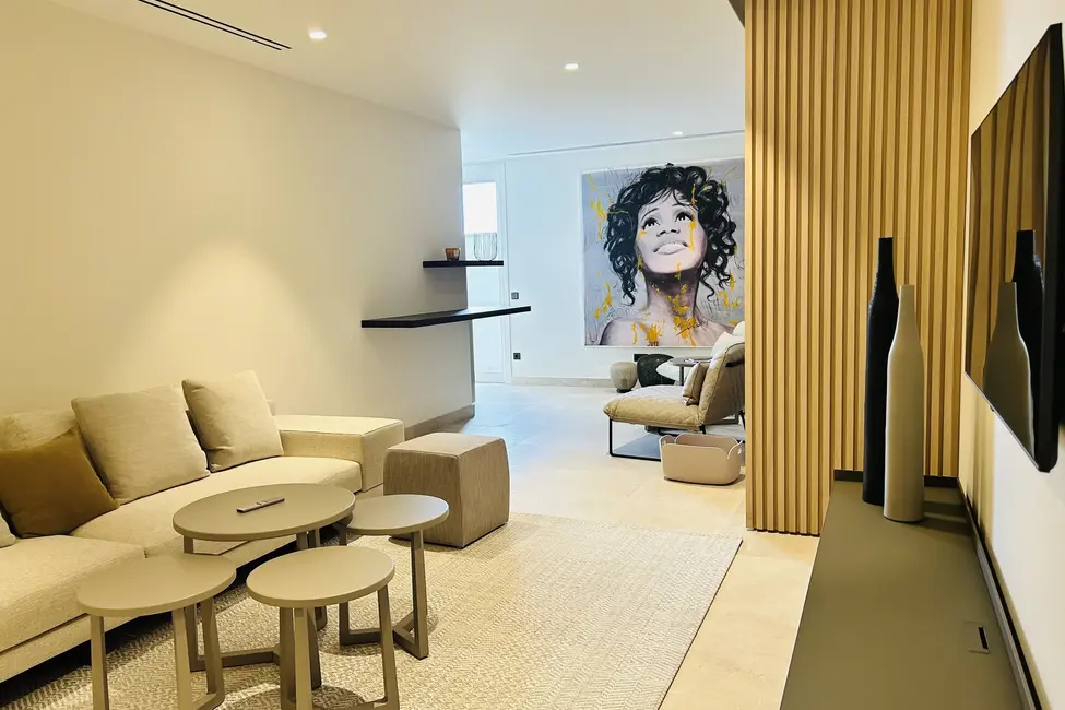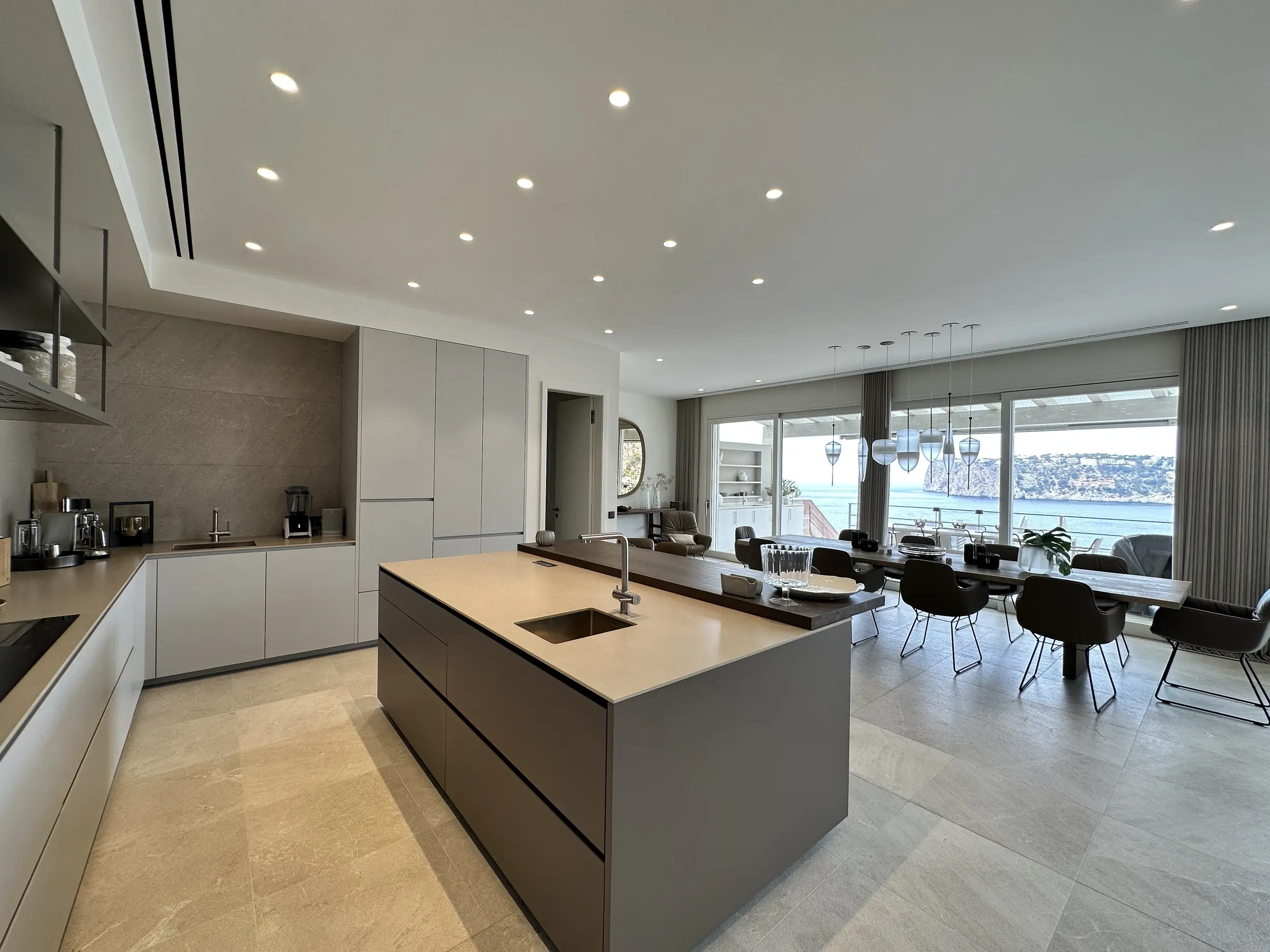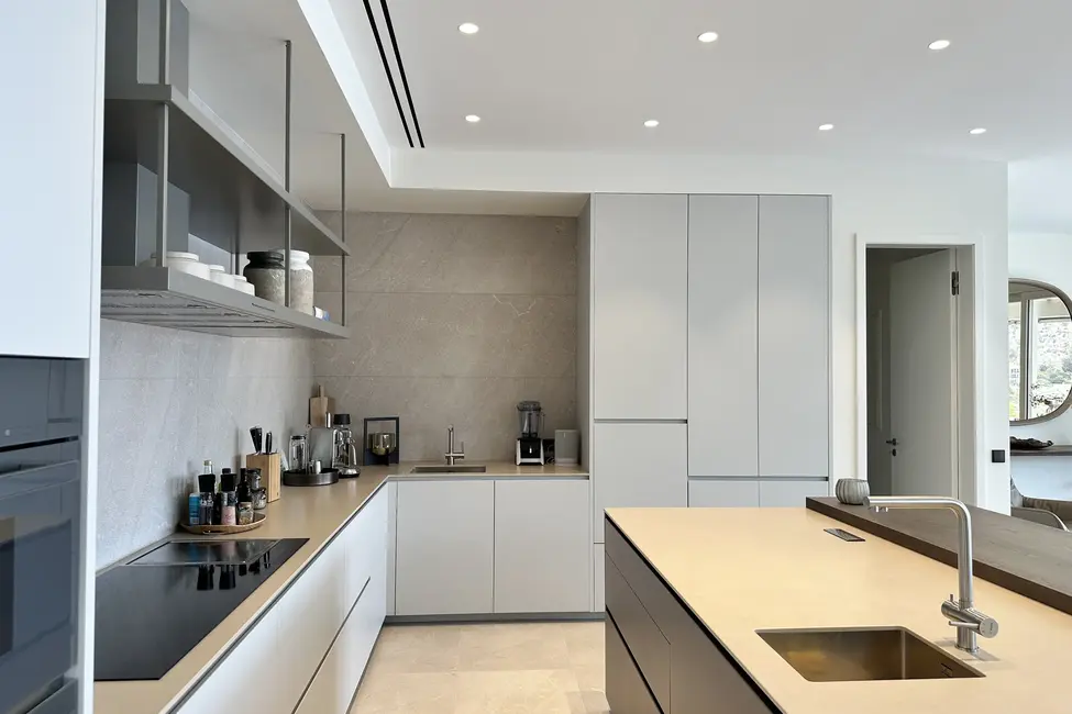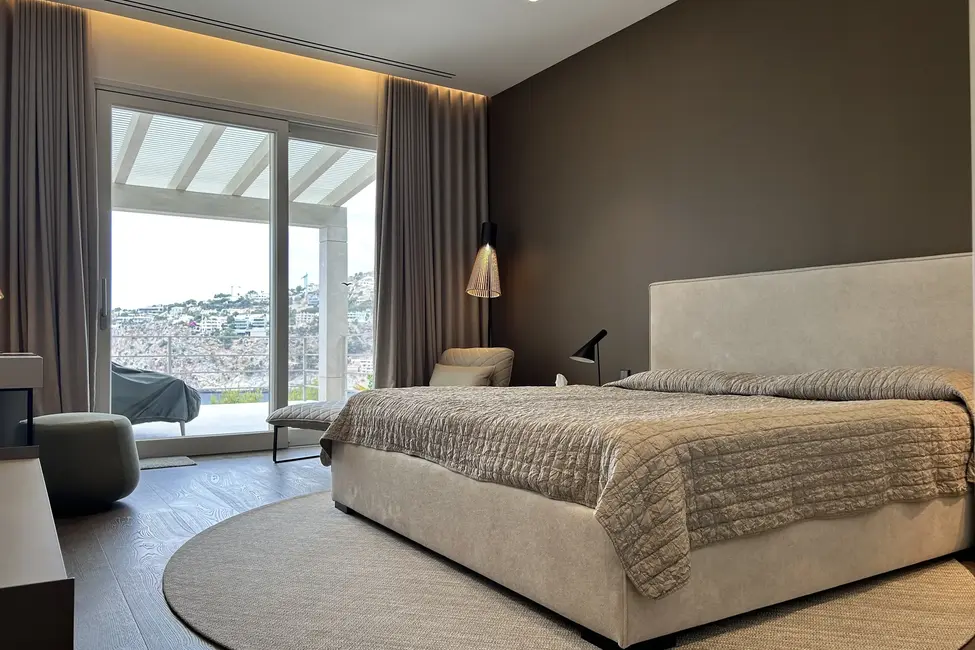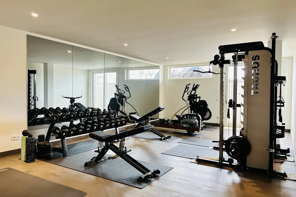En la planta baja hay dos dormitorios independientes, cada uno con su propio cuarto de baño en suite, una sala de estar para invitados con cocina americana y un amplio gimnasio totalmente equipado. Otras instalaciones incluyen una gran piscina de agua salada con una terraza separada para tomar el sol. En la planta baja hay una sauna, una ducha y un aseo que da acceso a otra terraza con vistas al mar. También hay aseos para invitados y un cuarto de servicio. Toda la casa está equipada con un sistema de bus (EIB Port) que permite controlar cómodamente el aire acondicionado, la iluminación, las persianas, la alarma, la calefacción, etc.