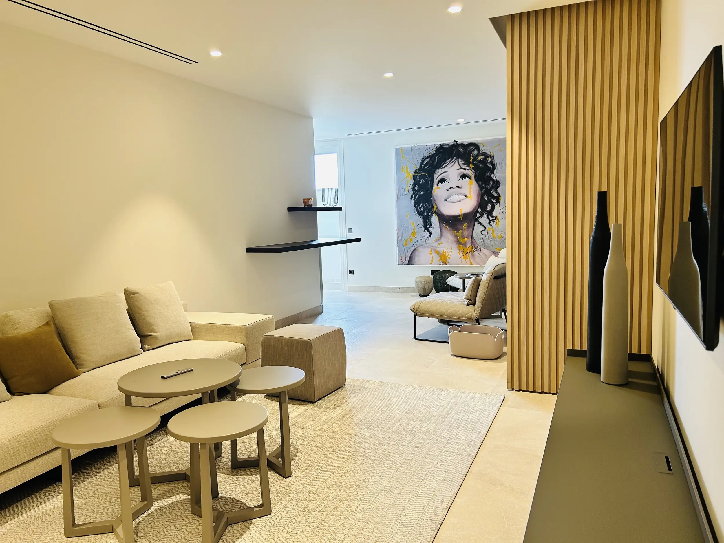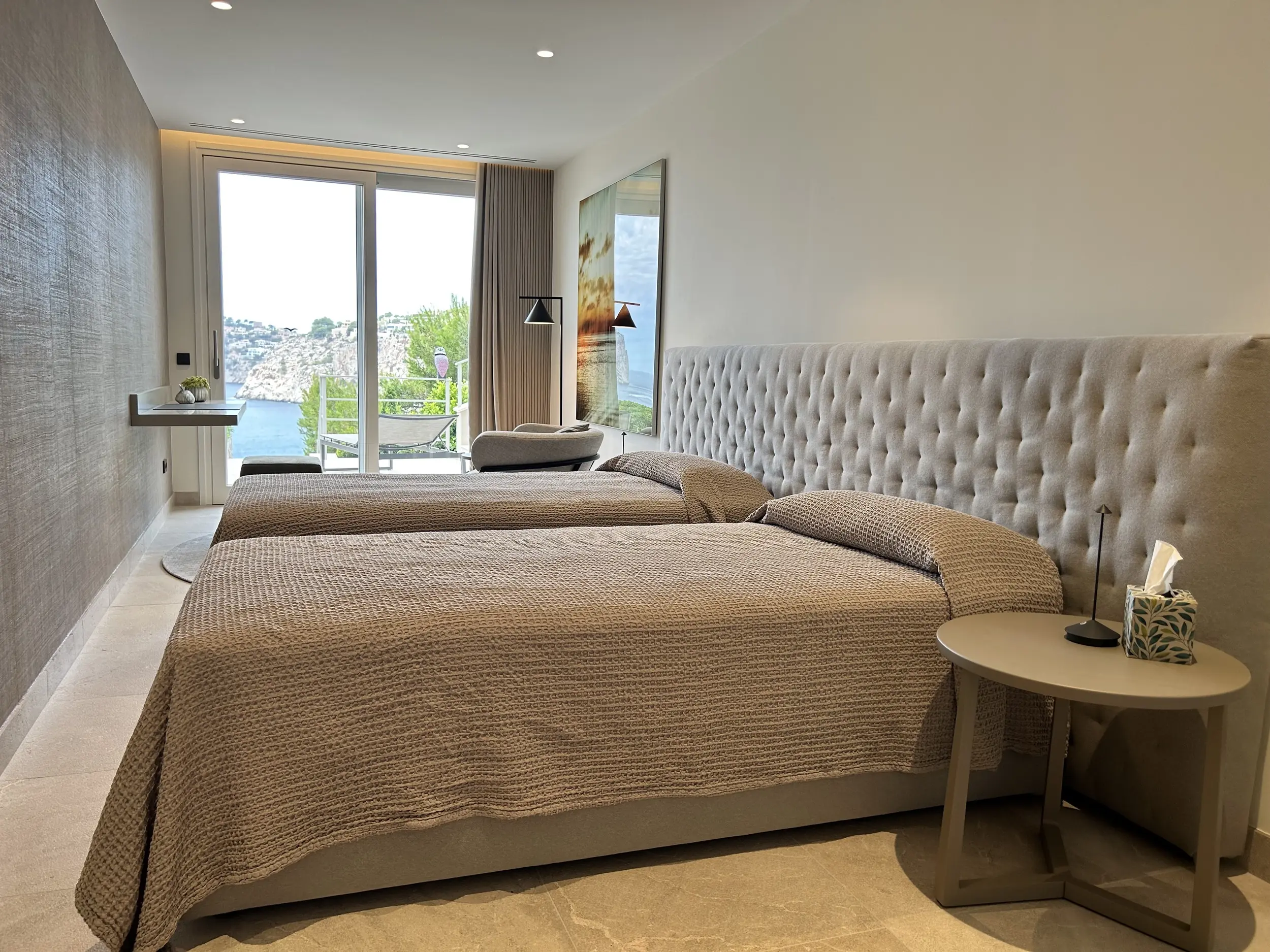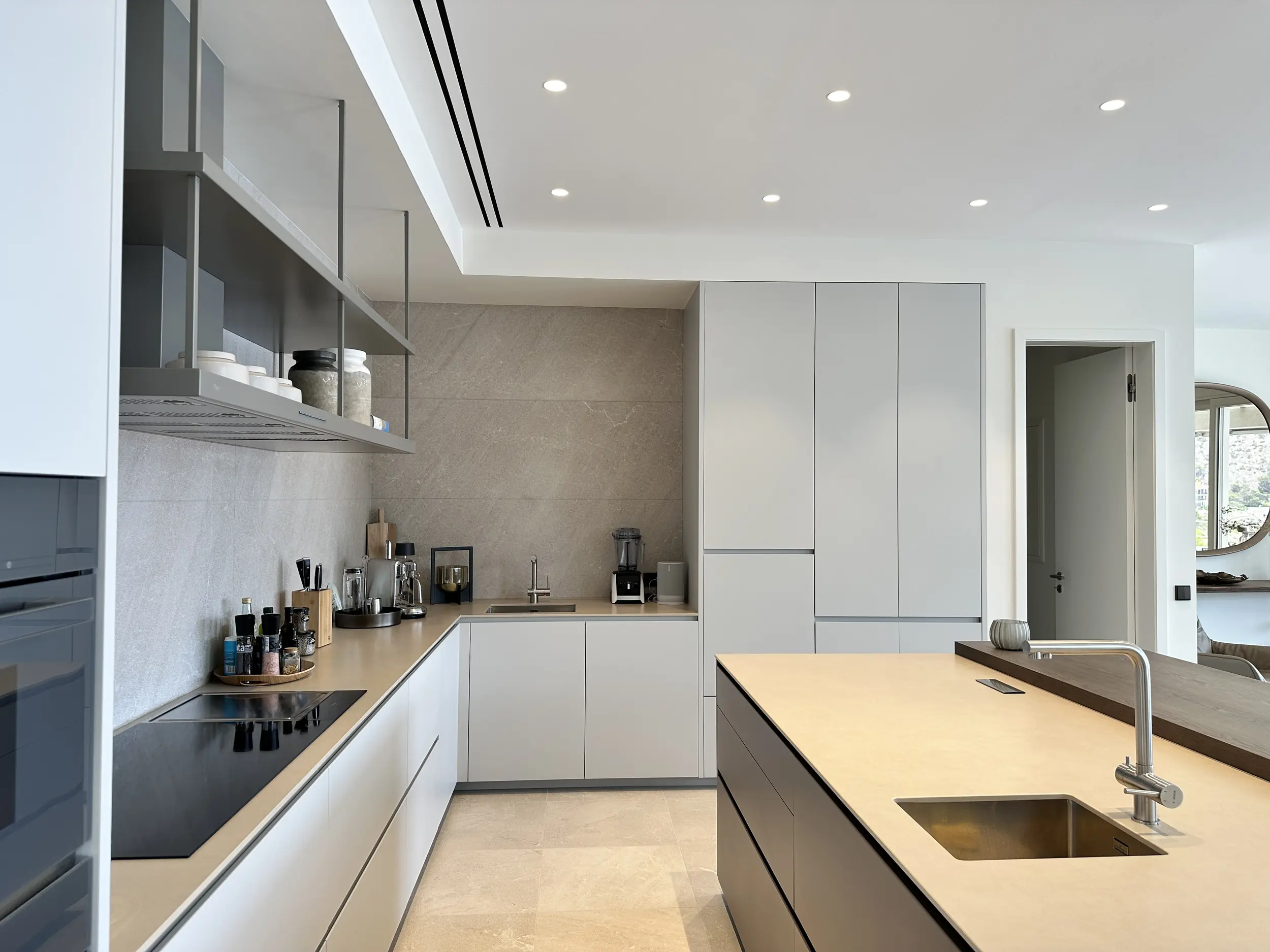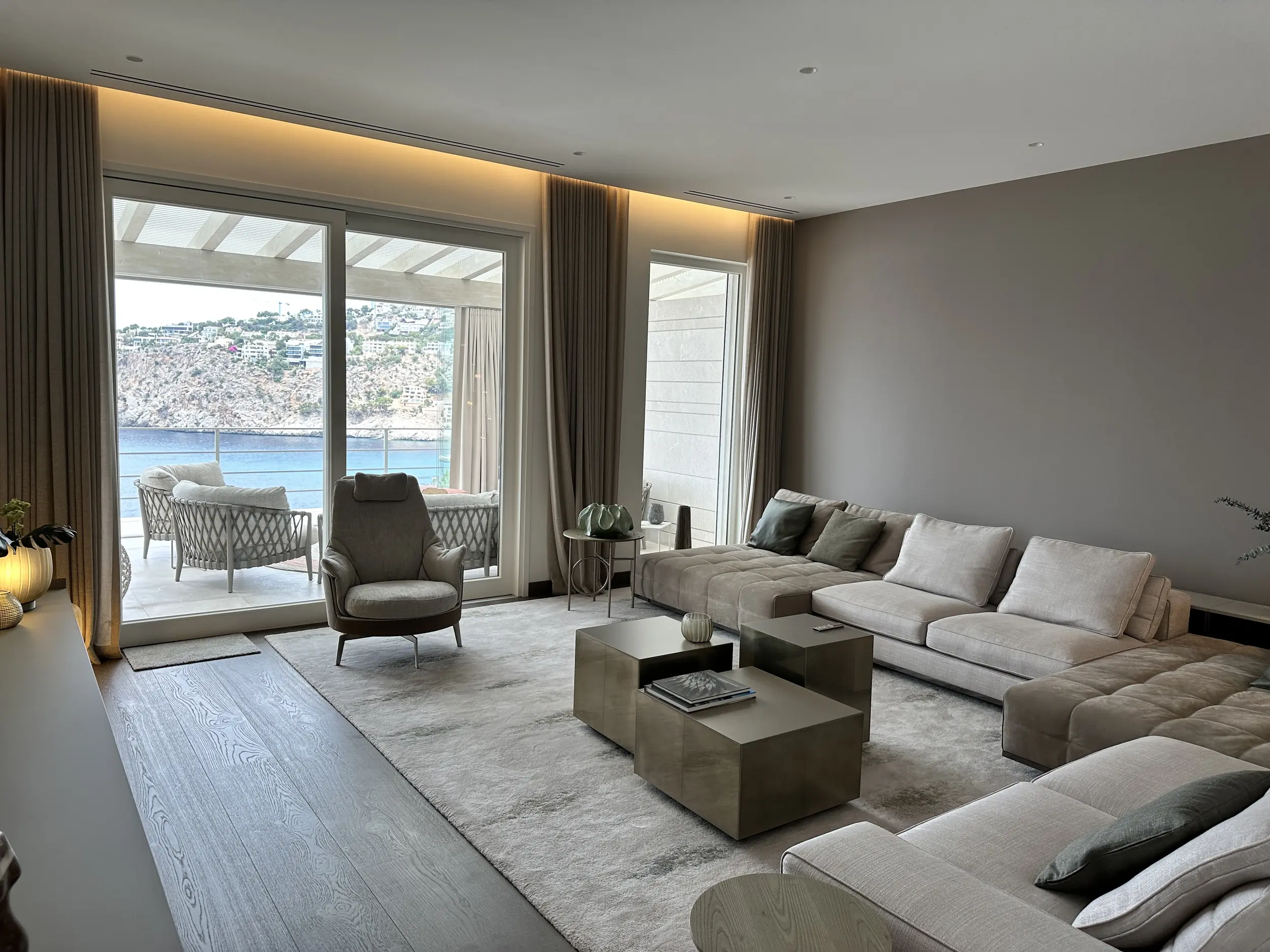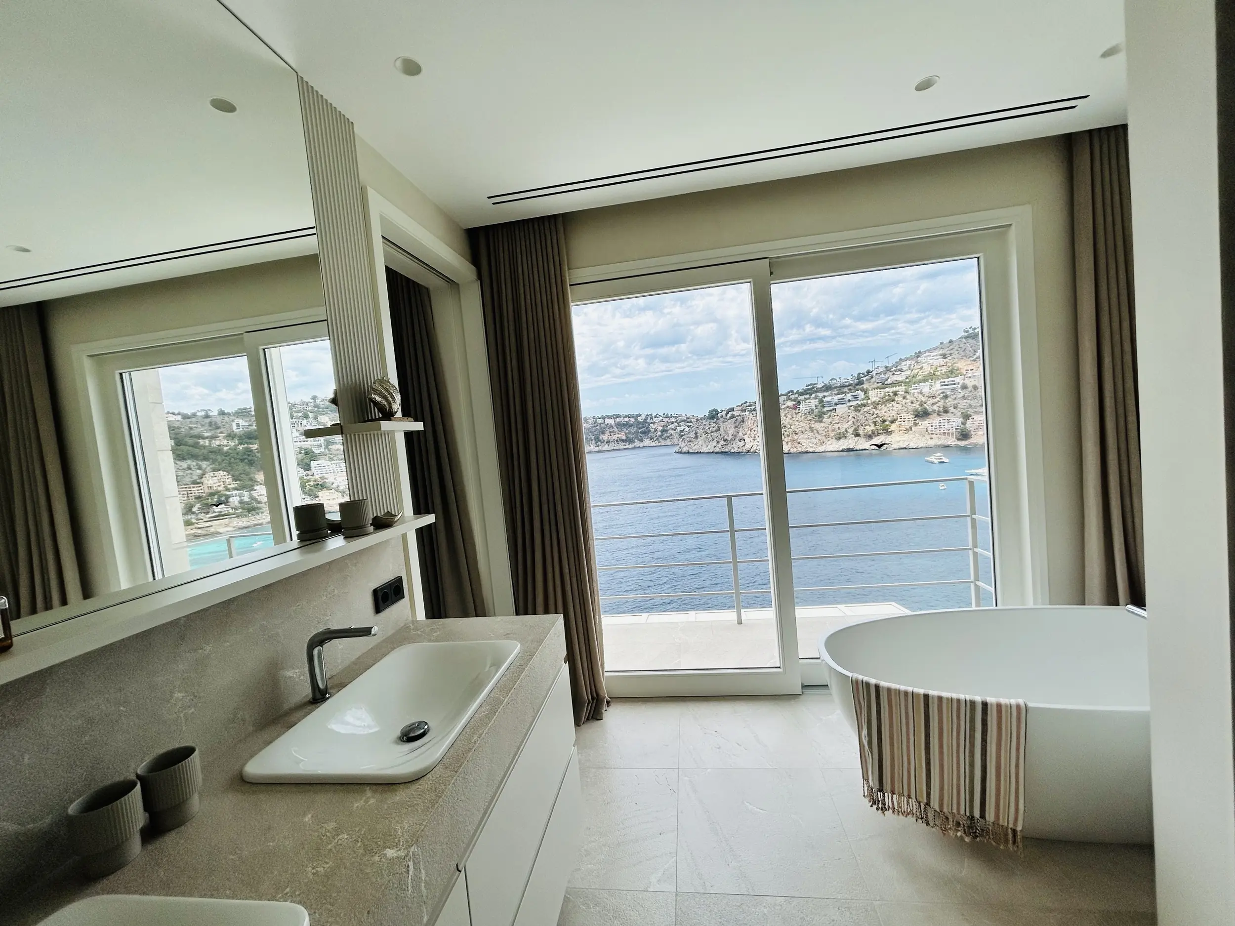 En la planta baja hay dos dormitorios independientes, cada uno con su propio cuarto de baño en suite, una sala de estar para invitados con cocina americana y un amplio gimnasio totalmente equipado. Otras instalaciones incluyen una gran piscina de agua salada con una terraza separada para tomar el sol. En la planta baja hay una sauna, una ducha y un aseo que da acceso a otra terraza con vistas al mar. También hay aseos para invitados y un cuarto de servicio. Toda la casa está equipada con un sistema de bus (EIB Port) que permite controlar cómodamente el aire acondicionado, la iluminación, las persianas, la alarma, la calefacción, etc.