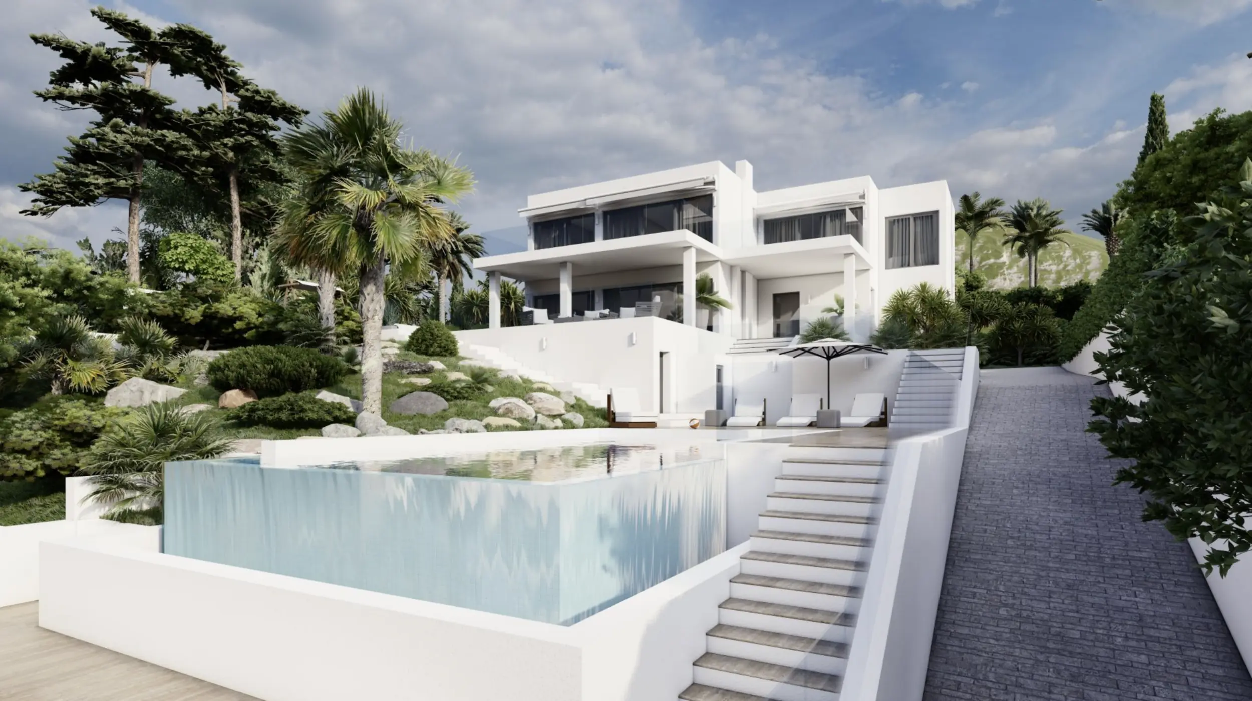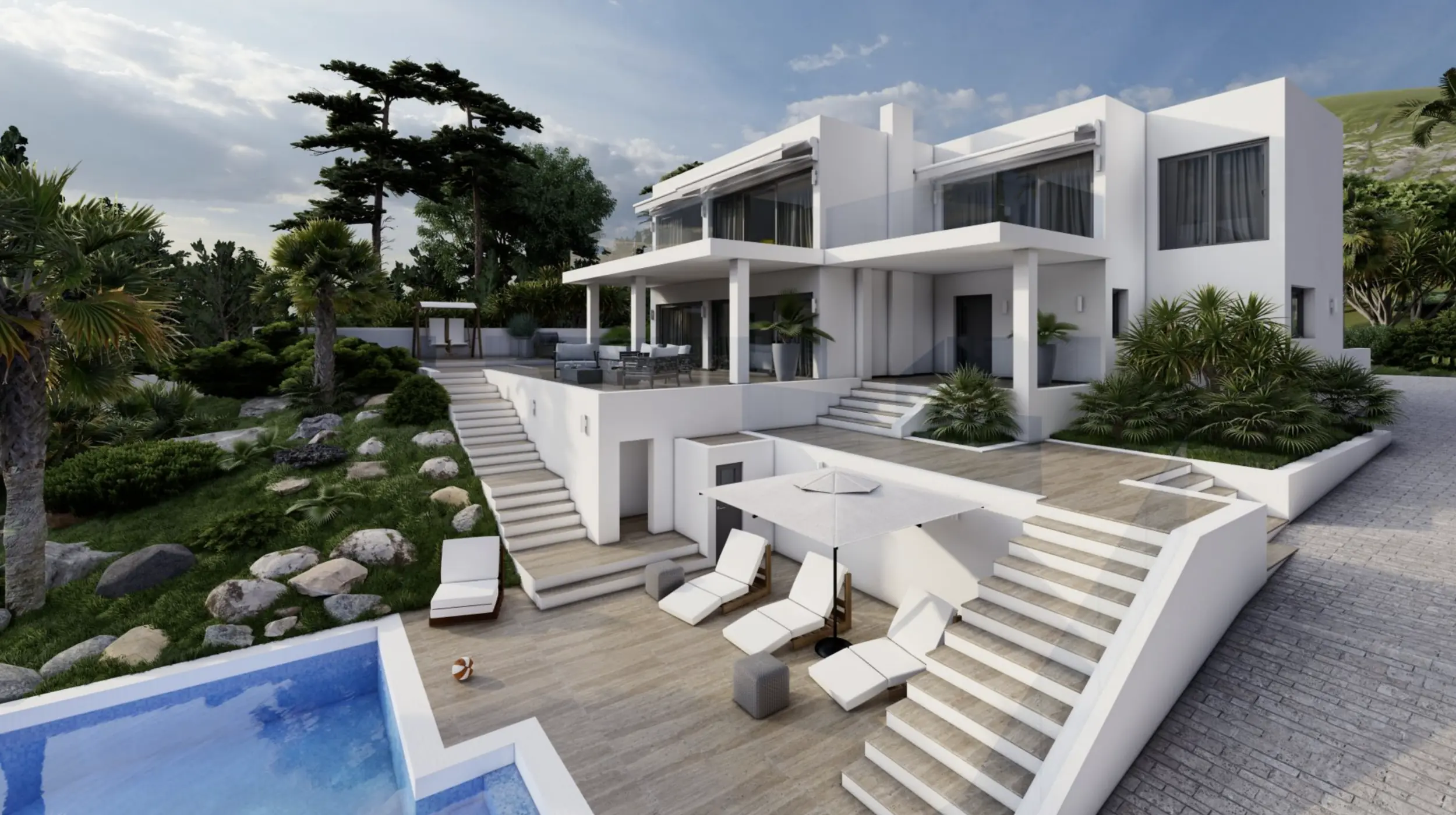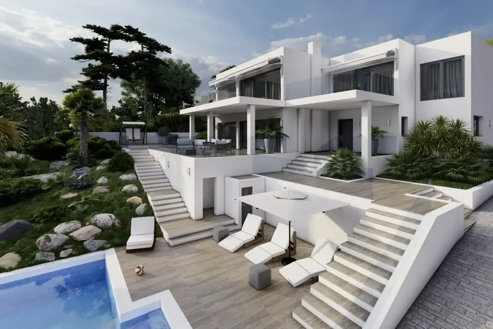 En estos momentos se está renovando por completo una magnífica villa situada en una zona residencial muy cotizada, cerca del centro de Santa Ponsa. La tranquila calle en la que se encuentra la propiedad es un oasis de paz, pero a la vez se puede llegar fácilmente en coche a varias playas, campos de golf y puertos deportivos de la región. La planta baja de la villa, a nivel de la calle, incluye un amplio salón-comedor con acceso directo a la terraza cubierta, que ofrece unas vistas impresionantes del mar y del paisaje circundante. Una lujosa cocina de marca con un lavadero independiente, un espacioso dormitorio con baño en suite y un aseo completan la oferta de esta planta. La planta superior de la villa alberga una espaciosa suite con vestidor, baño y una soleada terraza con unas vistas incomparables de los alrededores. Además, hay otros dos dormitorios, ambos con baño y terraza. La planta baja de la villa cuenta con varios trasteros y cuartos técnicos. La zona exterior ofrece amplias y acogedoras terrazas, tanto descubiertas como cubiertas, una refrescante piscina y un hermoso jardín con riego automático. La propiedad también incluye dos garajes dobles. Además, existe la posibilidad de adquirir la propiedad en su estado actual como objeto de renovación por un precio de venta de 3 500 000 euros. Encontrará más detalles en el ID de la propiedad: 1035 .