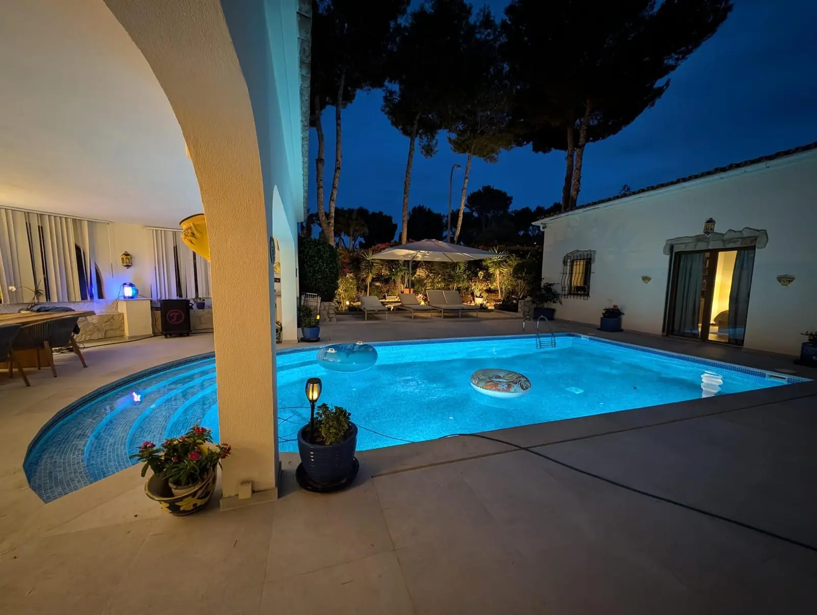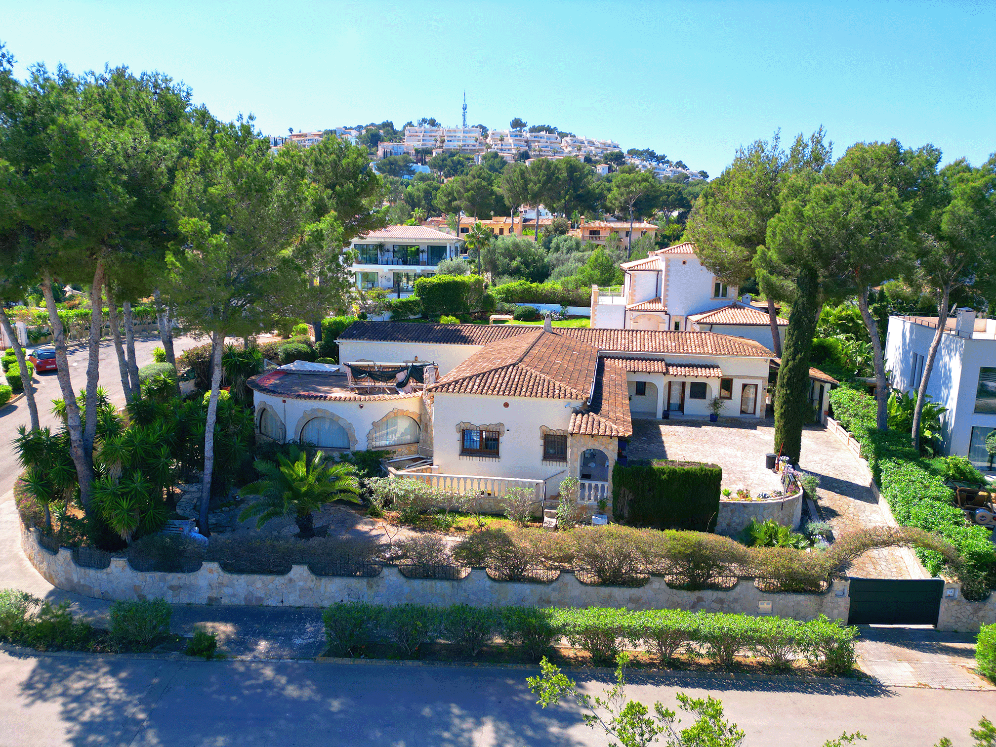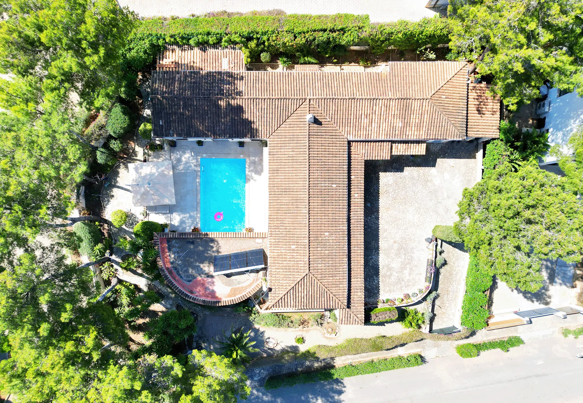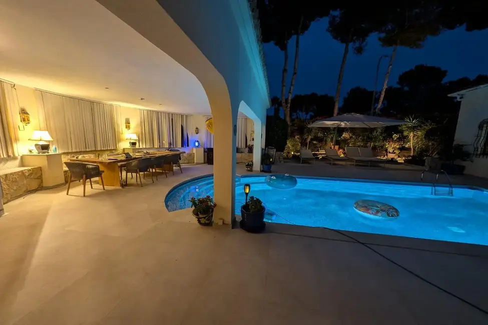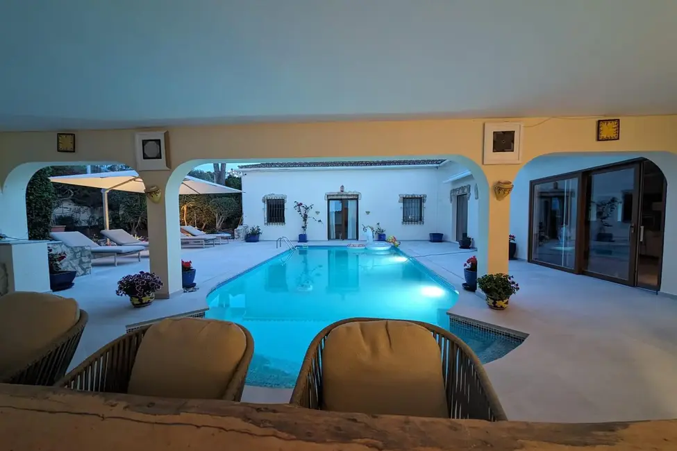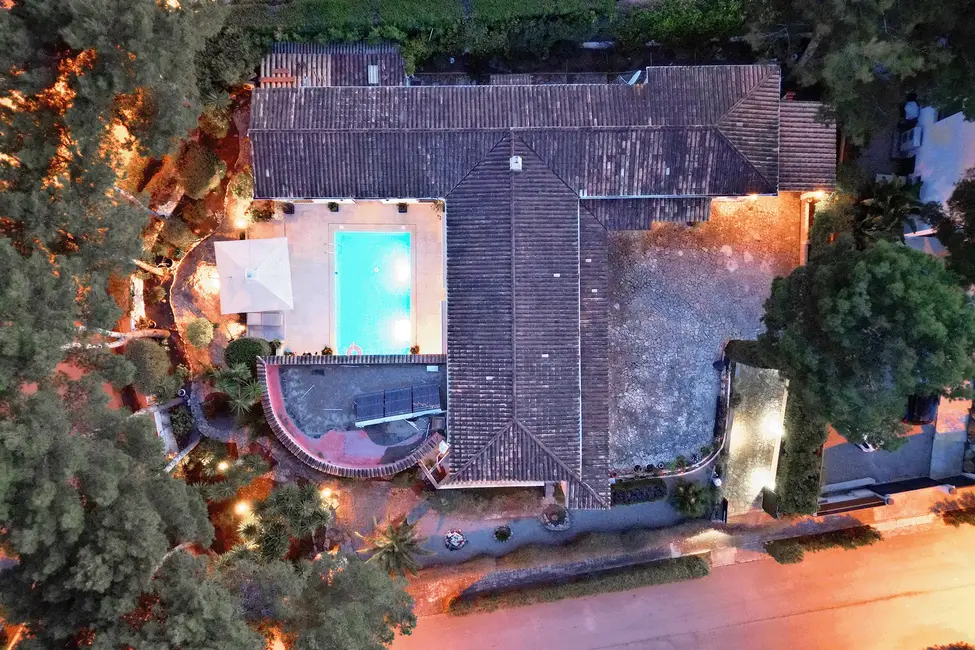 La superficie habitable y útil de unos 350 m² se distribuye en habitaciones amplias y luminosas. La zona exterior se completa con una gran piscina, zonas de ocio y una cochera con plazas para dos vehículos. El equipamiento y el diseño combinan el encanto mediterráneo con el confort moderno.
