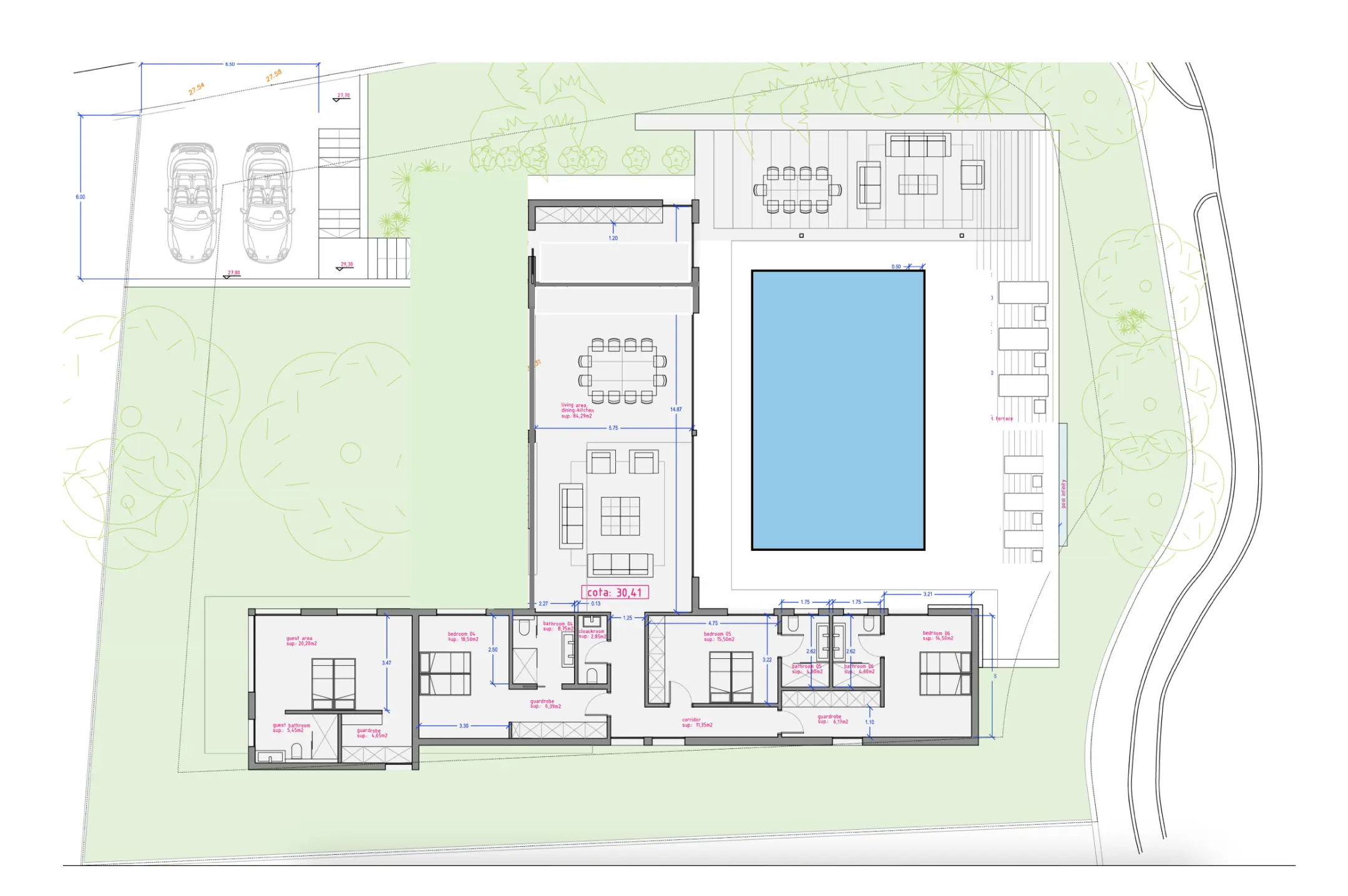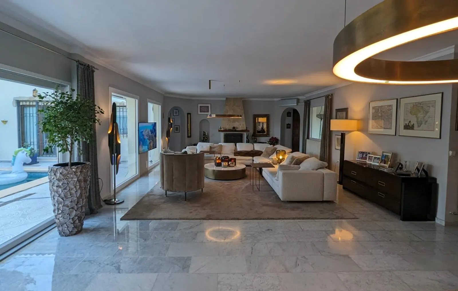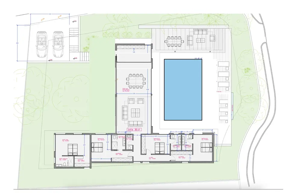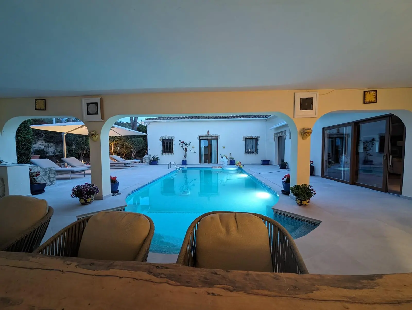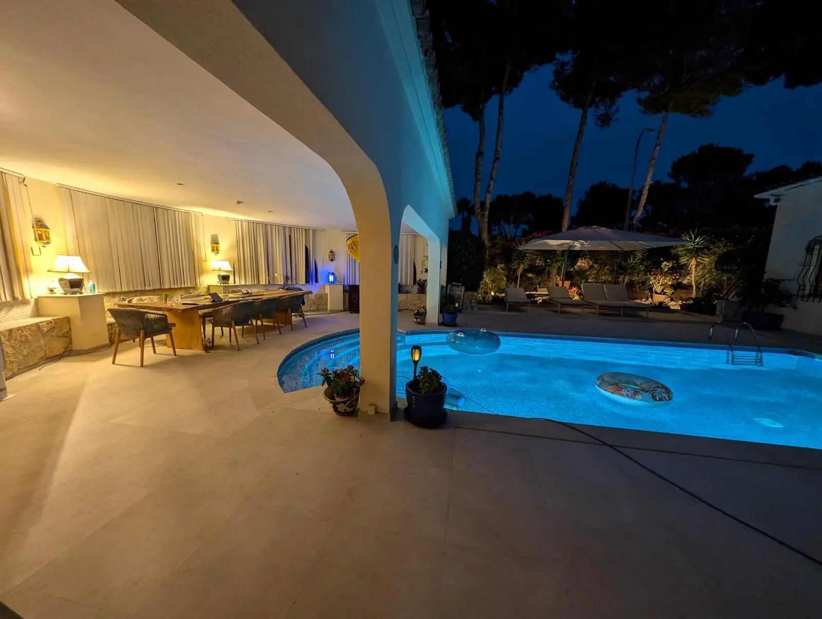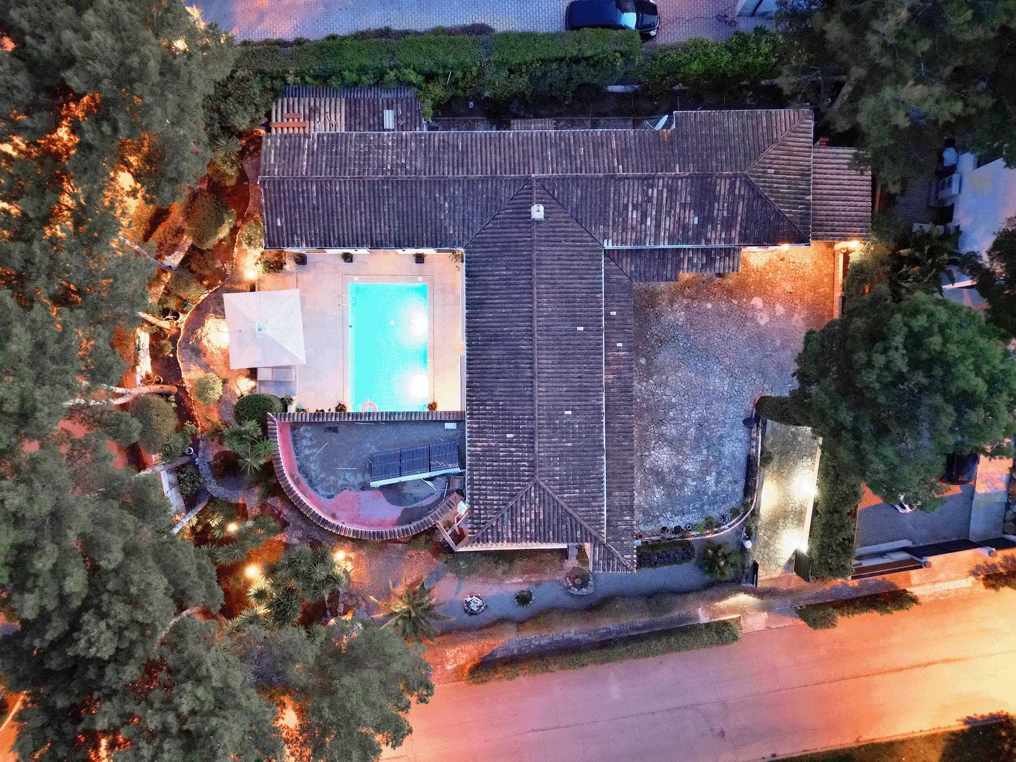 La superficie habitable y útil de unos 350 m² se distribuye en habitaciones amplias y luminosas. La zona exterior se completa con una gran piscina, zonas de ocio y una cochera con plazas para dos vehículos. El equipamiento y el diseño combinan el encanto mediterráneo con el confort moderno.