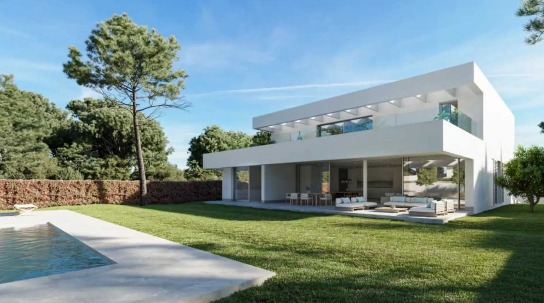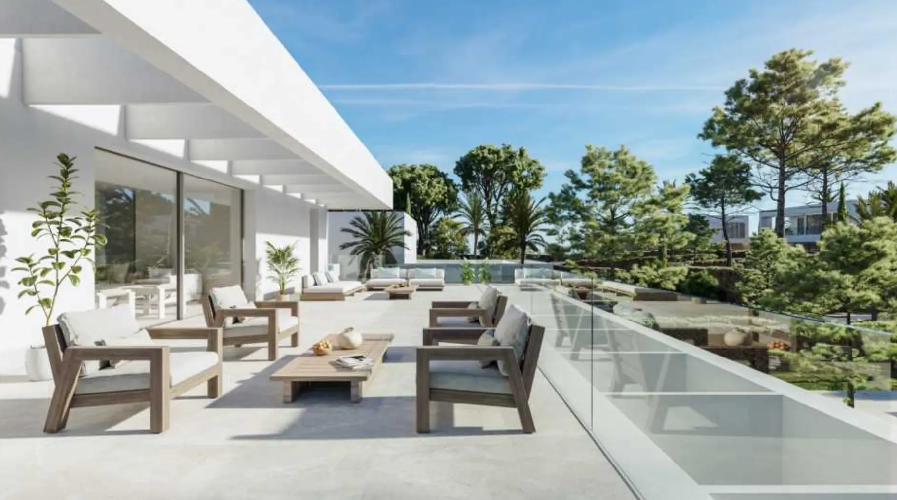 Las villas impresionan por su arquitectura clara y rectilínea, con techos altos, puertas de altura completa y grandes ventanales que se funden con amplias terrazas y zonas ajardinadas. Cada villa ofrece una superficie habitable de aproximadamente 403 m² con un concepto espacial único, diseñado de forma individualizada.