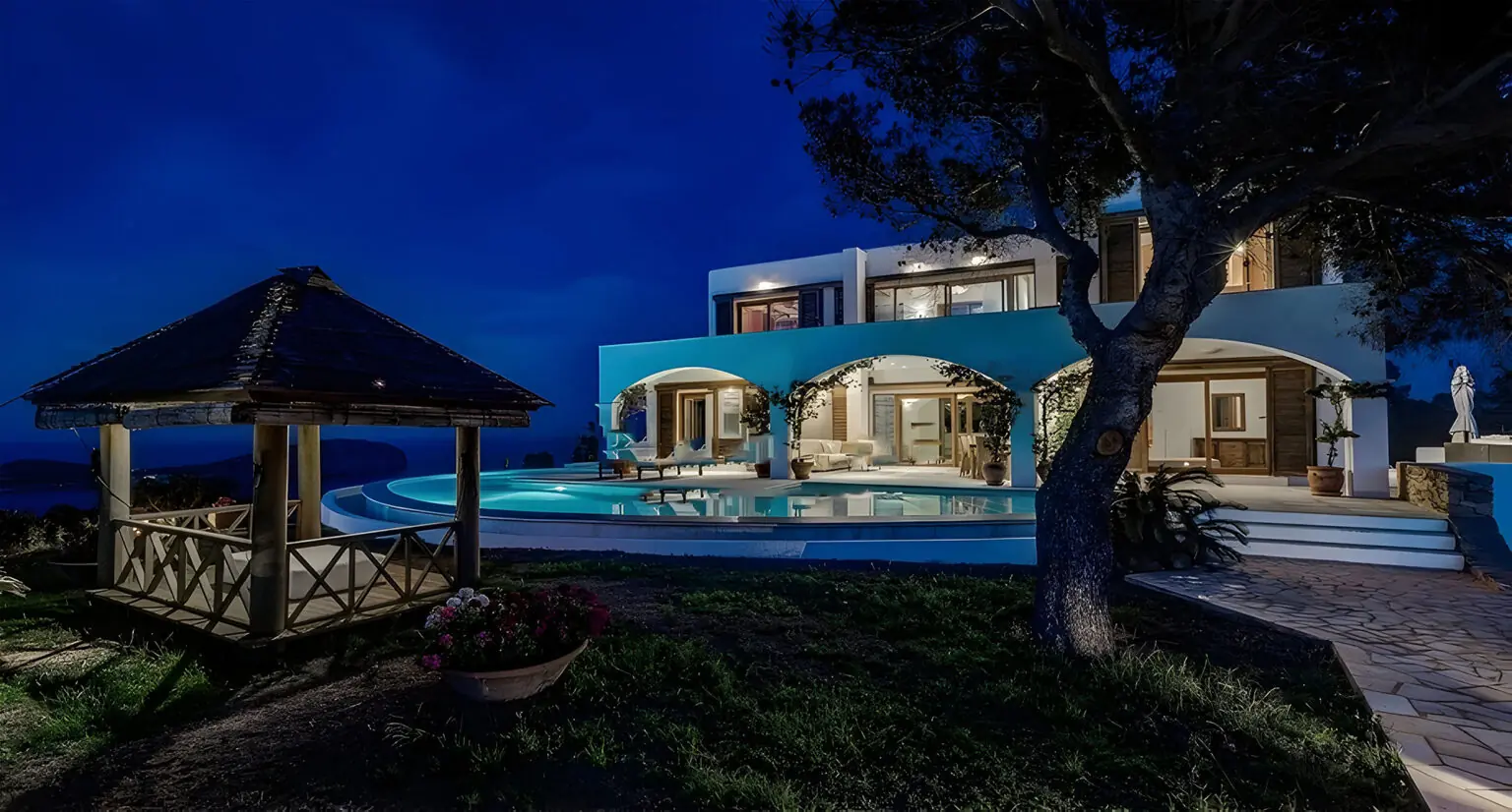 Un total de 10 dormitorios y 8 baños, distribuidos en tres villas de lujo de estilo ibicenco antiguo y romántico, de estilo vacacional moderno y una casa de invitados y de servicio.