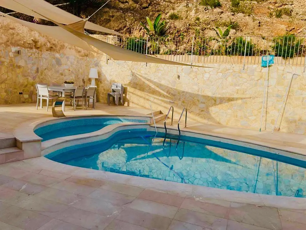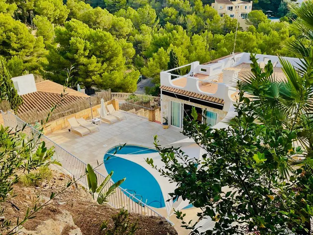 Esta magnífica casa tradicional se encuentra en las pintorescas colinas de Costa d'en Blanes y ofrece unas vistas impresionantes al mar en dirección sureste. En la parte trasera de la propiedad hay una tranquila zona de piscina privada que invita a relajarse. El interior de esta propiedad, que se extiende sobre una superficie construida de 267 m², destaca por su sala de estar abierta con despacho contiguo. Ambas habitaciones dan al frente de la villa y conducen a una terraza desde la que se pueden admirar las zonas verdes y el resplandeciente mar Mediterráneo. En esta planta también hay un aseo para invitados, una cocina independiente con lavadero y un acogedor comedor desde el que se puede ver la tranquila zona de la piscina en la parte trasera de la villa.