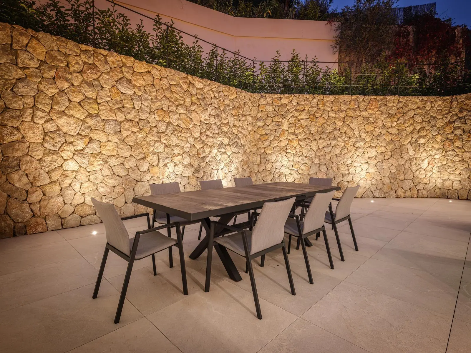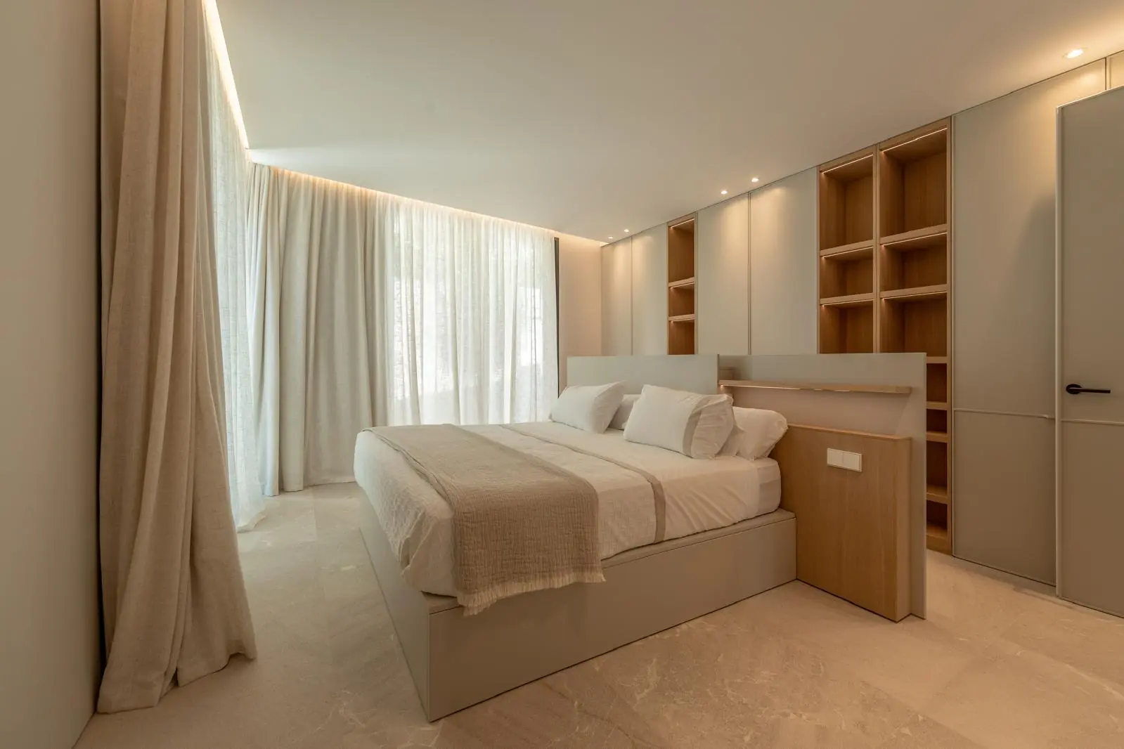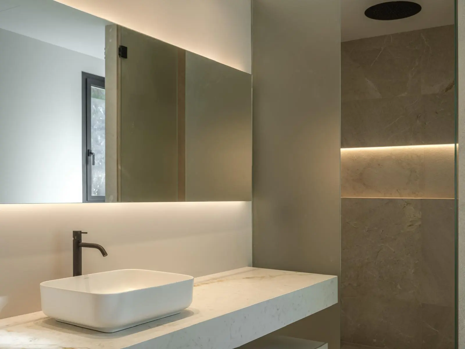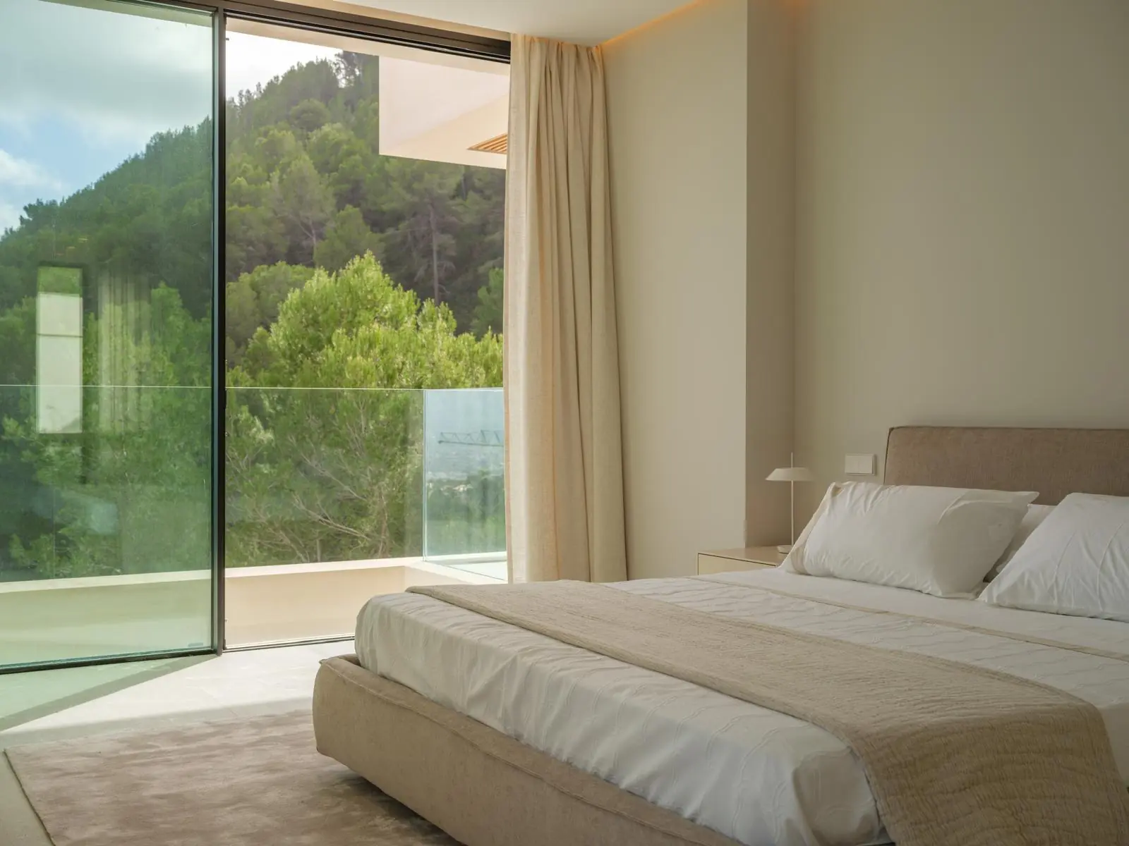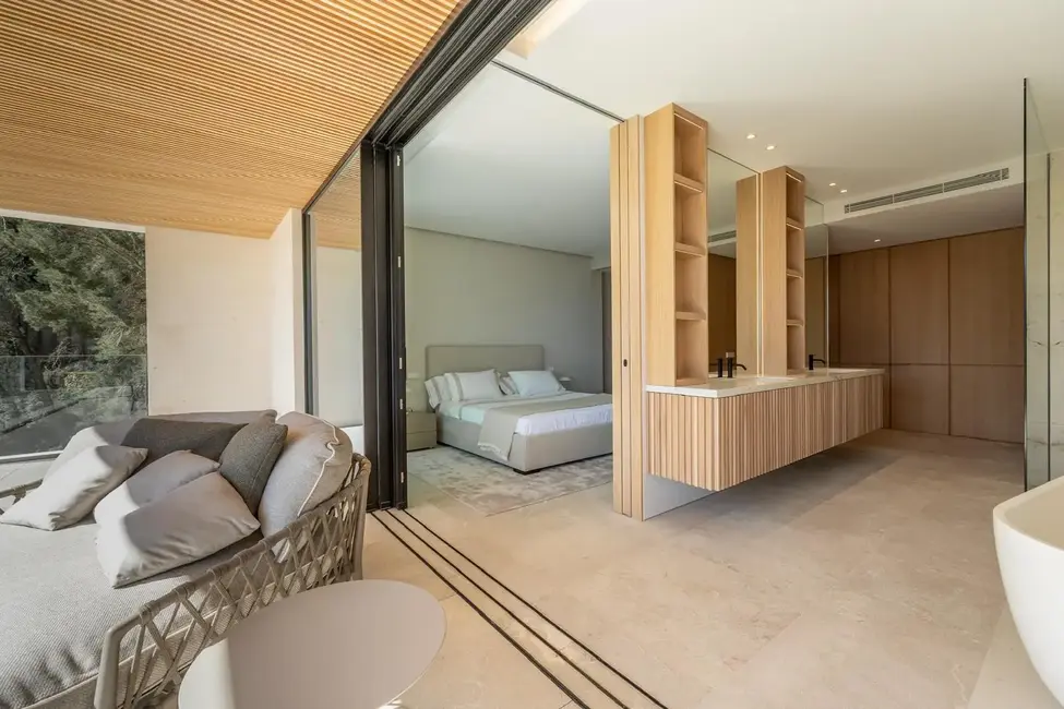 En la planta superior se encuentra el dormitorio principal con vestidor y un amplio cuarto de baño, así como otros dos dormitorios, cada uno con su propio cuarto de baño. La zona de entrada y el sótano albergan un espacioso garaje con capacidad para cuatro vehículos, un dormitorio independiente para el personal con cuarto de baño, salas técnicas y trasteros.
