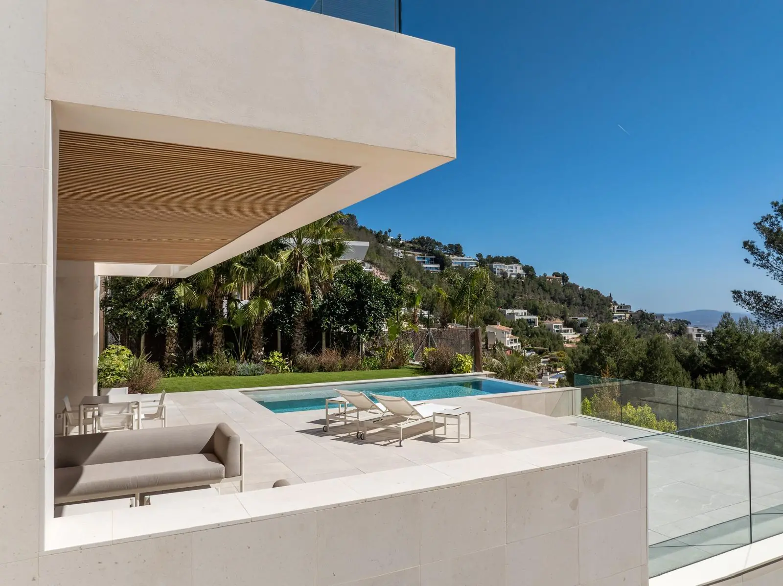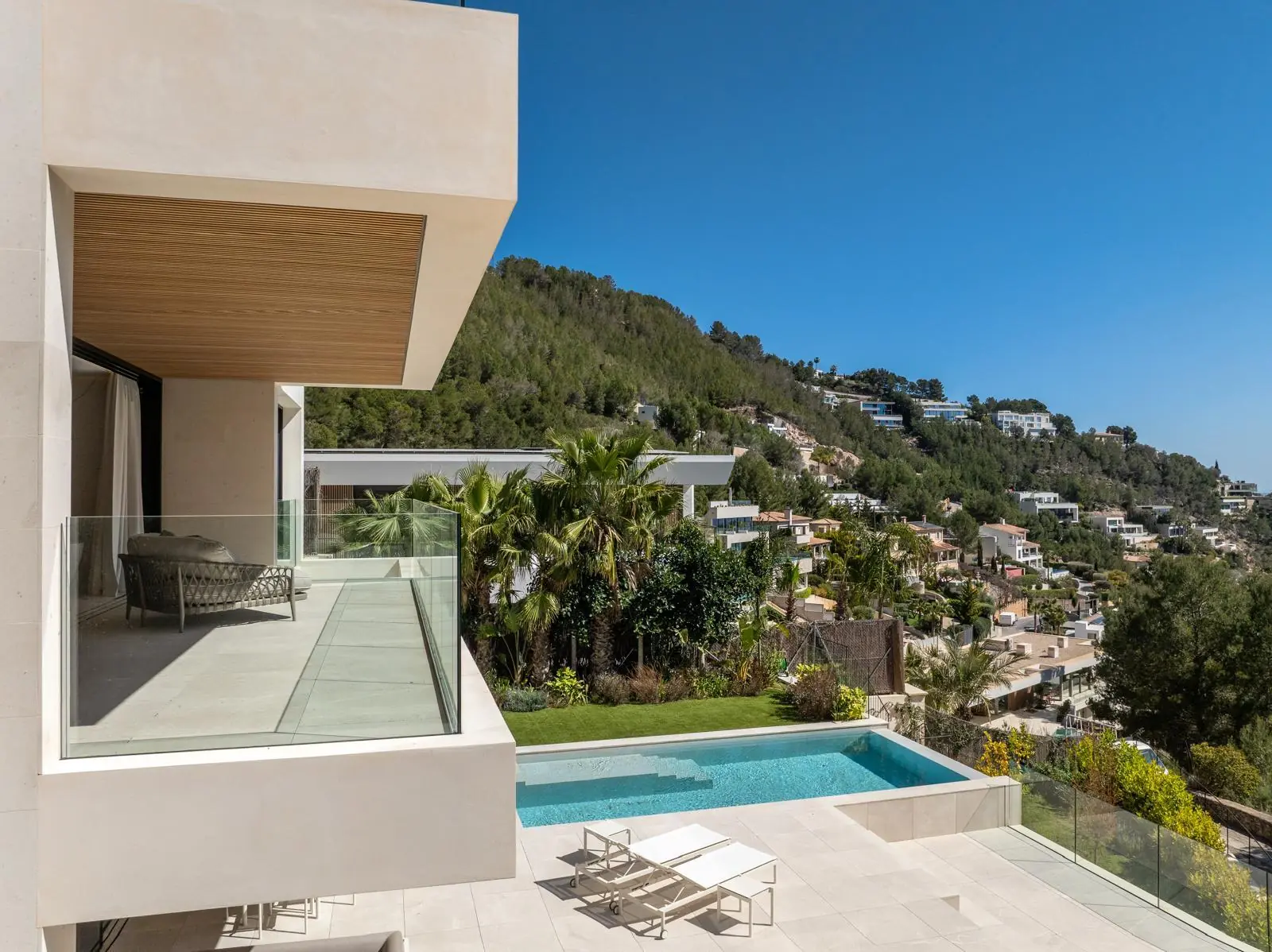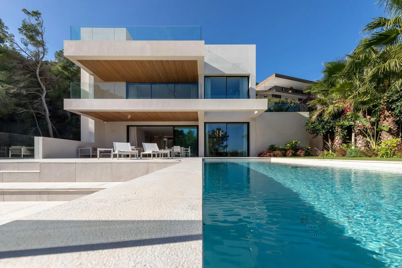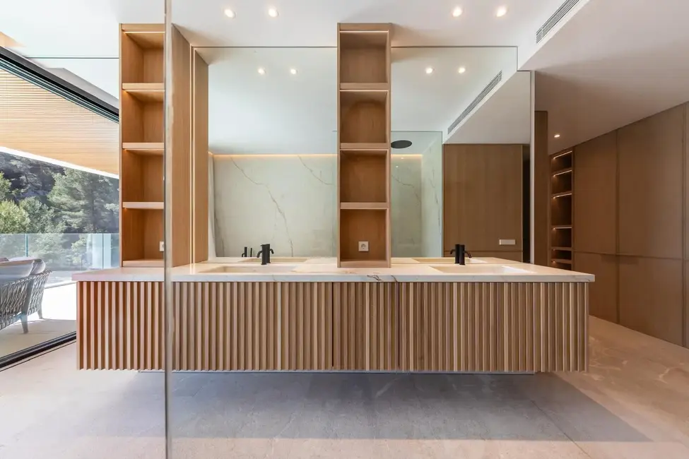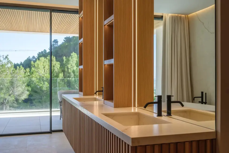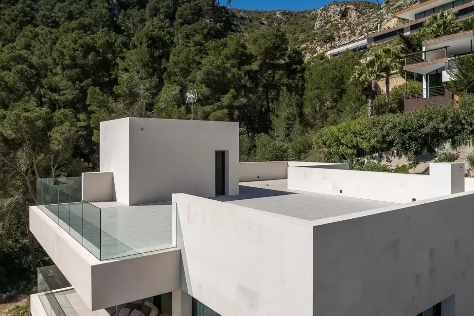 Esta excepcional villa de nueva construcción, construida en 2024, impresiona por su diseño claro y moderno, sus acabados de alta calidad y sus incomparables vistas panorámicas al paisaje circundante de Son Vida, una de las zonas residenciales más exclusivas de Mallorca. Situada en una parcela de aproximadamente 1000 m², la propiedad ofrece una generosa superficie habitable de unos 677 m², distribuidos en tres plantas.