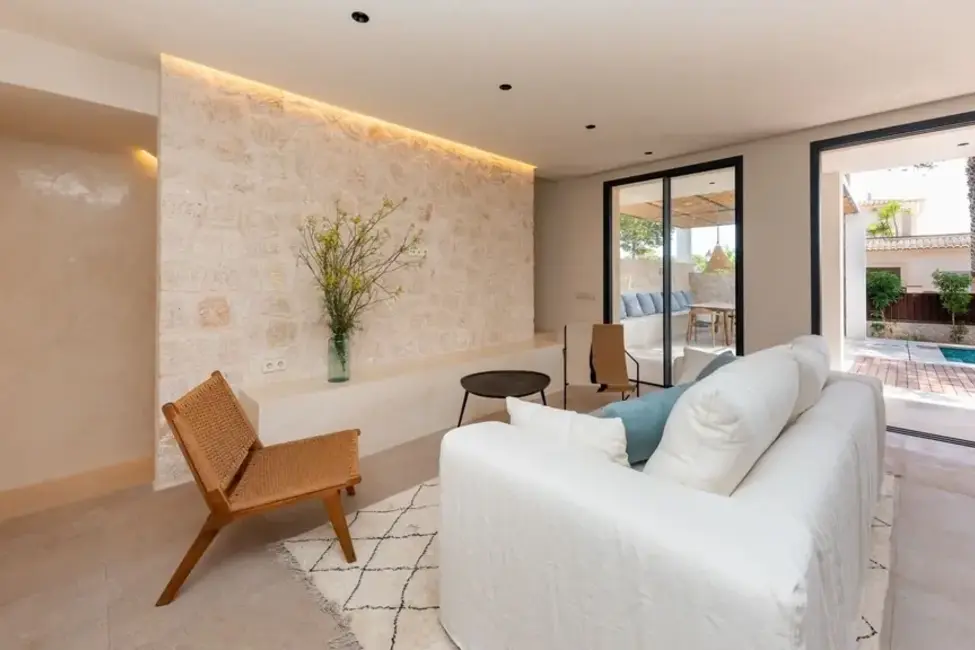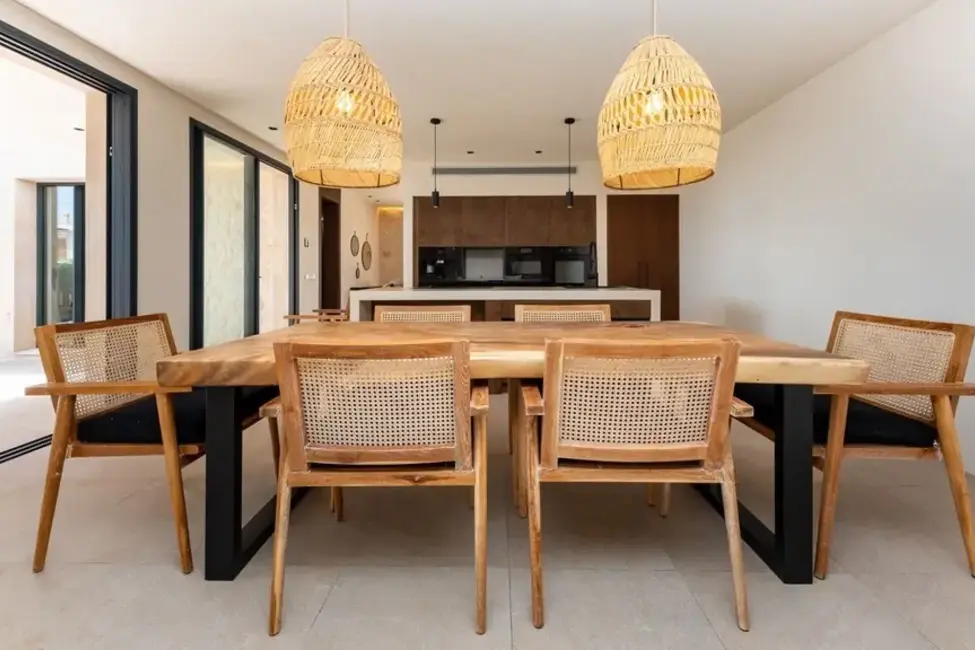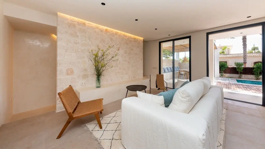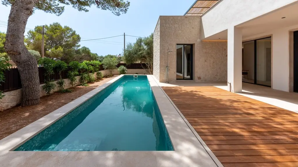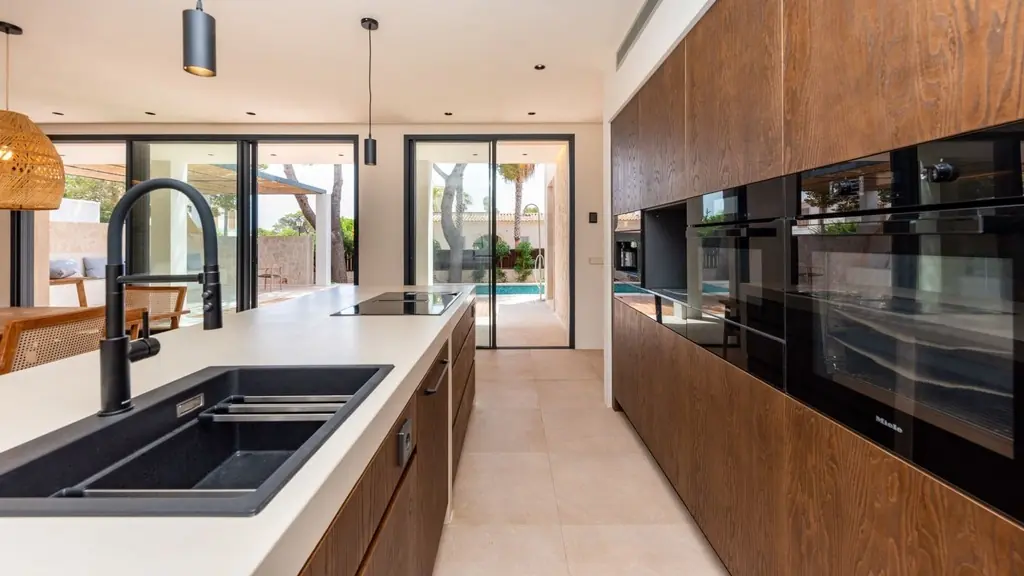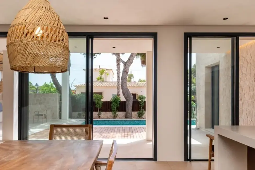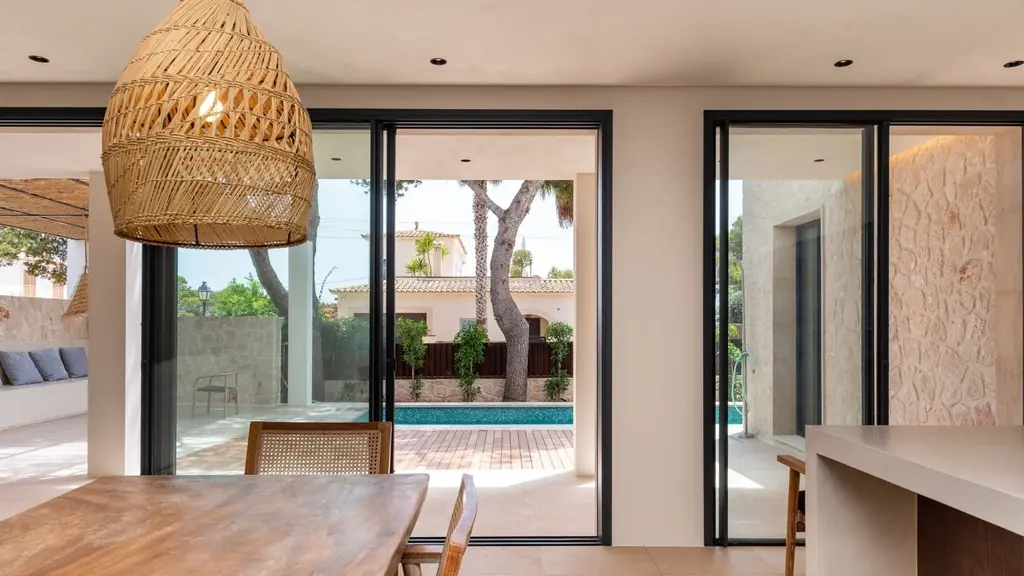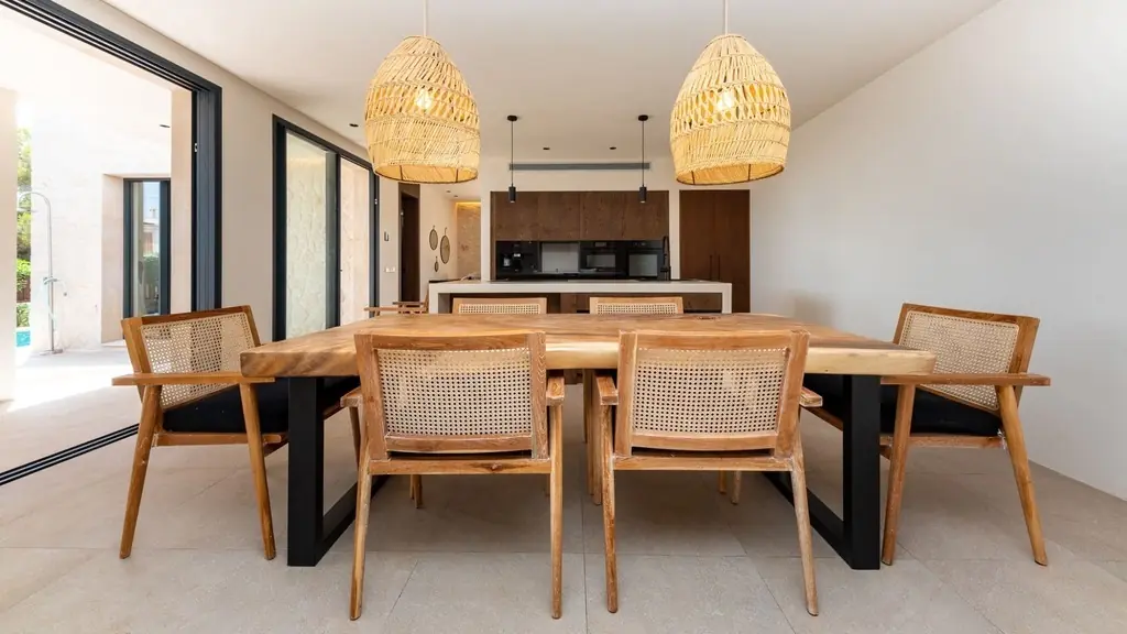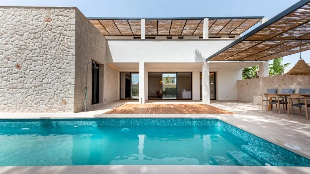Planta baja: amplia sala de estar/comedor abierta con cocina de diseño, acceso directo a la pérgola y zona de descanso de verano junto a la piscina. Una habitación doble con baño privado.