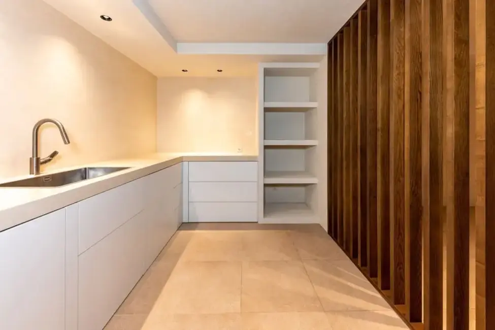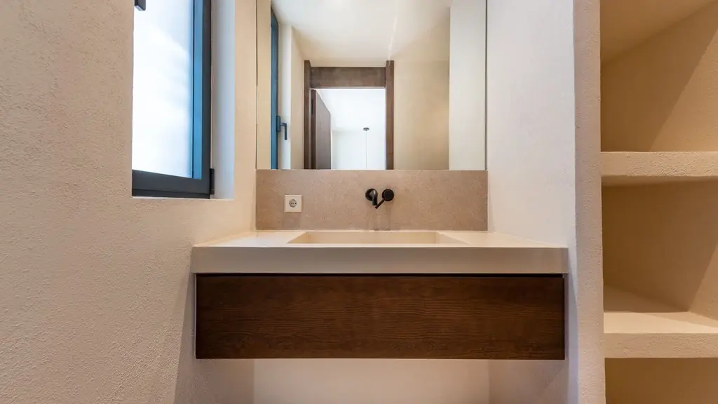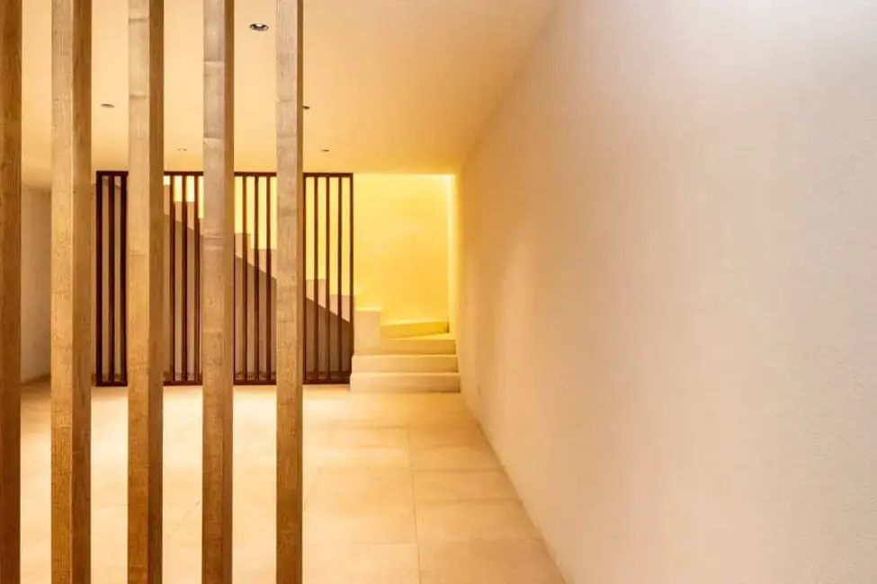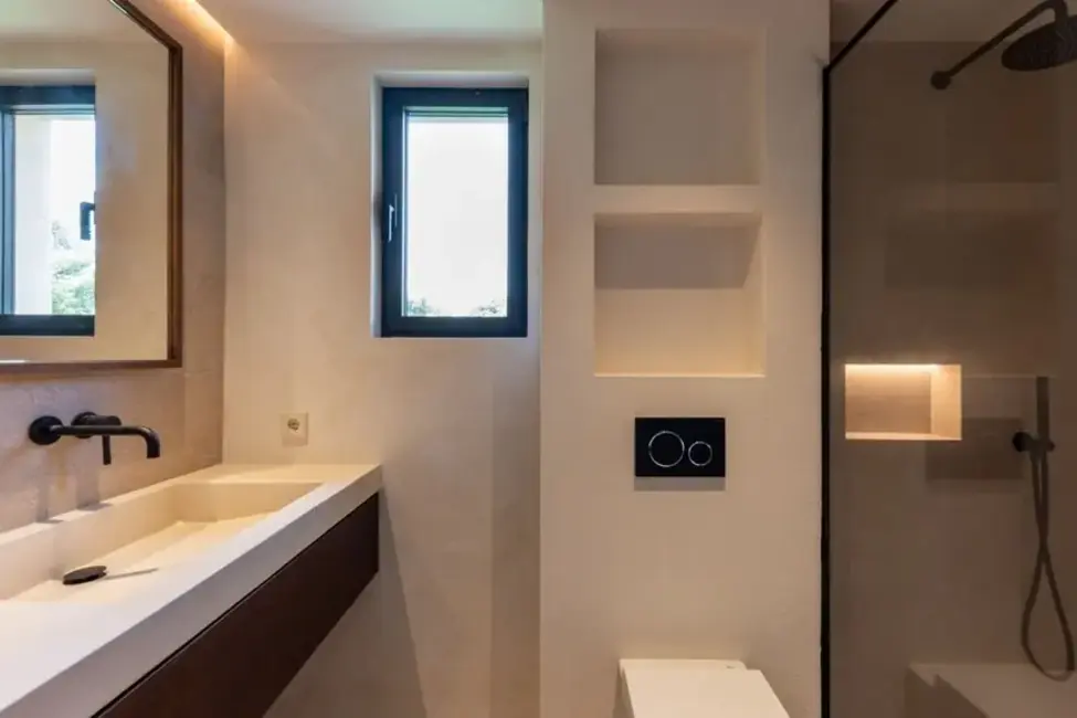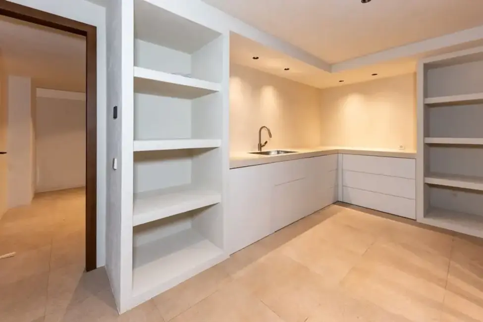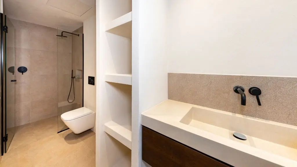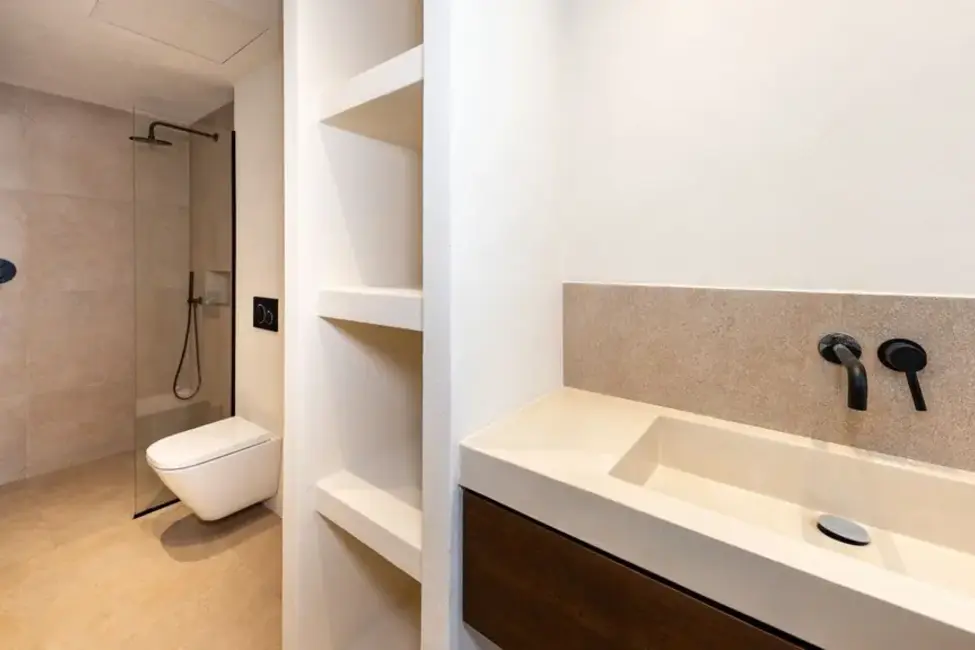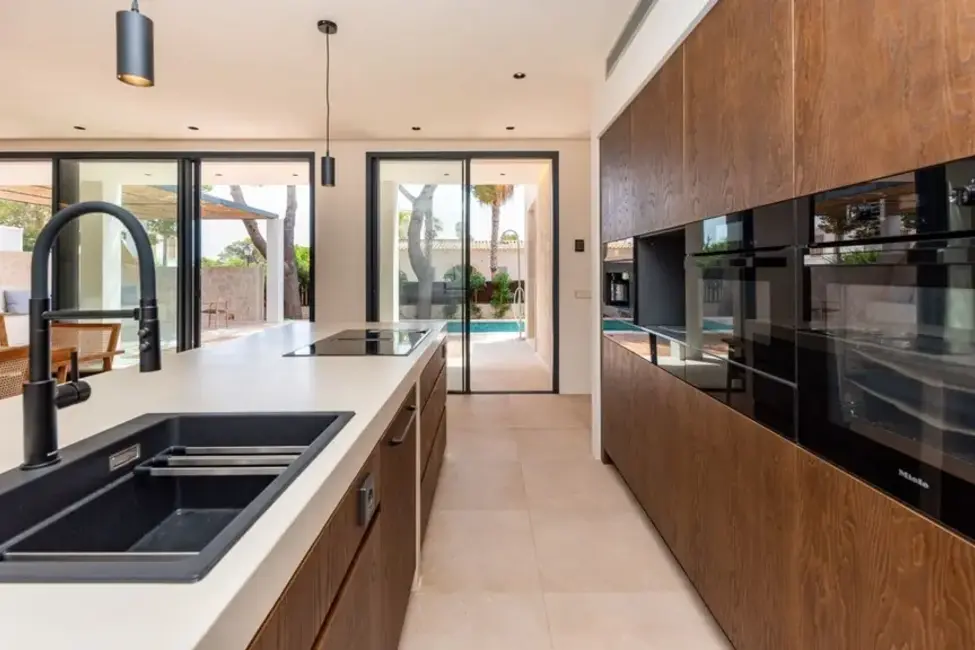 Planta baja: amplia sala de estar/comedor abierta con cocina de diseño, acceso directo a la pérgola y zona de descanso de verano junto a la piscina. Una habitación doble con baño privado.