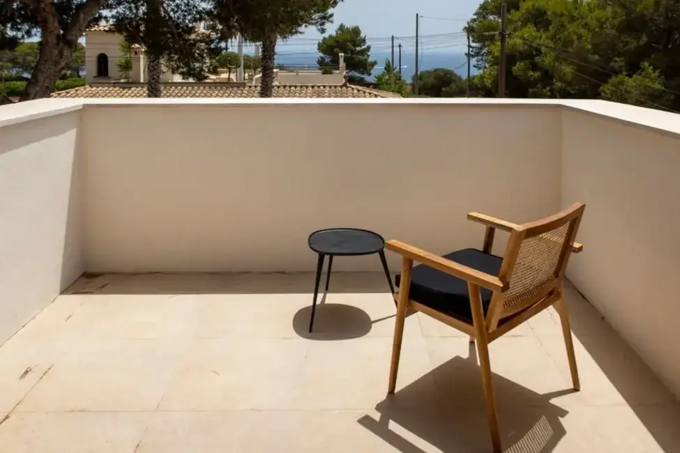 Primera planta: tres dormitorios, todos con baño en suite y terraza con vistas al mar.