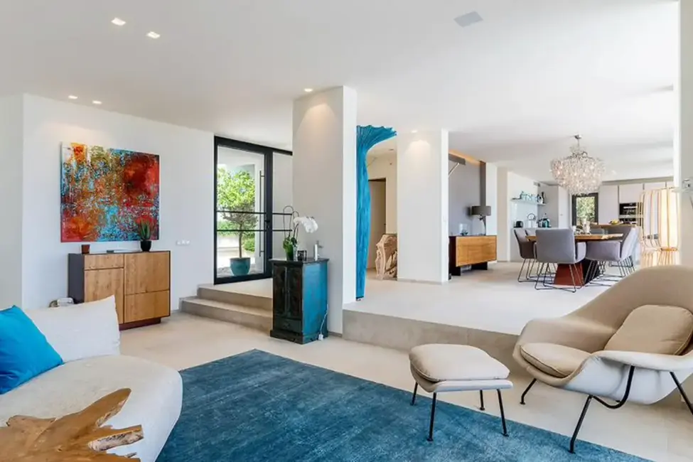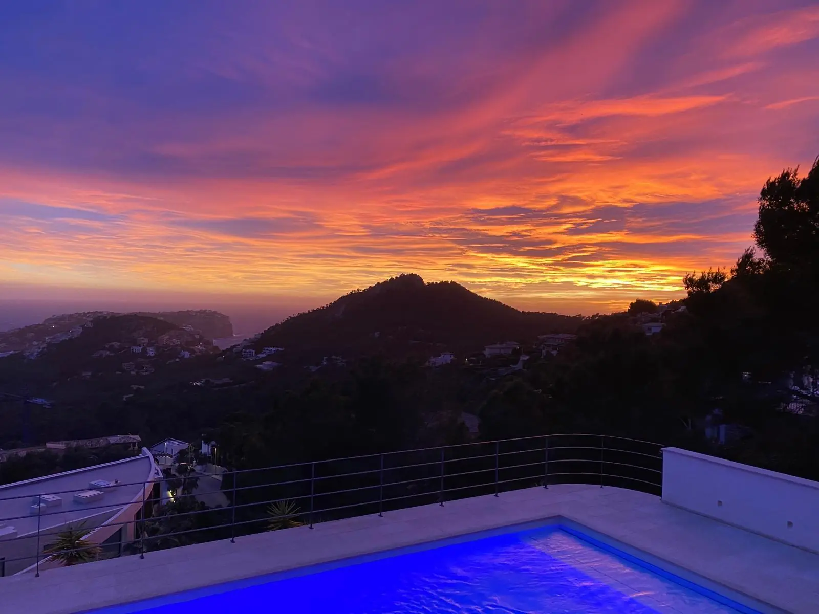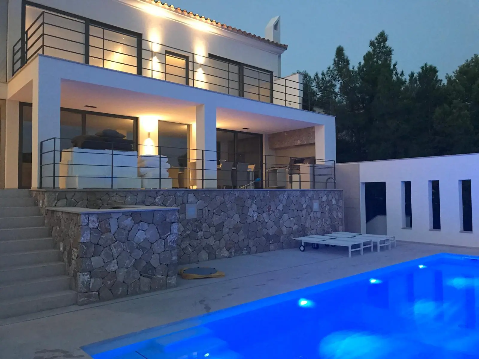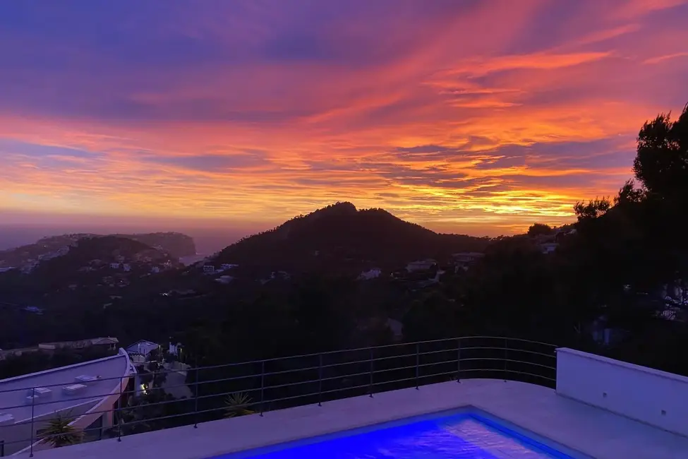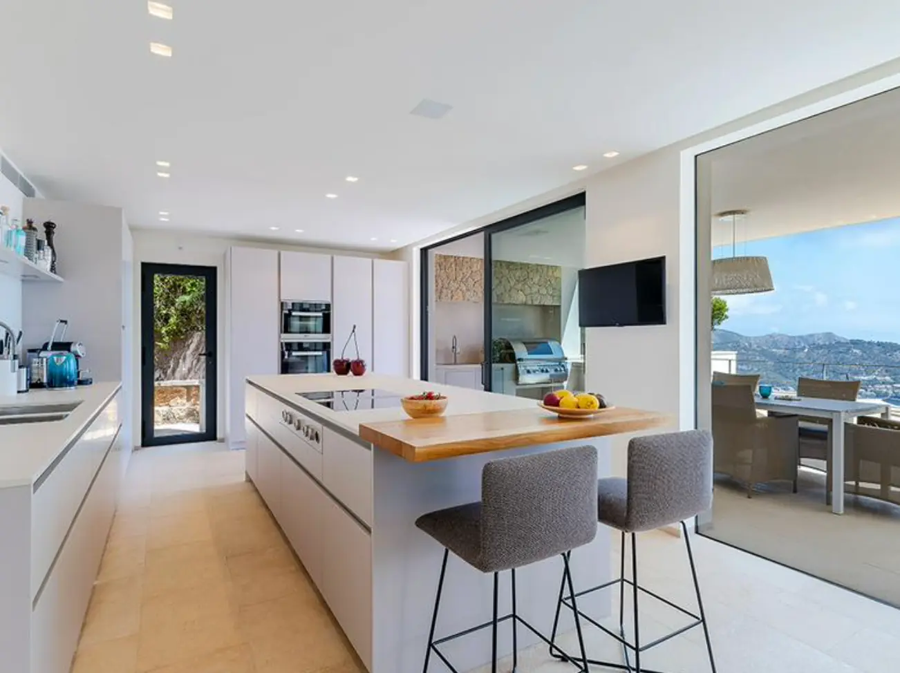 En la planta superior hay tres dormitorios, cada uno con su propio cuarto de baño y acceso directo a una amplia terraza que ofrece unas vistas maravillosas. En la planta baja hay un amplio salón-comedor con cocina abierta, una acogedora chimenea y una habitación de invitados con cuarto de baño propio y entrada independiente. Desde esta planta se accede a varias terrazas y a una piscina climatizada de agua salada.
