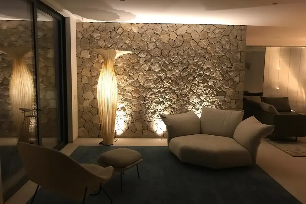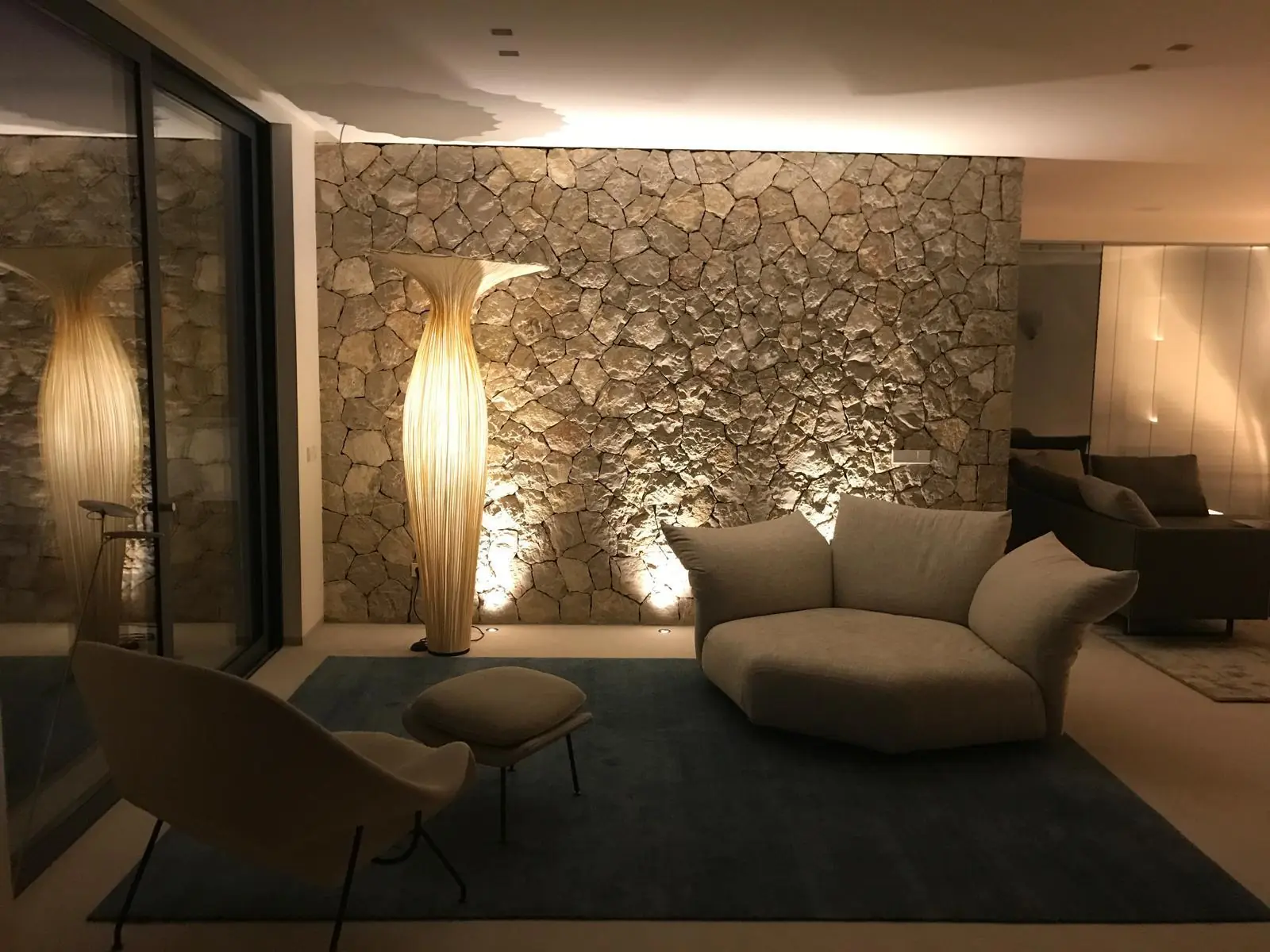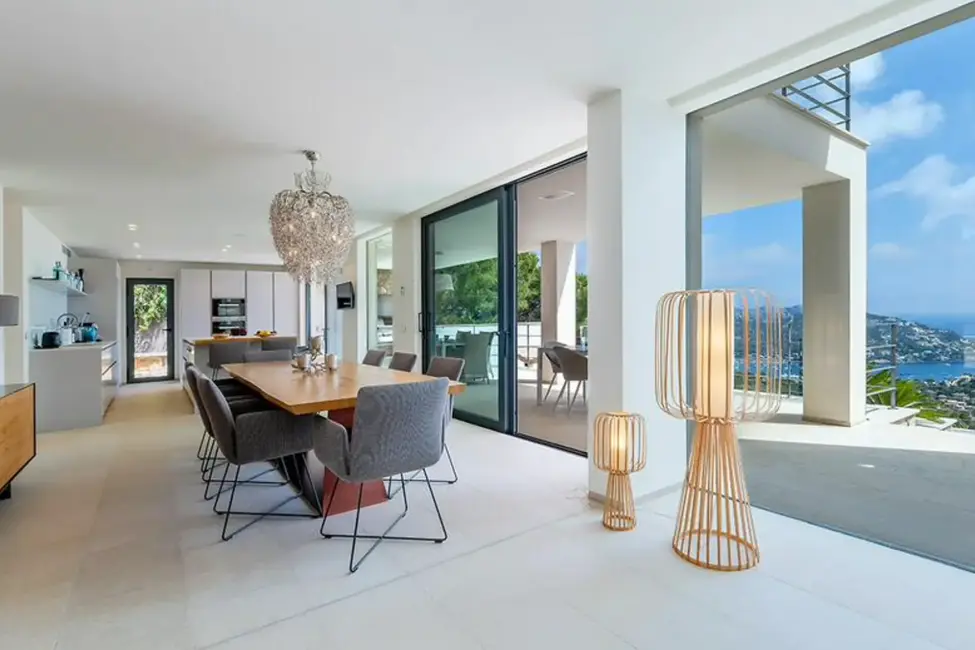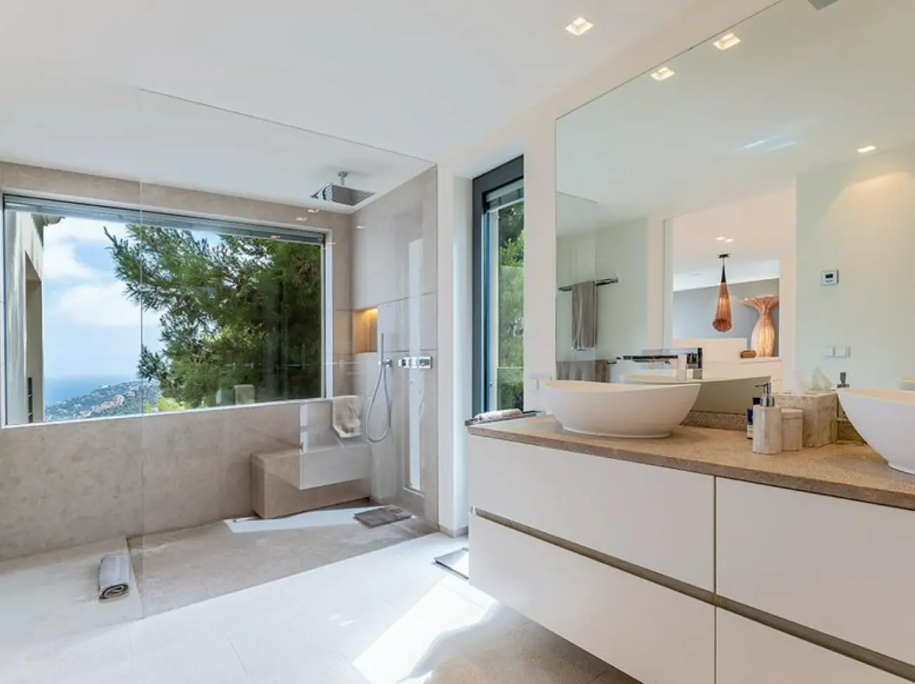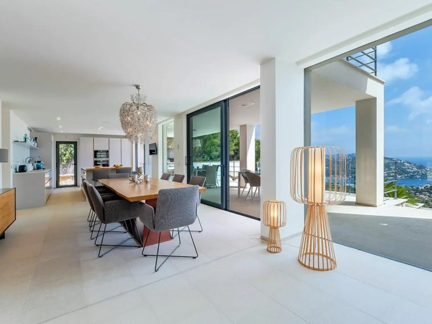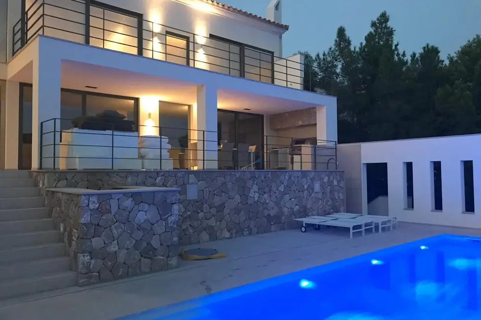 En la planta superior hay tres dormitorios, cada uno con su propio cuarto de baño y acceso directo a una amplia terraza que ofrece unas vistas maravillosas. En la planta baja hay un amplio salón-comedor con cocina abierta, una acogedora chimenea y una habitación de invitados con cuarto de baño propio y entrada independiente. Desde esta planta se accede a varias terrazas y a una piscina climatizada de agua salada.