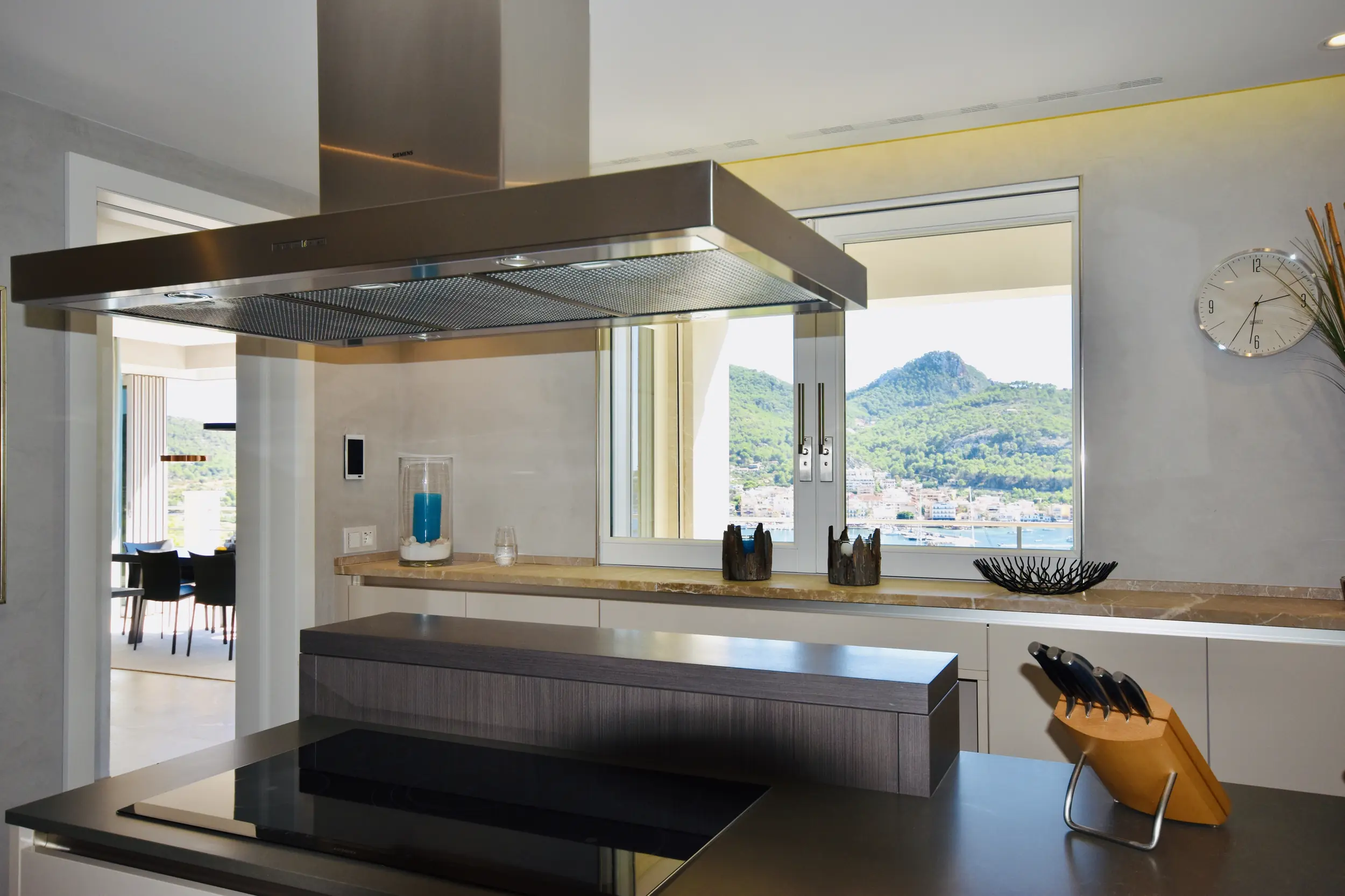 Im oberen Bereich des Hauses liegt das Wohnzimmer, das Zugang zur behaglichen Veranda sowie zu einer weitläufigen Terrasse mit Hafenblick gewährt, eine von Birgit Müller designte, topmoderne Küche, ein Esszimmer und ein Gäste-WC. Die Residenz umfasst insgesamt fünf Schlafzimmer und vier Badezimmer, wobei zwei davon en suite sind. Der Wellnessbereich ist bestückt mit einer Sauna, einem Erholungsbereich und einem großzügig gestalteten Duschbereich.