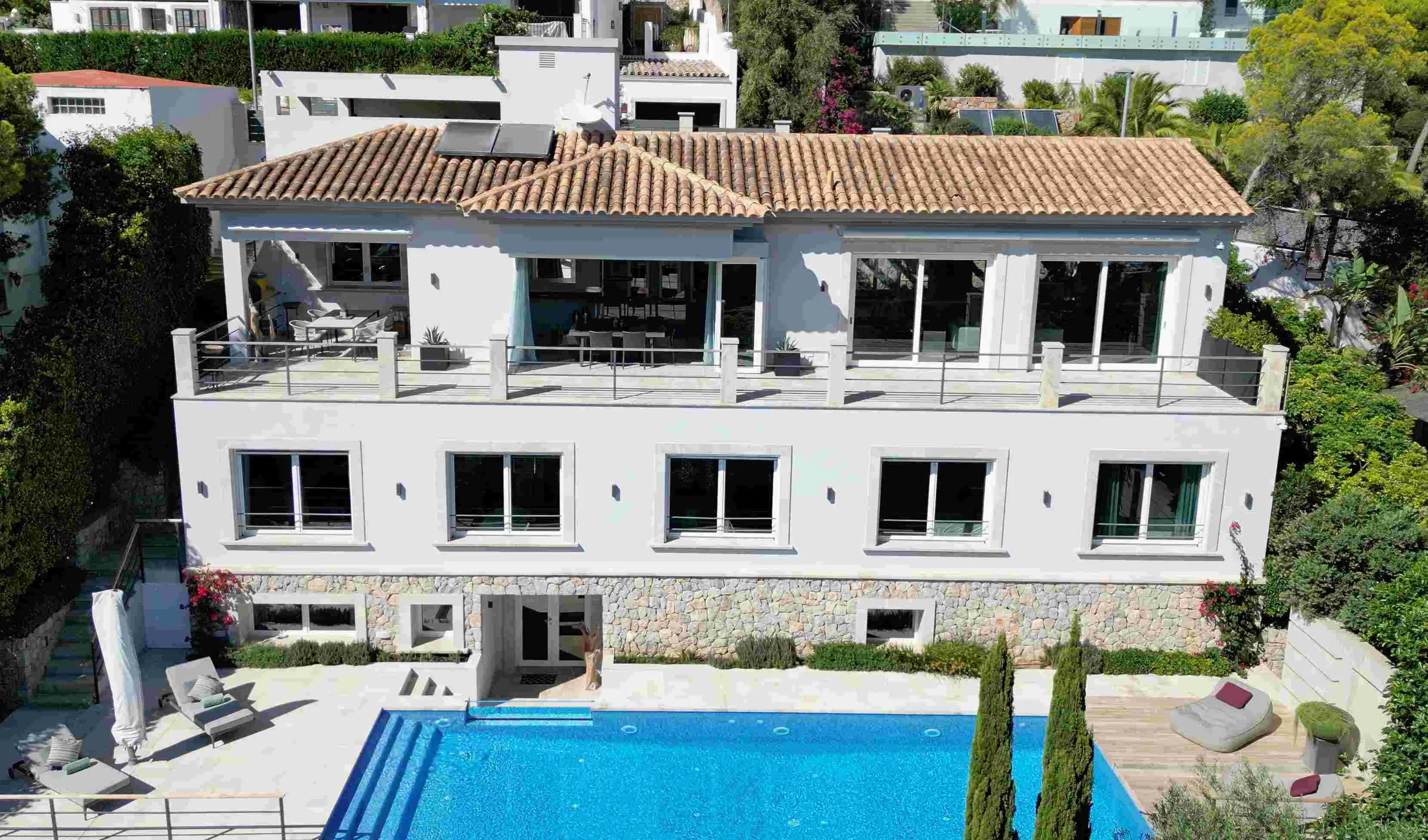 Zum Entspannen in der Sonne laden der 14 x 4 m² umfassende Infinity-Pool und die aus schickem Stein gefertigte Terrasse ein. Des Weiteren verfügt die Villa über zusätzliche Annehmlichkeiten wie einen Aufzug, einen Carport, Fußbodenheizung, Klimaanlage w/k, TV, Sound-System, GIRA Smarthome, Occhio & Deltalight Beleuchtung und vieles mehr. Die Villa ist vollständig möbliert und einsatzbereit.