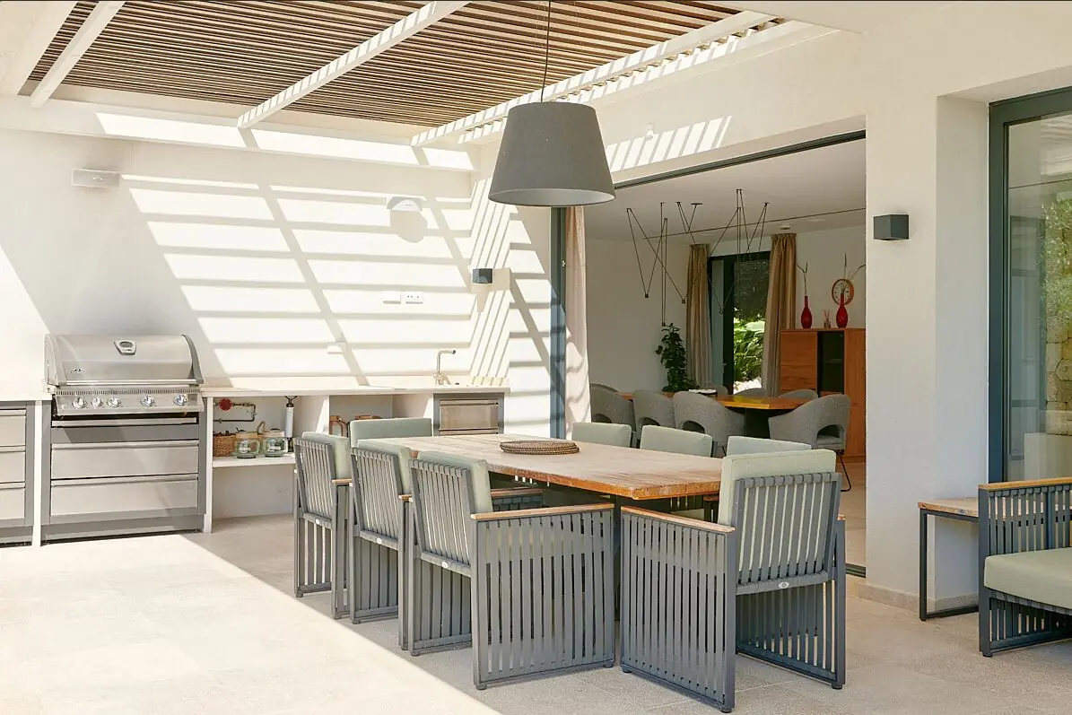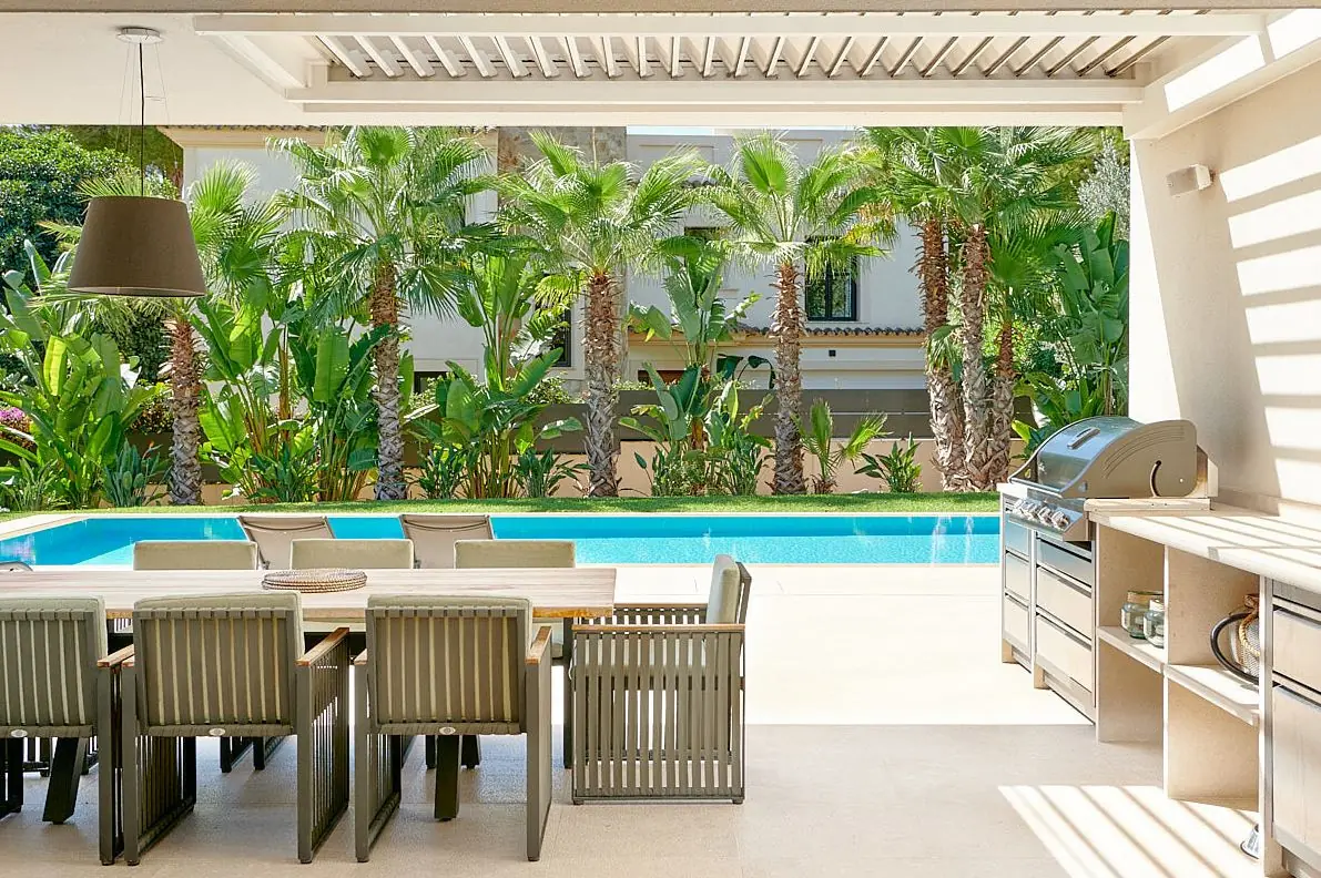 Der Außenbereich gleicht einer privaten Wohlfühloase: Ein 16 x 4 Meter großer, beheizter Infinity-Pool erstreckt sich entlang der mediterranen Gartenlandschaft, gesäumt von Palmen und immergrünen Pflanzen. Mehrere Terrassenbereiche, eine Outdoor-Küche mit BBQ sowie gemütliche Loungezonen schaffen ein Ambiente, das an ein Boutique-Resort erinnert.