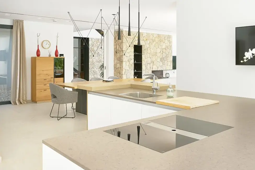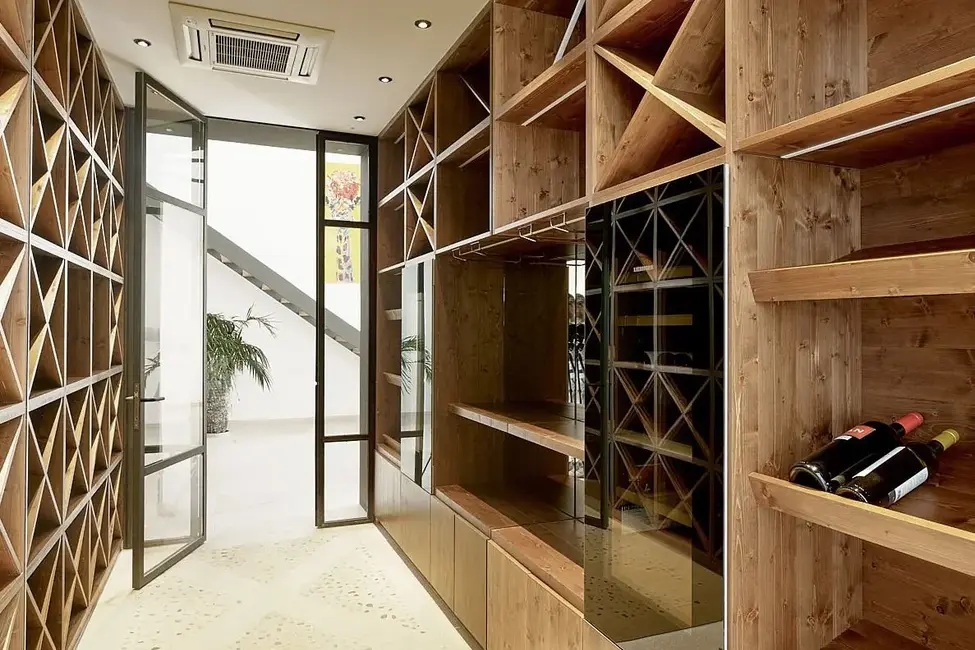 Klare Linien, großzügige Raumhöhen und bodentiefe Fenster prägen das Wohnkonzept. Bereits im Entrée beeindruckt die doppelgeschossige Architektur, begleitet von einer stilvoll inszenierten Vinothek, die den exklusiven Charakter des Hauses unterstreicht. Die Innenräume sind offen gestaltet und verbinden Wohn-, Ess- und Küchenbereich zu einer harmonischen Einheit, die nahtlos in die überdachten Terrassen und den Garten übergeht.