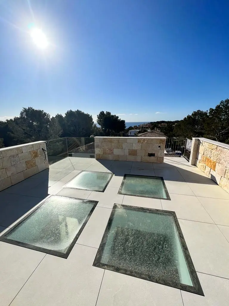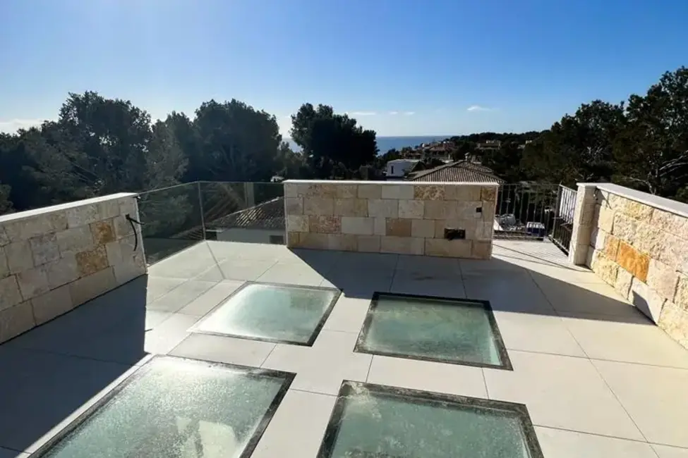 Die obere Etage beherbergt zwei weitere Schlafzimmer, ein Badezimmer, einen Bürobereich und eine wundervolle Sonnenterrasse. Zusätzlich gibt es eine schöne Dachterrasse mit Blick auf das Meer und die umliegende Landschaft. In der unteren Ebene der Villa befinden sich verschiedene Abstellräume und Technikräume. Das gesamte Anwesen ist mit hochwertigen Materialien ausgestattet und verbindet eleganten Stil mit modernem Komfort.