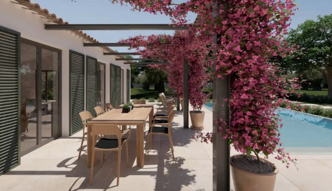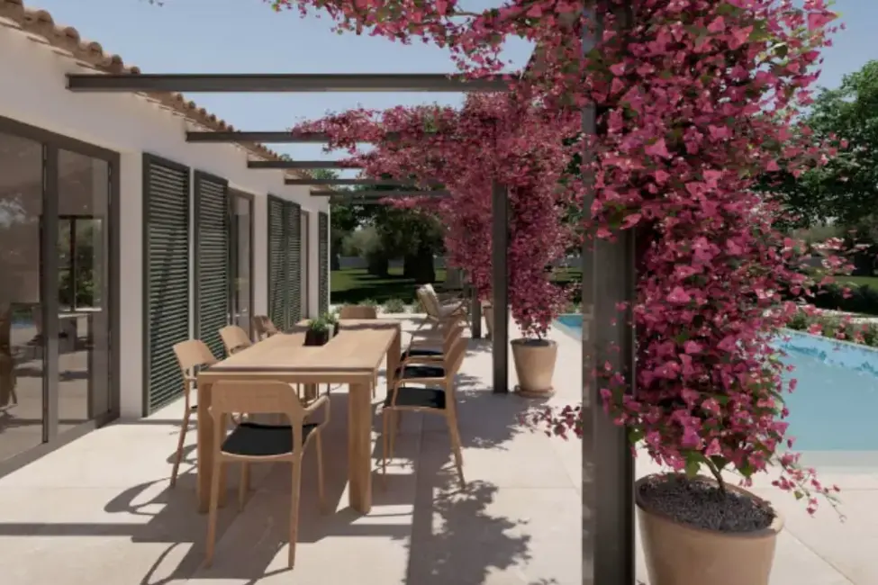 Masterschlafzimmer als auch vom Wohnbereich aus. Eine kleine Pergola bietet Platz