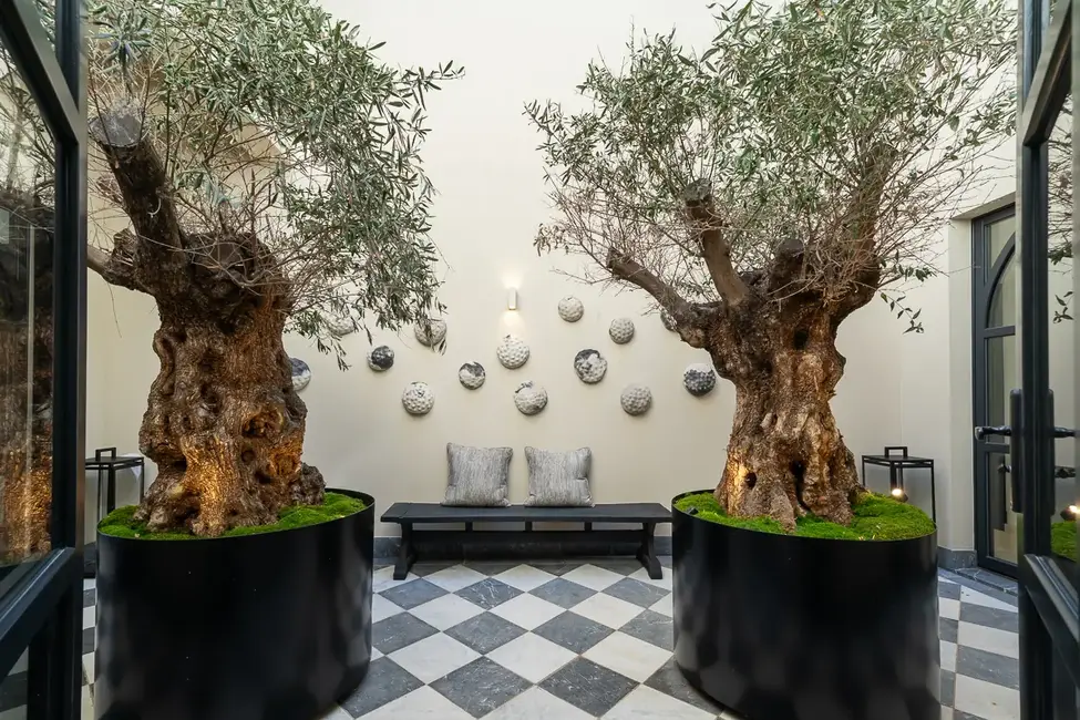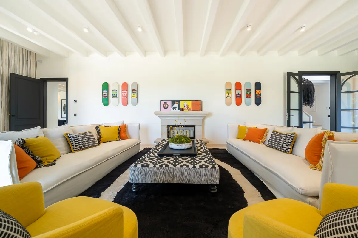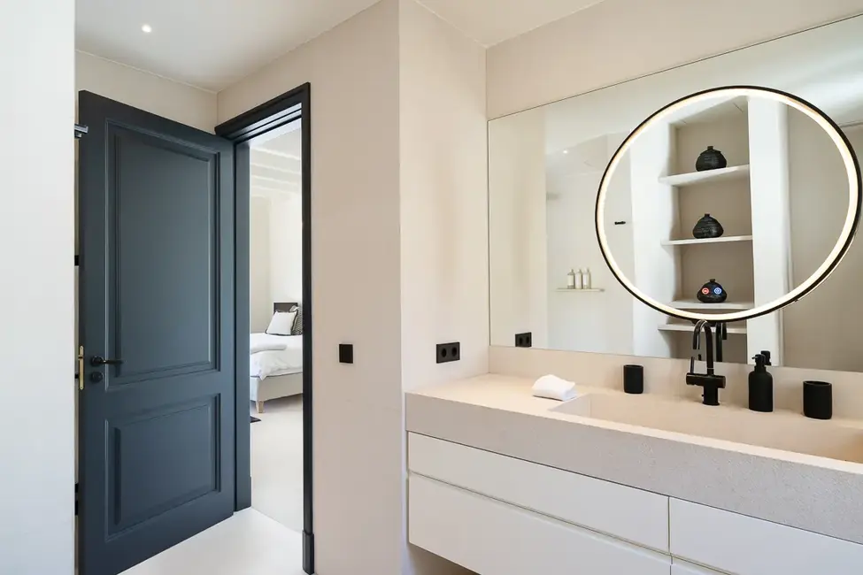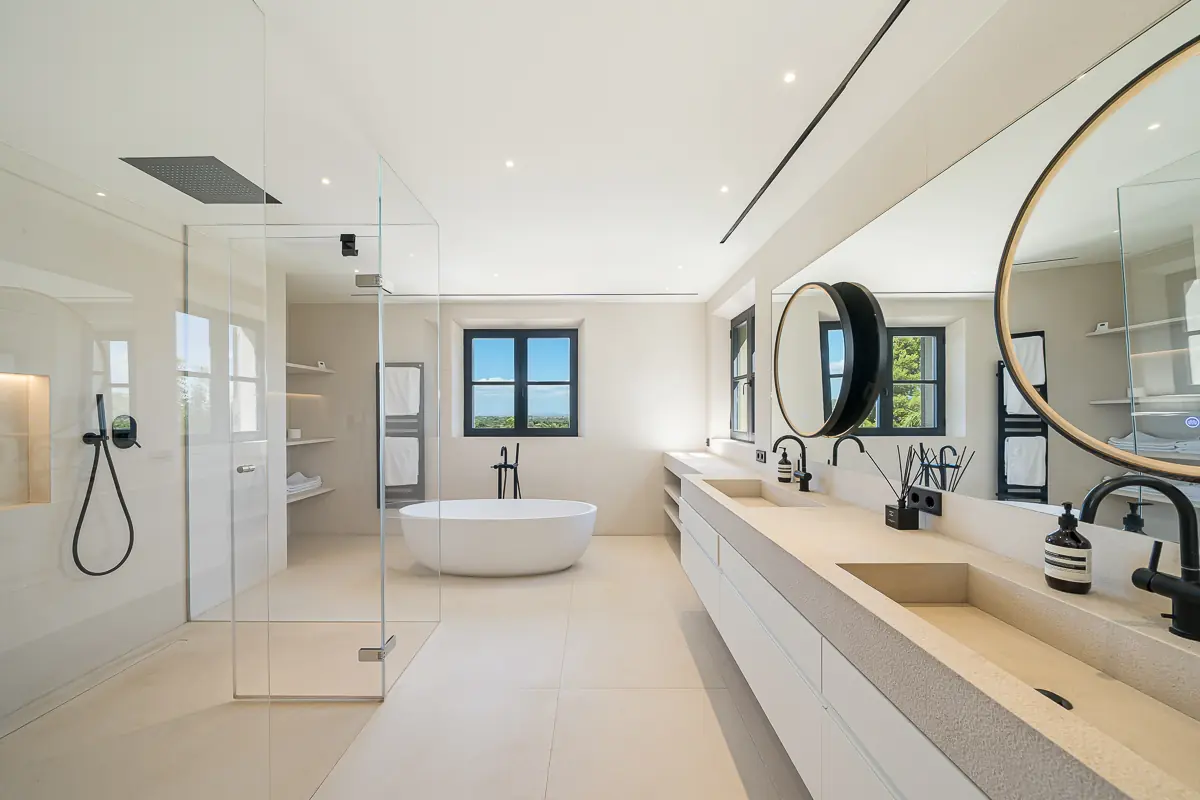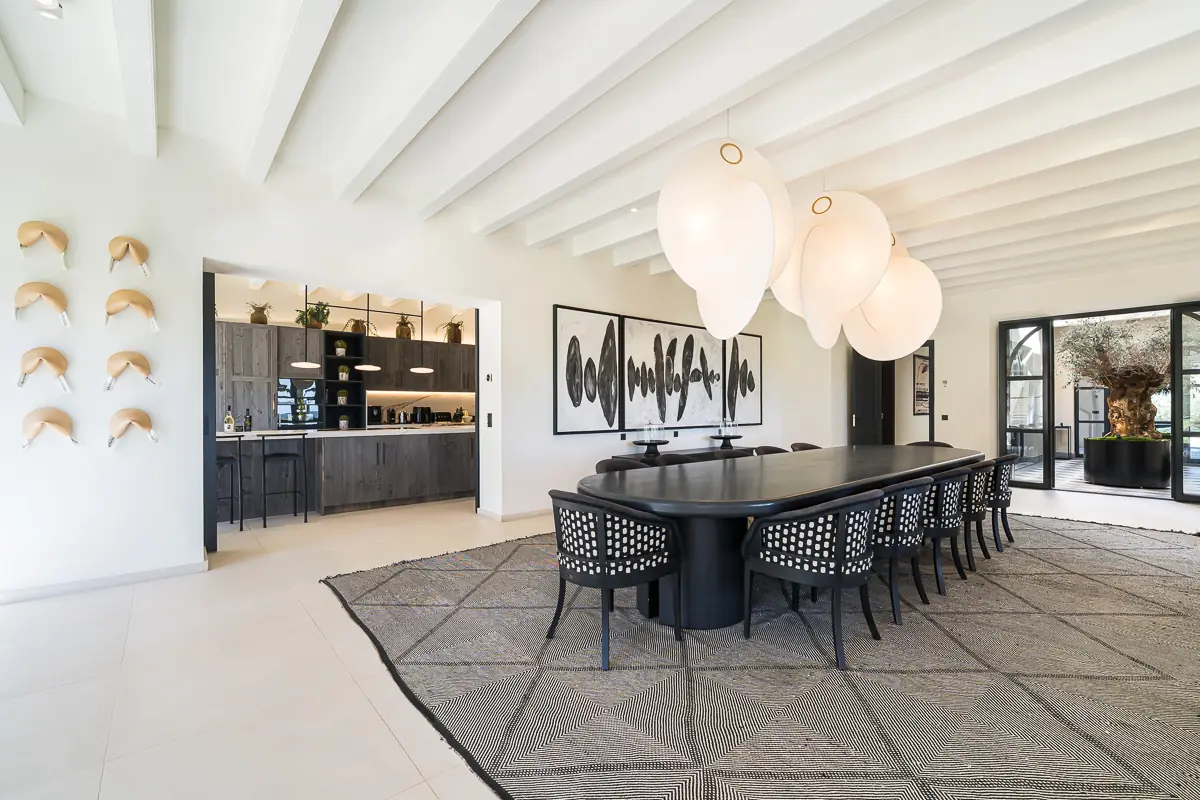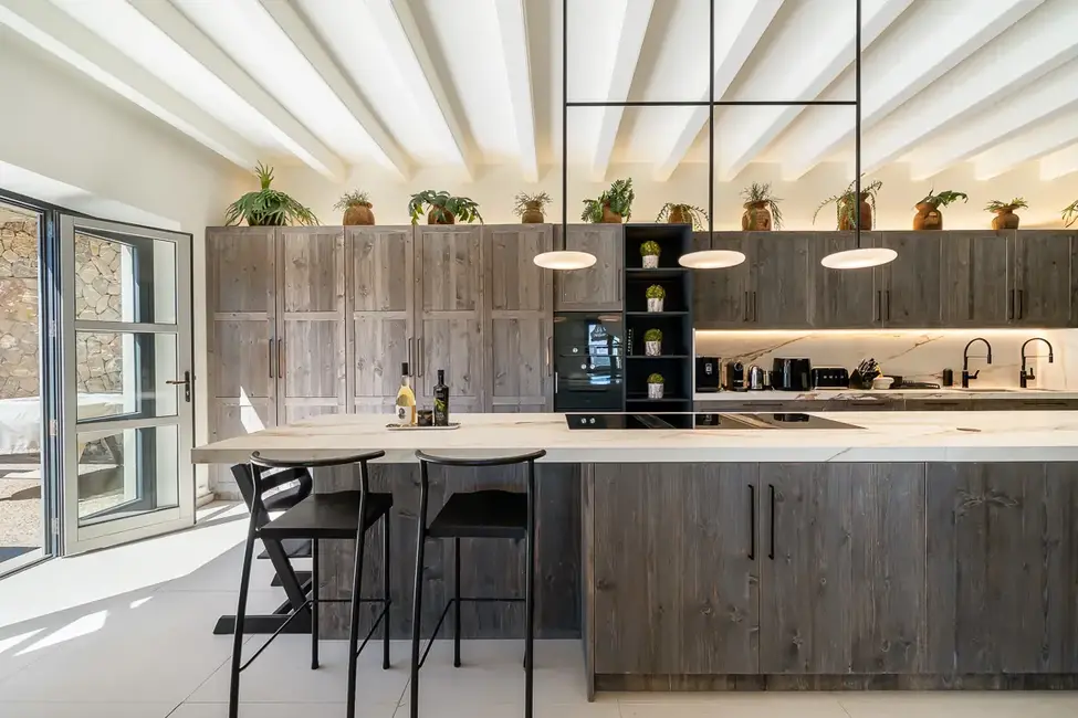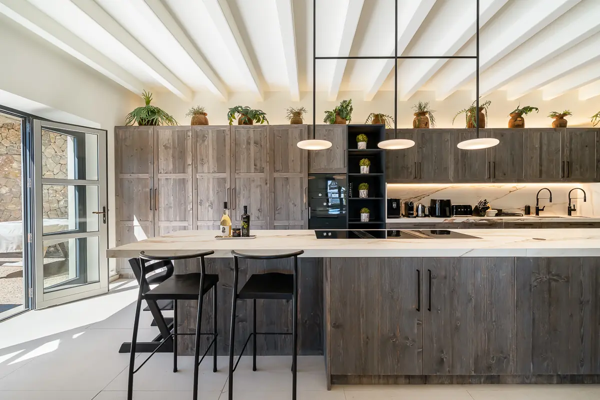 Das Interieur beeindruckt durch edle Natursteinböden, handgefertigte Holzarbeiten und eine harmonische Farbgestaltung. Großflächige, raumhohe Fenster durchfluten die Räume mit Tageslicht und schaffen fließende Übergänge zwischen Innen- und Außenbereich.