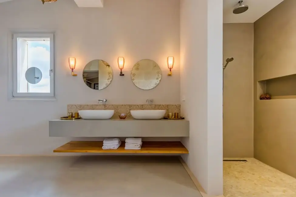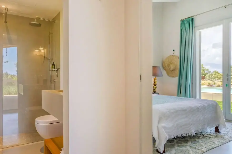 Insgesamt stehen fünf Schlafzimmer und fünf Badezimmer zur Verfügung, davon vier en suite. Zwei Schlafzimmer im Erdgeschoss sind barrierefrei konzipiert. Das großzügige Master-Schlafzimmer im Obergeschoss bietet Meerblick, ein luxuriöses Bad mit freistehender Designer-Badewanne sowie einen begehbaren Kleiderschrank. Von der großen Terrasse genießen Sie eine unverbaubare Aussicht auf die umliegende Landschaft und das Meer.