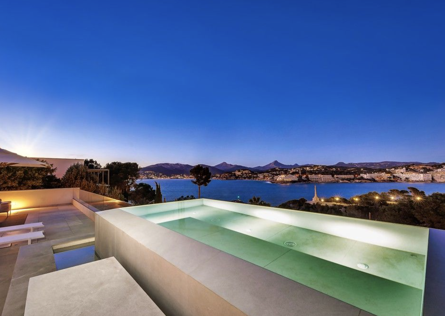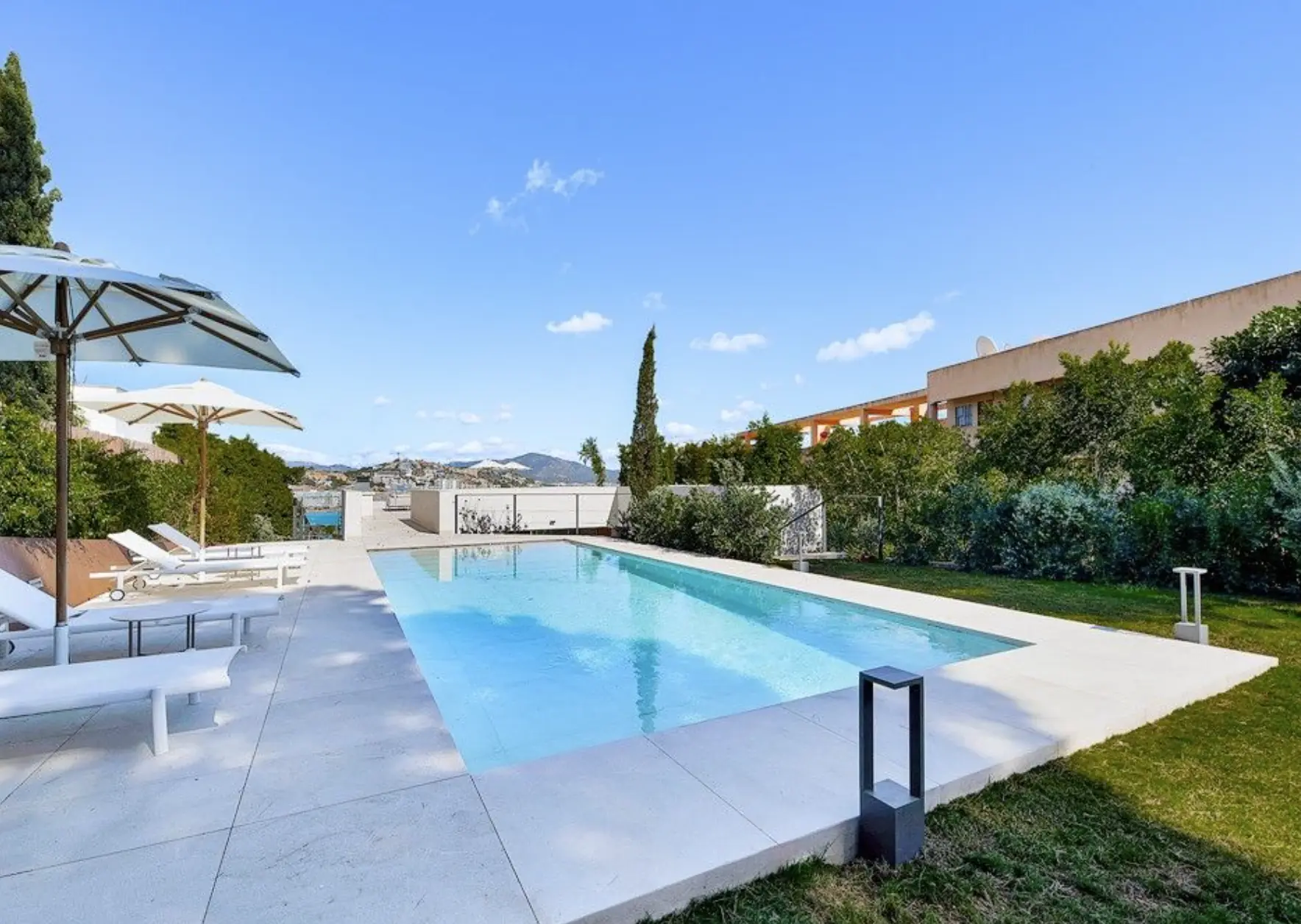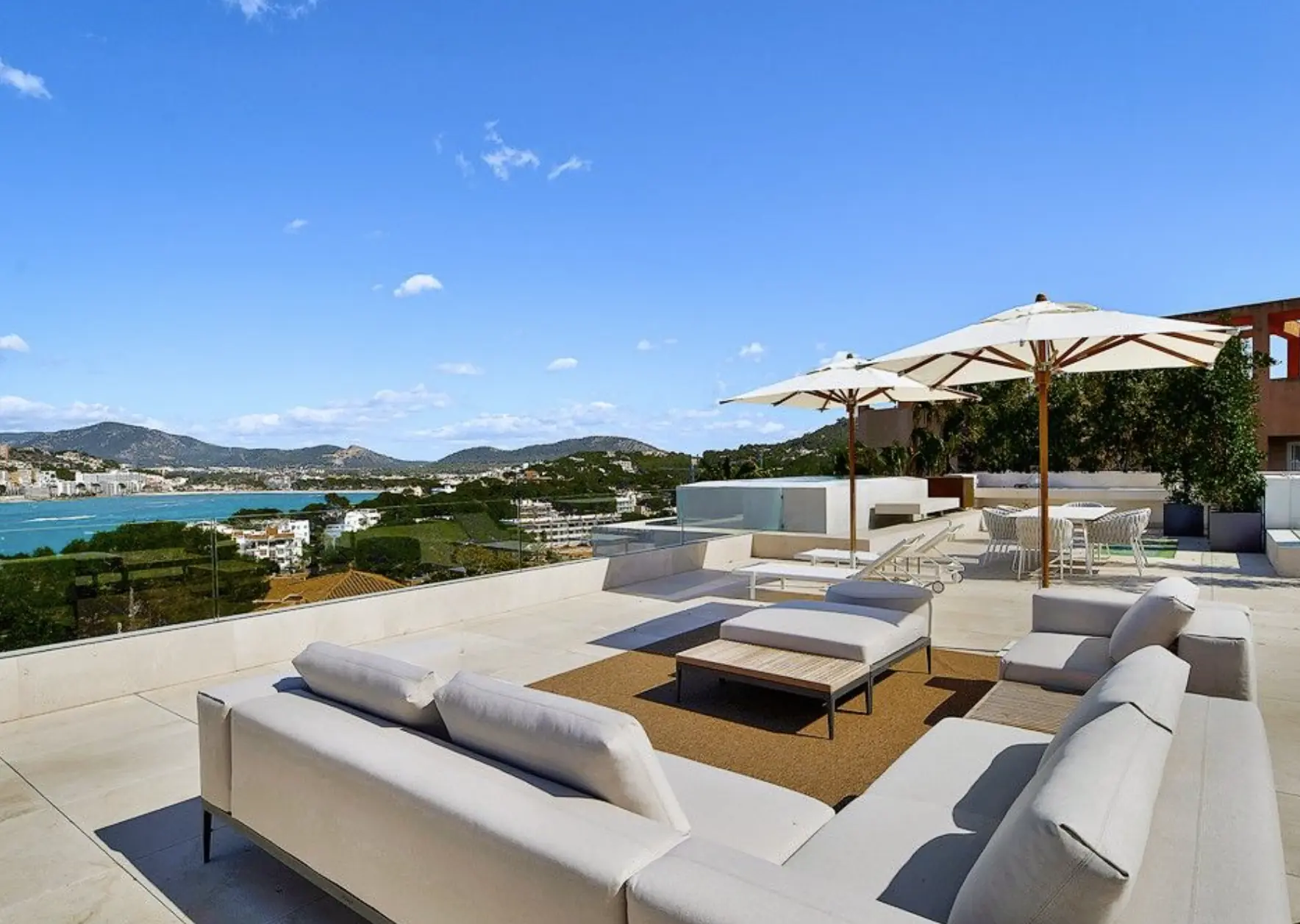 Die Dachterrasse ist ein besonderes Highlight dieser Immobilie und bietet neben einem Barbecue-Bereich einen Plungepool mit spektakulärem Blick auf das Meer und die Küstenlinie von Santa Ponsa. Zudem gibt es einen weiteren Pool für sportliche Aktivitäten und ein mediterran gestalteter Garten, der ideal für Familien ist.