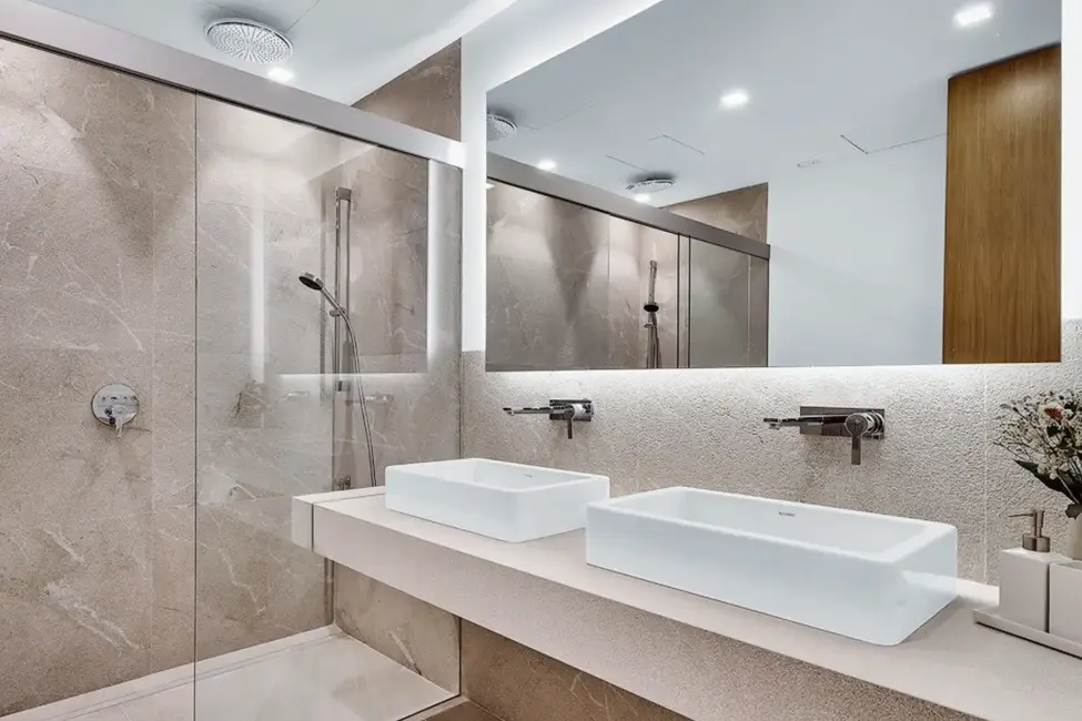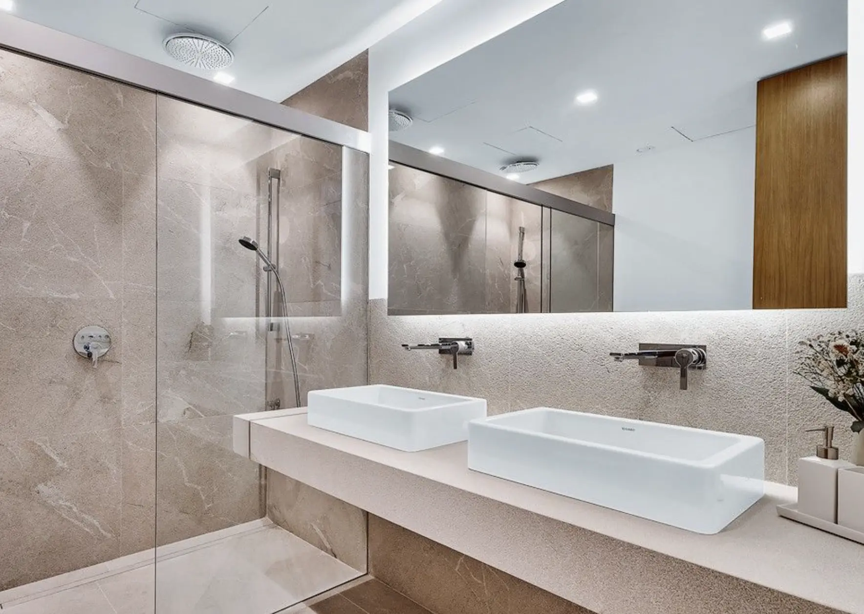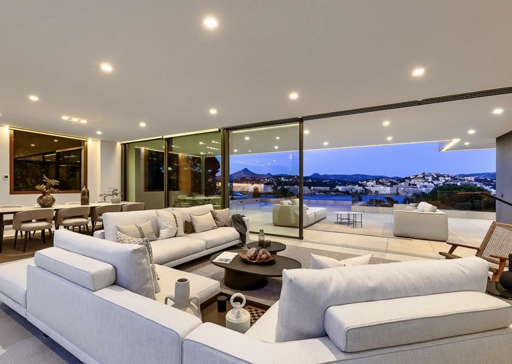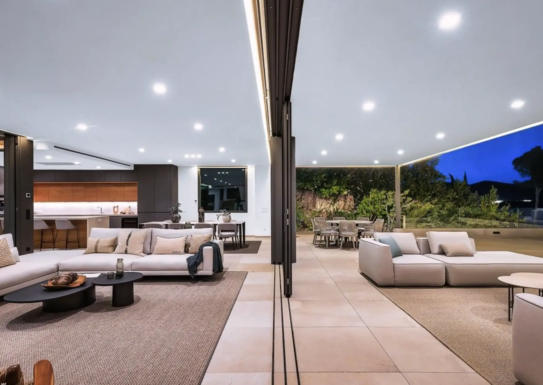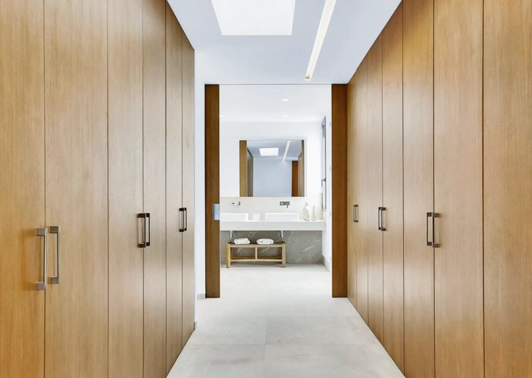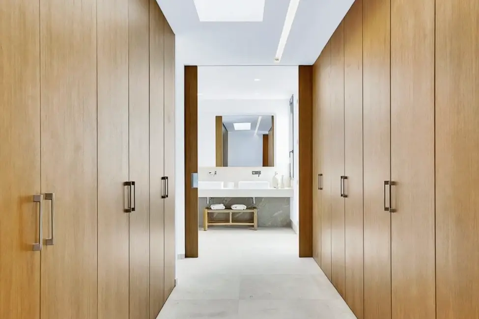 Die Wohnebene beherbergt die luxuriöse Mastersuite mit Ankleideraum und eigenem Bad sowie ein weiteres Schlafzimmer mit en-suite Badezimmer. Auf der unteren Ebene befinden sich drei weitere Schlafzimmersuiten und ein Büro, das sich problemlos in ein sechstes Schlafzimmer mit eigenem Bad umwandeln lässt. Ein moderner Aufzug verbindet die verschiedenen Ebenen von der großzügigen Garage bis zur Wohnebene, wodurch die Villa auch für Personen mit eingeschränkter Mobilität bestens geeignet ist.