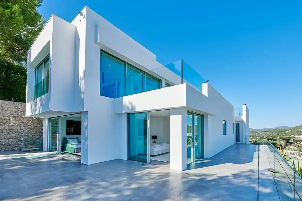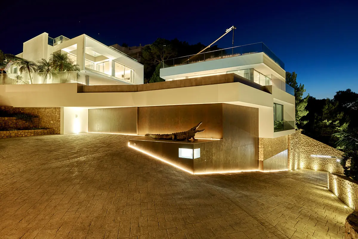 Casa Hollywood auf Ibiza ist ein Meisterwerk der modernen Architektur und Technologie, das in seiner exklusiven Lage in Siesta, Santa Eulalia del Río, überwältigende Aussichten auf das Mittelmeer und den Hafen bietet. Dieses 2020 fertiggestellte Anwesen vereint avantgardistische Architektur mit feinster deutscher Handwerkskunst, umgeben von der natürlichen Schönheit Ibizas. Es erstreckt sich über eine beeindruckende Wohnfläche von ca. 750 m² und bietet zusätzlich ca. 600 m² an Terrassenfläche, die ein luxuriöses und großzügiges Wohnambiente in vollkommener Privatsphäre ermöglichen.