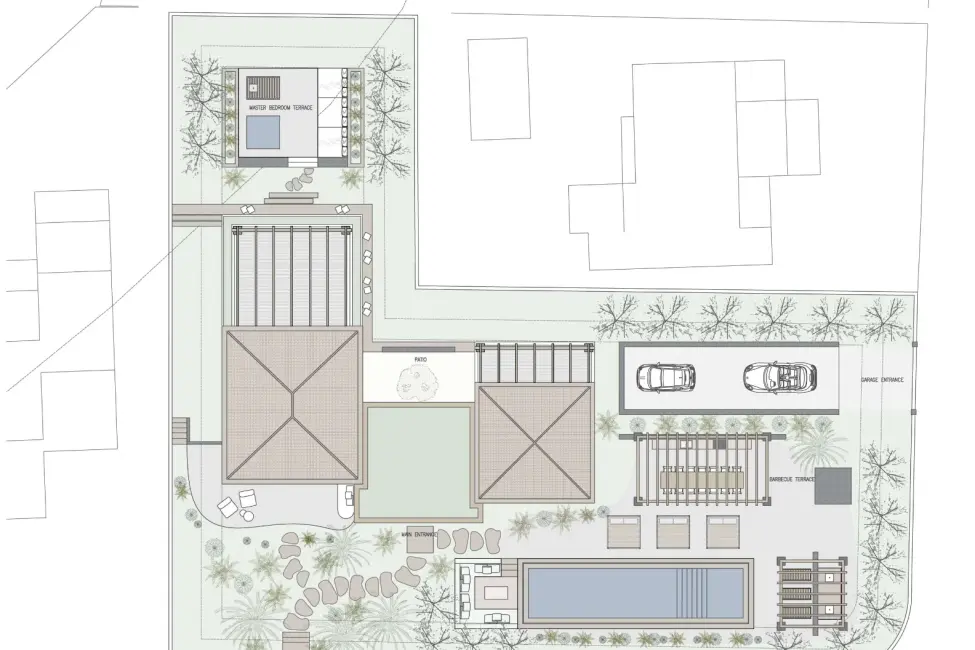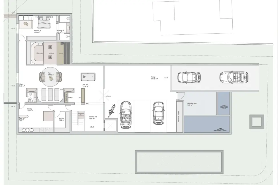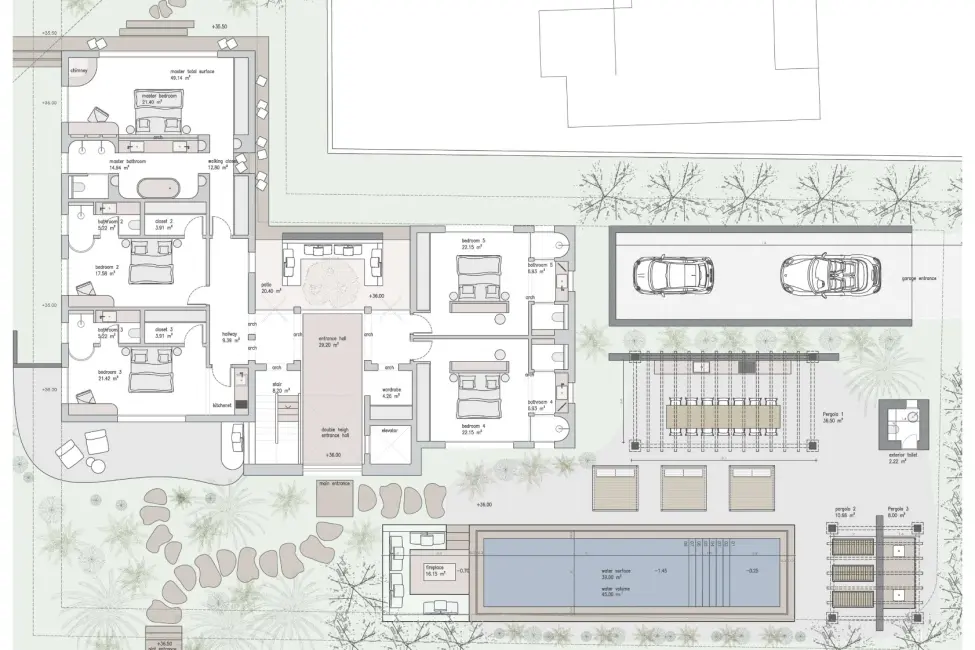 Der Außenbereich präsentiert sich als tropische Gartenlandschaft mit weitläufigem Poolbereich und integriertem Jacuzzi, die maximale Privatsphäre und Entspannung garantieren. Ergänzt wird dieses exklusive Angebot durch zahlreiche Annehmlichkeiten wie eine Outdoor-Bar mit Grillbereich und Feuerschale, einen stilvollen Weinkeller sowie einen luxuriösen Spa-Bereich mit Sauna und türkischem Bad.
