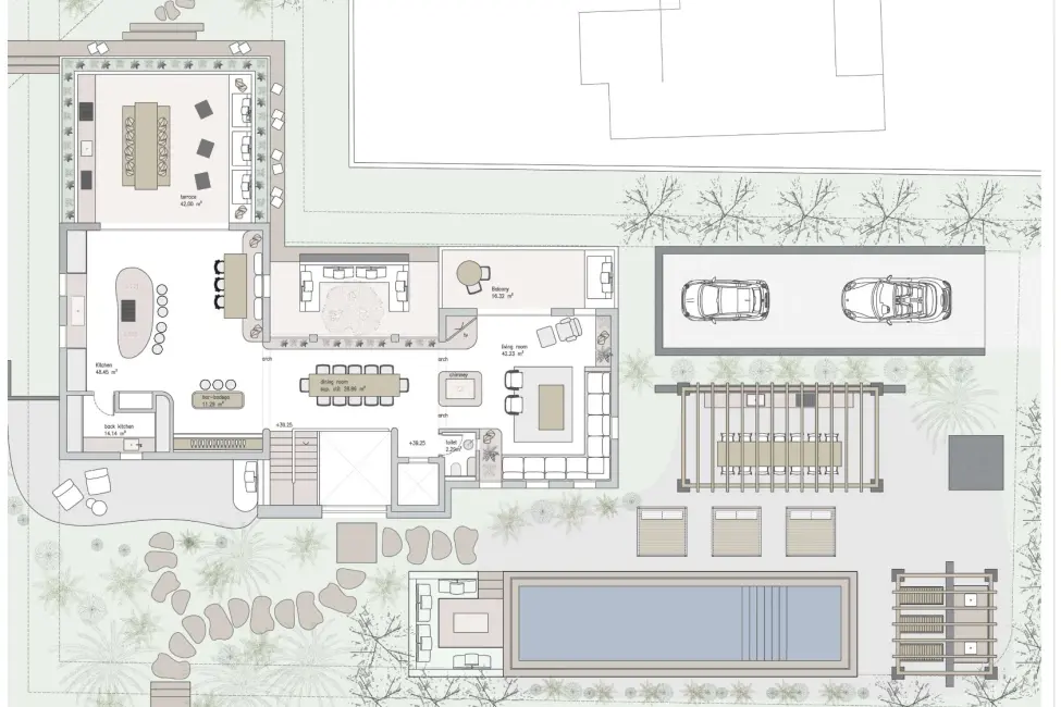 Charakteristische, weich geschwungene Formen von Fenstern, Türen und Durchgängen lassen das besondere Licht Mallorcas in alle Räume fließen und verleihen dem gesamten Interior eine warme, einladende Atmosphäre. Der durchdachte Grundriss kombiniert private Rückzugsorte mit großzügigen Gemeinschaftsbereichen, die sich um einen idyllischen Innenhof mit einem majestätischen Olivenbaum gruppieren – ein Ort der Ruhe und Begegnung zugleich.